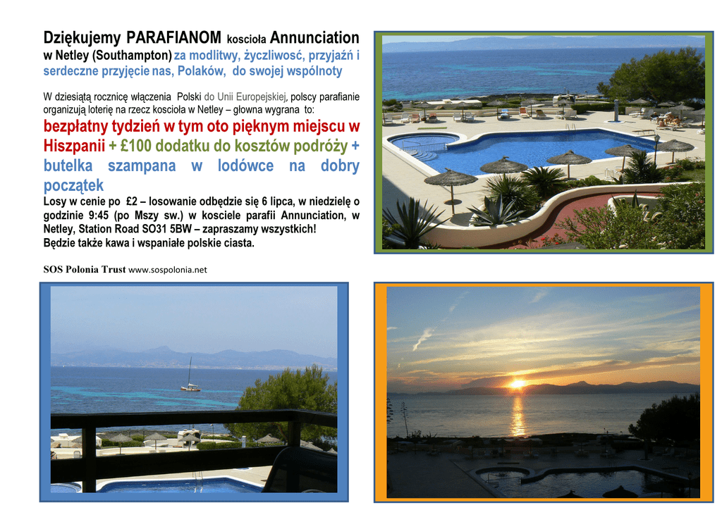 Dziękujemy PARAFIANOM koscioła Annunciation w Netley (Southampton) za modlitwy, życzliwosć, przyjaźń i serdeczne przyjęcie nas, Polaków, do swojej wspólnoty W dziesiątą rocznicę włączenia Polski do Unii Europejskiej, polscy parafianie organizują loterię na rzecz koscioła w Netley – głowna wygrana to: bezpłatny tydzień w tym oto pięknym miejscu w Hiszpanii + £100 dodatku do kosztów podróży + butelka szampana w lodówce na dobry początek Losy w cenie po £2 – losowanie odbędzie się 6 lipca, w niedzielę o godzinie 9:45 (po Mszy sw.) w kosciele parafii Annunciation, w Netley, Station Road SO31 5BW – zapraszamy wszystkich! Będzie także kawa i wspaniałe polskie ciasta. SOS Polonia Trust www.sospolonia.net