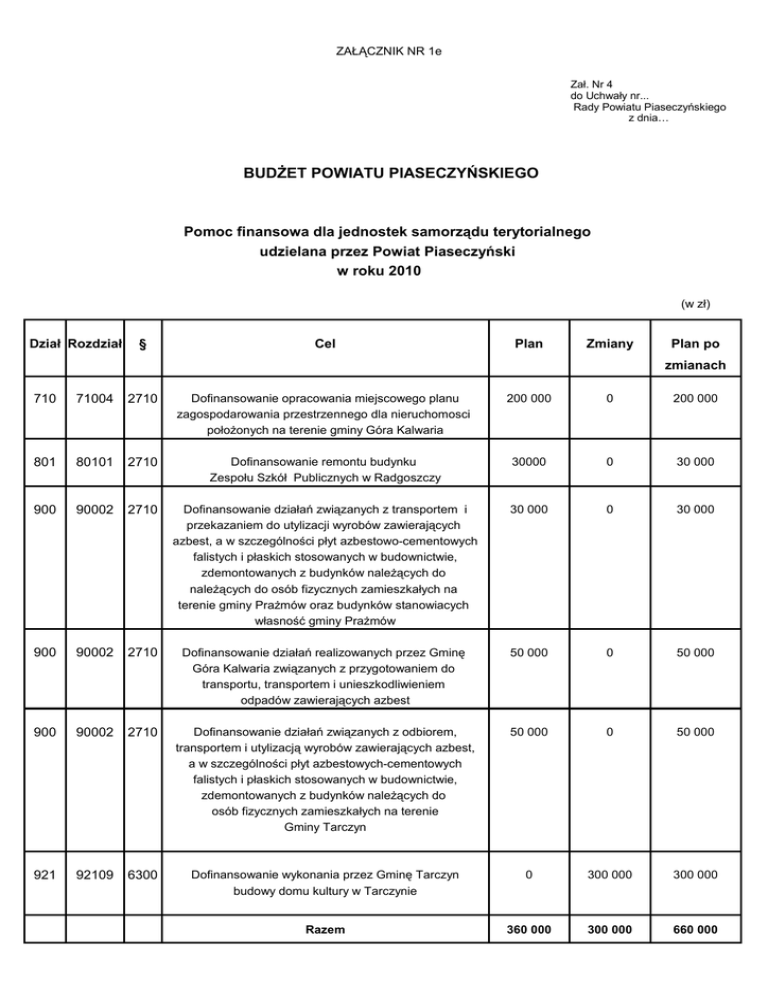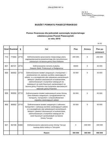 ZAŁĄCZNIK NR 1e Zał. Nr 4 do Uchwały nr... Rady Powiatu Piaseczyńskiego z dnia… BUDŻET POWIATU PIASECZYŃSKIEGO Pomoc finansowa dla jednostek samorządu terytorialnego udzielana przez Powiat Piaseczyński w roku 2010 (w zł) Dział Rozdział § Cel Plan Zmiany Plan po zmianach 710 71004 2710 Dofinansowanie opracowania miejscowego planu zagospodarowania przestrzennego dla nieruchomosci położonych na terenie gminy Góra Kalwaria 200 000 0 200 000 801 80101 2710 Dofinansowanie remontu budynku Zespołu Szkół Publicznych w Radgoszczy 30000 0 30 000 900 90002 2710 Dofinansowanie działań związanych z transportem i przekazaniem do utylizacji wyrobów zawierających azbest, a w szczególności płyt azbestowo-cementowych falistych i płaskich stosowanych w budownictwie, zdemontowanych z budynków należących do należących do osób fizycznych zamieszkałych na terenie gminy Prażmów oraz budynków stanowiacych własność gminy Prażmów 30 000 0 30 000 900 90002 2710 Dofinansowanie działań realizowanych przez Gminę Góra Kalwaria związanych z przygotowaniem do transportu, transportem i unieszkodliwieniem odpadów zawierających azbest 50 000 0 50 000 900 90002 2710 Dofinansowanie działań związanych z odbiorem, transportem i utylizacją wyrobów zawierających azbest, a w szczególności płyt azbestowych-cementowych falistych i płaskich stosowanych w budownictwie, zdemontowanych z budynków należących do osób fizycznych zamieszkałych na terenie Gminy Tarczyn 50 000 0 50 000 921 92109 6300 Dofinansowanie wykonania przez Gminę Tarczyn budowy domu kultury w Tarczynie 0 300 000 300 000 Razem 360 000 300 000 660 000