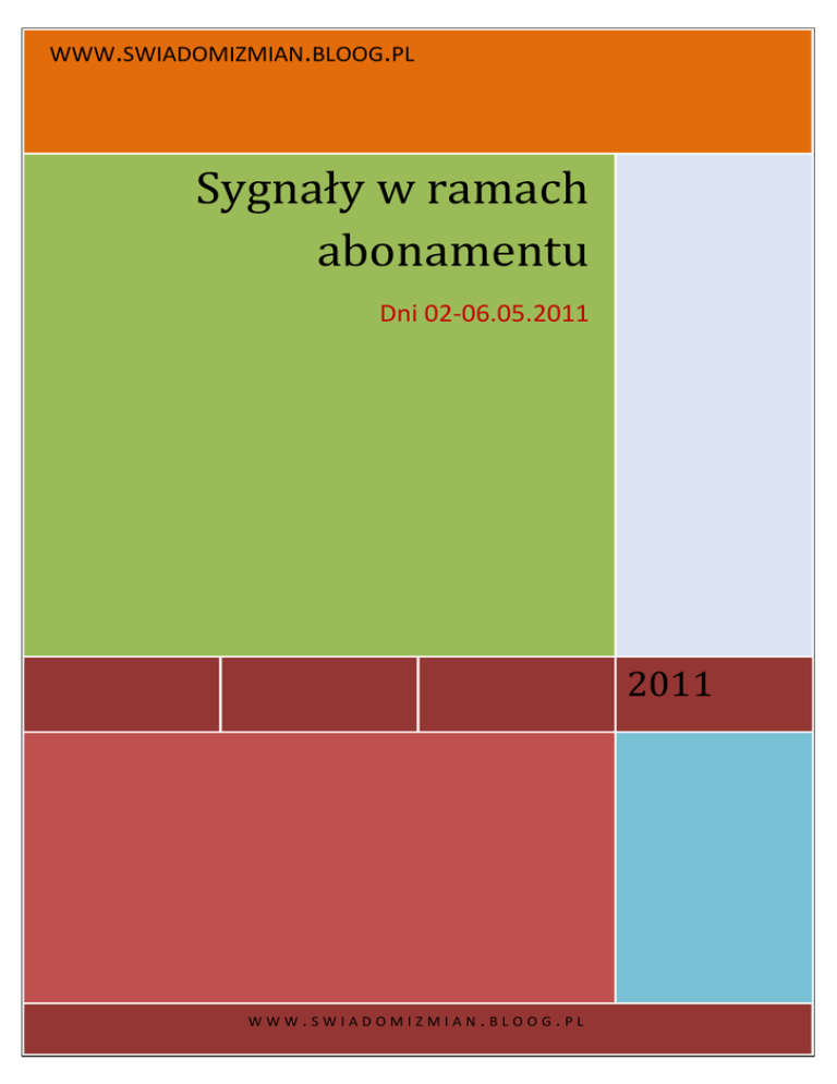 WWW.SWIADOMIZMIAN.BLOOG.PL Sygnały w ramach abonamentu Dni 02-06.05.2011 [WPISZ NAZWĘ FIRMY] SYGNAŁY W RAMACH ABONAMENTU 2011 Dni 18-21.04.2011 | KONRAD WWW.SWIADOMIZMIAN.BLOOG.PL Sygnały w ramach abonamentu (na dni 02-06.05.2011) www.swiadomizmian.bloog.pl© www.swiadomizmian.bloog.pl Strona 2 Podsumowanie zeszłotygodniowych sygnałów Nie wydarzyło się nic specjalnego, co może niepokoić obie strony barykady. Po tygodniu jesteśmy niemal w tym samym miejscu. Sprawdzalność sygnałów była całkiem niezła, ale przy tak niewielkich wahaniach nie można mówić o sukcesie. Większość rynków bije rekordy hossy, a u nas panuje niepokojący marazm. Rośnie nieustannie LOP, co może sugerować nadciągające rozstrzygnięcia. Sygnał z 20.04.2011 trzymał cały tydzień indeksy na wodzy. Jakby chciał powiedzieć: „hej, nie zapominajcie o mnie. Jestem silny i nie powiedziałem jeszcze ostatniego słowa.” Jego czas chyba jednak minął, choć wydźwięk sesji piątkowej jest mimo wszystko negatywny. * * * W piątek spotkały się ze sobą dwa sprzeczne sygnały. Pierwszy wskazuje na kontynuację spadków, drugi nakazywał kontrować zamknięcie. W pierwszym przypadku stop loss ustawiam z reguły na 30 pkt., w drugim czekam na potwierdzenie ruchu zamknięciem kolejnej sesji. Jeżeli zatem poniedziałkowe zamknięcie będzie dodatnie, powinienem przychylić się do wzrostów. Nie lubię takich sytuacji, ale cóż począć. Z uwagi na kolejną przerwę najprawdopodobniej zamknę pozycje. Prognoza na 02.05.2011 jest taka: 07.02.2008 (centralne obrączkowe zaćmienie Słońca), 3:55 * +F03=19.03.2008/23:07/ostatecznie lekkie wzrosty, ale o wiele lepiej na spadkach, na kolejnej sesji -DRC +F05=13.04.2008 +F07=23.05.2008 * +F09=28.07.2008/lekkie wzrosty, -DRC w sesji na kolejnej sesji +F11=11.11.2008/ +F13=02.05.2009/ +F15=05.02.2010,13:31/pierwsze z formacji 2 x dno +F17=02.05.2011,06:19/16:53/wzrosty? www.swiadomizmian.bloog.pl Strona 3 Zdecydowanie przeważają sesje spadkowe. Oznaczone gwiazdką (więc najbardziej nas interesujące) były bardzo zmienne i takiej sesji spodziewałbym się 02.05.2011, gdyby nie kolejna przerwa świąteczna. Trudno wyrokować. Obie strony będą chciały zapewne zachować status quo. Mimo wszystko, jest to kolejny potencjalny sygnał zmiany trendu (sygnały zaćmień obrączkowych najczęściej towarzyszą zmianie trendu). Od tygodnia coś wisi w powietrzu, a mimo to nic się nie dzieje. dno : 07.02.2008,14:30 [2908 pkt.] *+F03=20.03.2008,09:41/otw=-45,min=-51,max=+10,zamkn=-36 +F04=29.03.2008,16:53/brak +F05=13.04.2008,14:30/brak +F06=01.05.2008,02:29/brak +F07=24.05.2008,02:29/brak +F08=21.06.2008,21:41/brak *+F09=28.07.2008,19:17/otw=-2,min=-19,max=+18,zamkn=+8/przed szczytem +F10=13.09.2008,14:30/brak +F11=12.11.2008,04:53/-BDRC/otw=-31,min=zamkn=-190,max=-18 +F12=27.01.2009,00:05/-BDRC/otw=0,min=zamkn=-83,max=+9 +F13=03.05.2009,09:41/brak +F14=03.09.2009,00:05/otw=+12,min=-17,max=+30,zamkn=-13 +F15=06.02.2010,00:05/brak +F16=23.08.2010,07:17/otw=0,min=-4,max=+35,zamkn=+33 +F17=02.05.2011,16:53 Jest to bardzo ciekawe spotkanie dwóch sygnałów. Giełdowe historyczne dno ma potwierdzenie swojej siły w obrączkowym zaćmieniu Słońca! Rzadki przypadek, dlatego warto przyjrzeć się mu nieco bliżej. Niestety, nie jest to łatwe z uwagi na „pechową” historię tej prognozy. Na 15 dni, w które przypadały jej sygnały, sesje odbyły się tylko podczas sześciu z nich. Kiedy zawęzimy sygnały do grona tylko spirali nieparzystej, mamy do dyspozycji jedynie trzy dni sesyjne. www.swiadomizmian.bloog.pl Strona 4 Do aktualnego sygnału najbardziej pasują te z 20.03.2008 oraz 28.07.2008. Były to bardzo zmienne sesje, po których następowały mocne ruchy wzrostowe, w tym jeden szczyt. Trend jest ewidentnie boczny, zatem liczymy na wybicie. W którą stronę? Tu widać szansę na wyskok ku nowym szczytom. Przyjrzyjmy się jednak pozostałym prognozom. 05.05.2011 Spirala wsteczna/[15.06.2011], 20:14/ZAĆMIENIE CAŁKOWITE KSIĘŻYCA -F19=21.02.2006,08:14/spadki -F17=22.03.2008/ -F15=16.06.2009,10:38/spadki*, -DRC na kolejnej sesji -F14=19.11.2009,10:38/*spadki DRC w sesji/ -F13=22.03.2010,01:03/ -F11=10.09.2010,05:51/spadki -F09=26.12.2010 -F07=01.03.2011,08:14/spadki po wysokim otw. -F05=10.04.2011/brak -F03=05.05.2011,01:02/spadki? [10.12.2011],14:31/zaćmienie całkowite KSIĘŻYCA -F21=26.06.2003,00:07/*bez zmian -F20=16.04.2005/brak -F18=31.10.2007,12:07/lekkie spadki, przed gwałtowną przeceną -F16=26.05.2009,21:43/ostatecznie lekkie wzrosty www.swiadomizmian.bloog.pl Strona 5 -F14=16.05.2010,04:56/brak -F13=15.09.2010,19:20/*bez zmian/ -F12=21.12.2010,04:56/wzrosty/szczyt! -F10=05.05.2011,14:31/ Zaćmienie półcieniowe KSIĘŻYCA[28.11.2012],14:37 -F20=05.04.2006,17:01/spadki -F19=07.09.2007,02:37/-DRC -F18=19.10.2008,12:14/+BDRC* -F17=05.09.2009,12:14/brak -F16=15.05.2010,21:50/brak -F15=30.11.2010,05:01/Fw=wzrosty/*na W20 idealne dno! -F14=05.05.2011,14:37/? 31.07.2000 (częściowe zaćmienie Słońca), 2:13 +F06=22.10.2000/brak* +F08=13.12.2000/wzrosty +F09=19.01.2001,07:01/wzrosty!! +F10=07.03.2001/spadki/ +F12=20.07.2001/-DRC +F14=24.02.2002/brak +F16=13.02.2003/wzrosty +F18=09.09.2004/lekkie spadki +F20=25.03.2007/brak +F22=05.05.2011/02:13/minimum na początku sesji!? www.swiadomizmian.bloog.pl Strona 6 Kumulacja kilku sygnałów, z których najmocniejszym wydaje się być ten, który pochodzi z częściowego zaćmienia Słońca. Jest to jednak tylko założenie, ponieważ owe zaćmienie już miało miejsce. Zatem, skoro już się wydarzyło, to ma większe znaczenie od tego, czego jeszcze nie doświadczyliśmy. Nowa metoda w zależności od sygnału, wskazuje bądź wzrosty, bądź spadki (przeważają jednak spadki). Pozostałe pomocnicze sygnały są wyjątkowo pro spadkowe. Z kolei na 10 ostatnich tego rodzaju przypadków, 9 razy bardziej opłacalna była gra przeciw otwarciu! Wygląda na to, że postawię tego dnia na spadki 