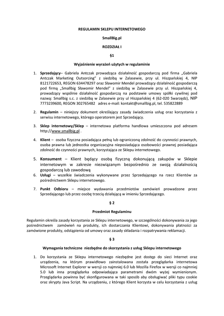 REGULAMIN SKLEPU INTERNETOWEGO SmallBig.pl ROZDZIAŁ I §1 Wyjaśnienie wyrażeń użytych w regulaminie 1. Sprzedający– Gabriela Antczak prowadząca działalność gospodarczą pod firma „Gabriela Antczak Marketing Outsorcing” z siedzibą w Zalasewie, przy ul. Hiszpańskiej 4, NIP 8121722653, REGON 634478297 oraz Sławomir Mendel prowadzący działalność gospodarczą pod firmą „Smallbig Sławomir Mendel” z siedzibą w Zalasewie przy ul. Hiszpańskiej 4, prowadzący wspólnie działalność gospodarczą na podstawie umowy spółki cywilnej pod nazwą: Smallbig s.c. z siedzibą w Zalasewie przy ul Hiszpańskiej 4 (62-020 Swarzędz), NIP 7773239600, REGON 302765482 adres e-mail: [email protected], tel. 535822889 2. Regulamin – niniejszy dokument określający zasady świadczenia usług oraz korzystania z serwisu internetowego, którego operatorem jest Sprzedający. 3. Sklep internetowy/Sklep – internetowa platforma handlowa umieszczona pod adresem http://www.smallbig.pl . 4. Klient – osoba fizyczna posiadająca pełną lub ograniczoną zdolność do czynności prawnych, osoba prawna lub jednostka organizacyjna nieposiadająca osobowości prawnej posiadająca zdolność do czynności prawnych, korzystająca ze Sklepu internetowego. 5. Konsument – Klient będący osobą fizyczną dokonującą zakupów w Sklepie internetowym w zakresie niezwiązanym bezpośrednio ze swoją działalnością gospodarczą lub zawodową 6. Usługi – wszelkie świadczenia wykonywane przez Sprzedającego na rzecz Klientów za pośrednictwem Sklepu internetowego. 7. Punkt Odbioru – miejsce wydawania przedmiotów zamówień prowadzone przez Sprzedającego lub przez osobę trzecią działającą w imieniu Sprzedającego. §2 Przedmiot Regulaminu Regulamin określa zasady korzystania ze Sklepu internetowego, w szczególności dokonywania za jego pośrednictwem zamówień na produkty, ich dostarczania Klientowi, dokonywania płatności za zamówione produkty, odstąpienia od umowy oraz zasady składania i rozpatrywania reklamacji. §3 Wymagania techniczne niezbędne do skorzystania z usług Sklepu internetowego 1. Do korzystania ze Sklepu internetowego niezbędne jest dostęp do sieci Internet oraz urządzenia, na którym prawidłowo zainstalowana została przeglądarka internetowa Microsoft Internet Explorer w wersji co najmniej 6.0 lub Mozilla Firefox w wersji co najmniej 5.0 lub inna przeglądarka odpowiadająca parametrami dwóm wyżej wymienionym. Przeglądarka powinna być skonfigurowana w taki sposób aby obsługiwać pliki typu cookie oraz skrypty Java Script. Na urządzeniu, z którego Klient korzysta w celu korzystania z usług Sklepu internetowego powinno być zainstalowane oprogramowanie Adobe Flash Player w wersji 9.0 lub nowszej. Klient powinien posiadać właściwie skonfigurowane i aktywne konto poczty elektronicznej. 2. W celu właściwego świadczenia Usług Sprzedający korzysta z plików cookie (informacji zapisywanych przez serwer na komputerze Klienta, które odczytywane są przy każdym połączeniu się przeglądarki internetowej). Wskazane pliki są niezbędne do właściwego świadczenia usług przez Sprzedającego. Pliki cookies mogą być w każdym czasie usunięte przez Klienta z pamięci jego komputera. Klient może także w dowolnym momencie zmienić ustawienia przeglądarki, by nie akceptowała takich plików, może to jednak spowodować utrudnienia w korzystaniu z Serwisu. §4 Postanowienia ogólne 1. Klient może bezpłatnie pobrać niniejszy Regulamin, a także utrwalić go i odtworzyć. 2. Klientowi zakazane jest dostarczanie treści o charakterze bezprawnym, obraźliwym lub wulgarnym. Klient zobowiązany jest do powstrzymania się od ingerowania w zawartość Sklepu internetowego oraz podejmowania jakichkolwiek innych działań, które mogłyby wpłynąć na prawidłowe działanie Sklepu internetowego. 3. Klient uprawniony jest do korzystania ze Sklepu internetowego zgodnie z jego przeznaczeniem. 4. Kontakt ze Sprzedającym można uzyskać: pod numerem telefonu 535822889korzystając z formularza kontaktowego na stronie internetowej pod adresem: http://www.smallbig.pl/kontakt kierując korespondencję na adres wskazany w § 1 ust. 1, wysyłając wiadomość e-mail na adres [email protected] §5 Produkty oraz ceny 1. Wszystkie ceny produktów umieszczane są na stronie internetowej sklepu. Ceny podawane są w złotych polskich i zawierają podatek VAT. 2. Ceną wiążącą jest cena towaru podana na stronie Sklepu internetowego w chwili składania zamówienia przez Klienta. 3. Podane ceny nie obejmują kosztów dostawy. Koszty dostawy podawane są w trakcie składania zamówienia przez Klienta i zależą od wyboru sposobu dostawy oraz wielkości zamówienia. Całkowity koszt zamówienia, na który składają się cena produktów oraz koszty dostawy, wskazany jest przed złożeniem zamówienia. 4. Informacje o produktach umieszczone na stronach Sklepu internetowego nie stanowią ofert, lecz są jedynie zaproszeniem do zawarcia umowy w rozumieniu art. 71 Kodeksu cywilnego. 5. Sprzedający może prowadzić akcje promocyjne oraz wyprzedaże. Promocje nie podlegają łączeniu, chyba, że co innego wynika z regulaminu danej promocji. §6 Składanie zamówień 1. Informacje o produktach oraz usługach dostępnych w ofercie Sklepu, stanowią zaproszenie do zawarcia umowy w rozumieniu art. 71 ustawy z dnia 23 kwietnia 1964 r. Kodeks cywilny. 2. Aby złożyć zamówienie Klient powinien wybrać produkt i wybrać polecenie „dodaj do koszyka” następnie powrócić do wybierania kolejnych produktów poprzez wybranie polecenia „Chcę kontynuować zakupy” albo przejść do finalizacji zamówienia poprzez wybór polecenia „Chcę przejść do koszyka” (Klient może też kontynuować zakupy po wyborze polecenia „Chcę kontynuować zakupy”). 3. W kolejnym kroku Klient powinien wybrać żądane cechy wybranego produktu. 4. Następnie Klient powinien podać swoje 