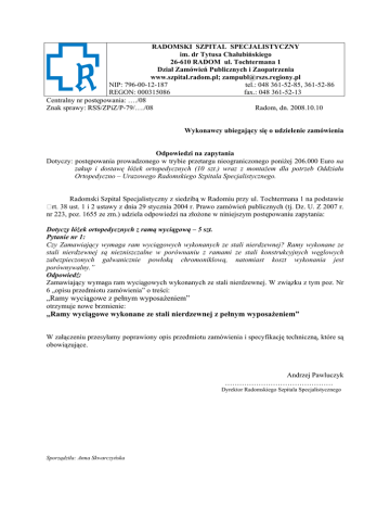RADOMSKI SZPITAL SPECJALISTYCZNY im. dr Tytusa Chałubińskiego 26-610 RADOM ul. Tochtermana 1 Dział Zamówień Publicznych i Zaopatrzenia www.szpital.radom.pl; [email protected] NIP: 796-00-12-187 tel.: 048 361-52-85, 361-52-86 REGON: 000315086 fax.: 048 361-52-13 Centralny nr postępowania: …./08 Znak sprawy: RSS/ZPiZ/P-79/…./08 Radom, dn. 2008.10.10 Wykonawcy ubiegający się o udzielenie zamówienia Odpowiedzi na zapytania Dotyczy: postępowania prowadzonego w trybie przetargu nieograniczonego poniżej 206.000 Euro na zakup i dostawę łóżek ortopedycznych (10 szt.) wraz z montażem dla potrzeb Oddziału Ortopedyczno – Urazowego Radomskiego Szpitala Specjalistycznego. Radomski Szpital Specjalistyczny z siedzibą w Radomiu przy ul. Tochtermana 1 na podstawie rt. 38 ust. 1 i 2 ustawy z dnia 29 stycznia 2004 r. Prawo zamówień publicznych (tj. Dz. U. Z 2007 r. nr 223, poz. 1655 ze zm.) udziela odpowiedzi na złożone w niniejszym postępowaniu zapytania: Dotyczy łóżek ortopedycznych z ramą wyciągową – 5 szt. Pytanie nr 1: Czy Zamawiający wymaga ram wyciągowych wykonanych ze stali nierdzewnej? Ramy wykonane ze stali nierdzewnej są niezniszczalne w porównaniu z ramami ze stali konstrukcyjnych węglowych zabezpieczonych galwanicznie powłoką chromoniklową, natomiast koszt wykonania jest porównywalny.” Odpowiedź: Zamawiający wymaga ram wyciągowych wykonanych ze stali nierdzewnej. W związku z tym poz. Nr 6 „opisu przedmiotu zamówienia” o treści: „Ramy wyciągowe z pełnym wyposażeniem” otrzymuje nowe brzmienie: „Ramy wyciągowe wykonane ze stali nierdzewnej z pełnym wyposażeniem” W załączeniu przesyłamy poprawiony opis przedmiotu zamówienia i specyfikację techniczną, które są obowiązujące. Andrzej Pawluczyk ……………………………………… Dyrektor Radomskiego Szpitala Specjalistycznego Sporządziła: Anna Skwarczyńska ROZDZIAŁ II OPIS PRZEDMIOTU ZAMÓWIENIA ŁÓŻKA ORTOPEDYCZNE Łóżka ortopedyczne na salę pooperacyjną – 5 szt. Lp. Parametry wymagane 1. Możliwość regulacji oparcia pleców, segmentu nóg, przechyłów, pozycja Trendelenburga i anty-Trendelenburga, wspomagana sprężynami gazowymi z blokadą (dopuszcza się łóżka bez przechyłów bocznych) 2. 3. 4. 5. 6. 7. 8. 9. 10. Zmiana wysokości leża za pomocą nożnej pompki hydraulicznej Łóżko łamane na trzy elementy z dostosowanym materacem (z pianki, pokrytym materiałem odpornym na środki dezynfekcyjne i nieprzepuszczalnym) Leże łóżka przepuszczalne dla promieni RTG Wyposażone w boczne poręcze wyjmowane, wieszak na kroplówki, wysięgnik z uchwytem ręki, Duże kółka jezdne z centralną blokadą kół Podwozie łóżka wykonane z profili stalowych Długość łóżka 2120-2140 mm Szerokość nie więcej niż 965 mm (z całym wyposażeniem) Maksymalne obciążenie robocze na poziomie 230 kg Łóżka ortopedyczne z ramą wyciągową – 5 szt. Lp. Parametry wymagane 1. Możliwość regulacji oparcia pleców, segmentu nóg, przechyłów, pozycja Trendelenburga i anty-Trendelenburga, wspomagana sprężynami gazowymi z blokadą (dopuszcza się łóżka bez przechyłów bocznych) 2. 3. Zmiana wysokości leża za pomocą nożnej pompki hydraulicznej Łóżko łamane na trzy elementy z dostosowanym materacem (z pianki, pokrytym materiałem odpornym na środki dezynfekcyjne i nieprzepuszczalnym) 4. 5. 6. 7. 8. 9. 10. Leże łóżka przepuszczalne dla promieni RTG Boczne poręcze wyjmowane, wieszak na kroplówki, uchwyt rąk, podpórka ręki Ramy wyciągowe wykonane ze stali nierdzewnej z pełnym wyposażeniem Duże kółka jezdne z blokadą na każde kółko Długość lóżka 2120-2140 mm Szerokość nie więcej niż 965 mm (z całym wyposażeniem) Maksymalne obciążenie robocze na poziomie 230 kg Załącznik Nr 1 do oferty SPECYFIKACJA TECHNICZNA Producent …………………………………………………………………………………………….. Kraj:...................................................................................................................................................... Nazwa aparatu, typ, model …………………………………………………………………………… Rok produkcji, wymagany 2008, fabrycznie nowy, model ŁÓŻKA ORTOPEDYCZNE Lp. 1. 2. 3. 4. 5. 6. 7. 8. 9. 10. Lp. 1. 2. 3. 4. 5. Łóżka ortopedyczne na salę pooperacyjną – 5 szt. Parametry wymagane Parametry oferowane Możliwość regulacji oparcia pleców, segmentu nóg, przechyłów, pozycja Trendelenburga i anty-Trendelenburga, wspomagana sprężynami gazowymi z blokadą (dopuszcza się łóżka bez przechyłów bocznych) Zmiana wysokości leża za pomocą nożnej pompki hydraulicznej Łóżko łamane na trzy elementy z dostosowanym materacem (z pianki, pokrytym materiałem odpornym na środki dezynfekcyjne i nieprzepuszczalnym) Leże łóżka przepuszczalne dla promieni RTG Wyposażone w boczne poręcze wyjmowane, wieszak na kroplówki, wysięgnik z uchwytem ręki, Duże kółka jezdne z centralną blokadą kół Podwozie łóżka wykonane z profili stalowych Długość łóżka 2120-2140 mm Szerokość nie więcej niż 965 mm (z całym wyposażeniem Maksymalne obciążenie robocze na poziomie 230 kg Łóżka ortopedyczne z ramą wyciągową – 5 szt. Parametry wymagane Parametry oferowane Możliwość regulacji oparcia pleców, segmentu nóg, przechyłów, pozycja Trendelenburga i anty-Trendelenburga, wspomagana sprężynami gazowymi z blokadą (dopuszcza się łóżka bez przechyłów bocznych) Zmiana wysokości leża za pomocą nożnej pompki hydraulicznej Łóżko łamane na trzy elementy z dostosowanym materacem (z pianki, pokrytym materiałem odpornym na środki dezynfekcyjne i nieprzepuszczalnym) Leże łóżka przepuszczalne dla promieni RTG Boczne poręcze (wyjmowane0, wieszak na kroplówki, uchwyt rąk, podpórka ręki 6. Ramy wyciągowe wykonane ze stali nierdzewnej z pełnym wyposażeniem 7. 8. 