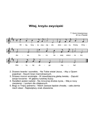 Witaj, krzyŜu zwycięski # & # c œ # & # ˙ stu # & # œ Zdo œ œ Wi - taj, - - j j œ œ ˙ ˙ krzy - Ŝu zwy - cię - ski, œ ˙ sa, j œ j œ by T: Hymn brewiarzowy M: ks.I.Pawlak - tej Ce - œ Je - œ œ no na œ go j j œ œ œ œ zbro - czo - ny j œ - szej ˙ mę j œ Krwią Chry - ˙ wiecz - no - œ - ˙ ką! 2. Drzewo twarde i szorstkie, - Na Tobie wisiał Jezus, - Aby z Ojcem pojednać - Swych braci marnotrawnych. 3. Drzewo mocno wrośnięte - W niewdzięczną glebę świata, - Zapuść swoje korzenie - W głębiny ludzkiej duszy. 4. Światłem jesteś nadziei - Na mrocznej drodze Ŝycia, - Siłą w nocy cierpienia - I portem dla zbłąkanych. 5. Bogu w Trójcy jednemu - Niech zawsze będzie chwała; - cała ziemia niech sławi - Najświętszy znak zbawienia. ˙ ści,