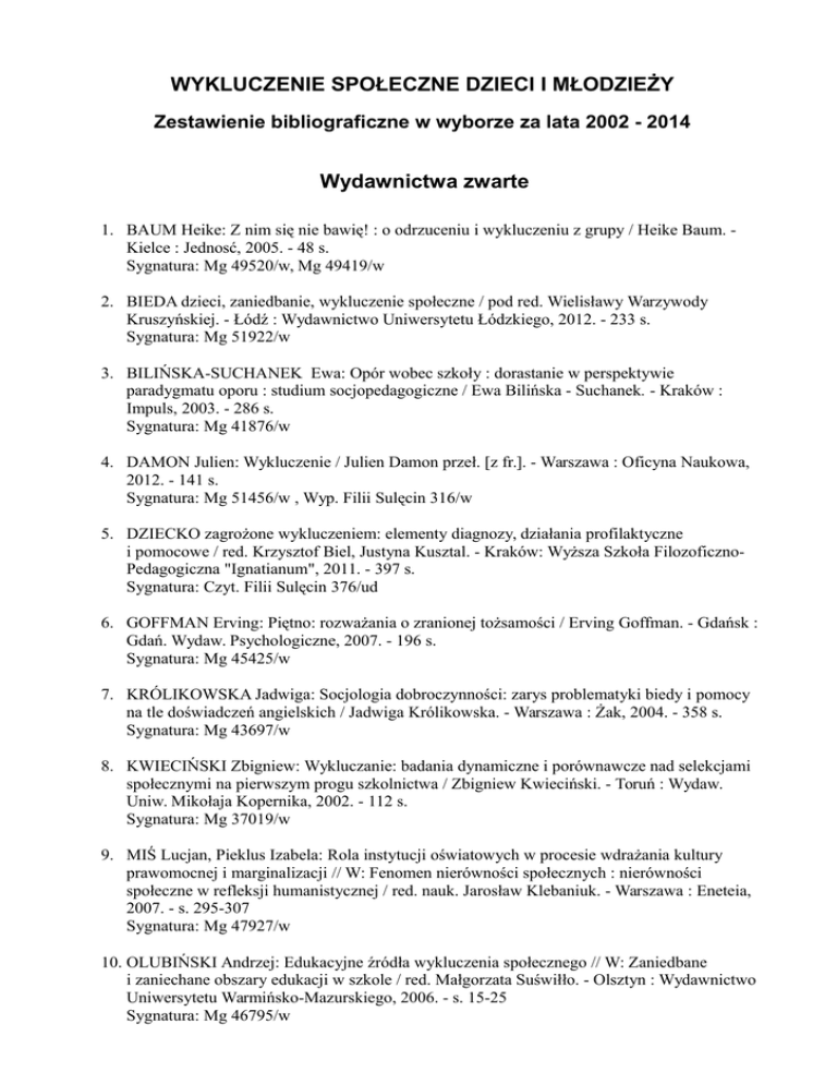 WYKLUCZENIE SPOŁECZNE DZIECI I MŁODZIEŻY Zestawienie bibliograficzne w wyborze za lata 2002 - 2014 Wydawnictwa zwarte 1. BAUM Heike: Z nim się nie bawię! : o odrzuceniu i wykluczeniu z grupy / Heike Baum. Kielce : Jednosć, 2005. - 48 s. Sygnatura: Mg 49520/w, Mg 49419/w 2. BIEDA dzieci, zaniedbanie, wykluczenie społeczne / pod red. Wielisławy Warzywody Kruszyńskiej. - Łódź : Wydawnictwo Uniwersytetu Łódzkiego, 2012. - 233 s. Sygnatura: Mg 51922/w 3. BILIŃSKA-SUCHANEK Ewa: Opór wobec szkoły : dorastanie w perspektywie paradygmatu oporu : studium socjopedagogiczne / Ewa Bilińska - Suchanek. - Kraków : Impuls, 2003. - 286 s. Sygnatura: Mg 41876/w 4. DAMON Julien: Wykluczenie / Julien Damon przeł. [z fr.]. - Warszawa : Oficyna Naukowa, 2012. - 141 s. Sygnatura: Mg 51456/w , Wyp. Filii Sulęcin 316/w 5. DZIECKO zagrożone wykluczeniem: elementy diagnozy, działania profilaktyczne i pomocowe / red. Krzysztof Biel, Justyna Kusztal. - Kraków: Wyższa Szkoła FilozoficznoPedagogiczna "Ignatianum", 2011. - 397 s. Sygnatura: Czyt. Filii Sulęcin 376/ud 6. GOFFMAN Erving: Piętno: rozważania o zranionej tożsamości / Erving Goffman. - Gdańsk : Gdań. Wydaw. Psychologiczne, 2007. - 196 s. Sygnatura: Mg 45425/w 7. KRÓLIKOWSKA Jadwiga: Socjologia dobroczynności: zarys problematyki biedy i pomocy na tle doświadczeń angielskich / Jadwiga Królikowska. - Warszawa : Żak, 2004. - 358 s. Sygnatura: Mg 43697/w 8. KWIECIŃSKI Zbigniew: Wykluczanie: badania dynamiczne i porównawcze nad selekcjami społecznymi na pierwszym progu szkolnictwa / Zbigniew Kwieciński. - Toruń : Wydaw. Uniw. Mikołaja Kopernika, 2002. - 112 s. Sygnatura: Mg 37019/w 9. MIŚ Lucjan, Pieklus Izabela: Rola instytucji oświatowych w procesie wdrażania kultury prawomocnej i marginalizacji // W: Fenomen nierówności społecznych : nierówności społeczne w refleksji humanistycznej / red. nauk. Jarosław Klebaniuk. - Warszawa : Eneteia, 2007. - s. 295-307 Sygnatura: Mg 47927/w 10. OLUBIŃSKI Andrzej: Edukacyjne źródła wykluczenia społecznego // W: Zaniedbane i zaniechane obszary edukacji w szkole / red. Małgorzata Suświłło. - Olsztyn : Wydawnictwo Uniwersytetu Warmińsko-Mazurskiego, 2006. - s. 15-25 Sygnatura: Mg 46795/w 11. OPIEKA i wsparcie w obszarze wykluczenia społecznego: materiały pokonferencyjne / red. Anna Napadło. - Żary : Wydawnictwo "Monogram", 2009. - 136 s. Sygnatura: Mg 52678/w 12. PORADNICTWO zawodowe dla osób z grupy szczególnego ryzyka : wybrane aspekty / red.nauk. Daniel Kukla, Łukasz Bednarczyk. - Warszawa : Difin, 2010. - 318 s. Sygnatura: Mg 49752/w 13. POSPISZYL Irena: Patologie społeczne / Irena Pospiszyl. - Warszawa : Wydaw. Naukowe PWN, 2009. - 362 s. Sygnatura: Mg 49672/w, Mg 49672/w 14. PROGRAM Operacyjny Kapitał ludzki / [Ministerstwo Rozwoju Regionalnego]. Warszawa : MRR. Dep. Zarz. Eur. Funduszem Sołecznym, 2007. - 270 s. Sygnatura: Mg 50313/w 15. SPÓŁDZIELNIE socjalne: skuteczny mechanizm walki z wykluczeniem społecznym czy ślepa uliczka? : praca zbiorowa / pod red. Jacka Tittenbruna. - Poznań : NAKOM, 2010. 311 s. Sygnatura: Mg 51000/w 16. URBAN Bronisław: Agresja młodzieży i odrzucenie rówieśnicze / Bronisław Urban. Warszawa : Wydawnictwo Naukowe PWN, 2012. - 199, [1] s. Sygnatura: Mg 51904/w 17. W POSZUKIWANIU metody: aktywizacja zawodowa kobiet : adaptacja metody Szkoły Kofoeda / [koncepcja Sławomir Szymczak ; współprac. Jan Kosmowski]. - Poznań : Fundacja Familijny Poznań, 2013. - 127 s. Sygnatura: Mg 52367/w, Wyp. Filii Sulęcin 364/w 18. WYKLUCZENI: wymiar społeczny, materialny i etniczny / red. Maria Jarosz. - Warszawa : Inst. Studiów Politycznych Polskiej Akademii Nauk, 2008. - 326 s. Sygnatura: Mg 48295/w Artykuły z czasopism 1. BARSZCZ Iwona: Aktywizacja społeczna i zawodowa młodzieży zagrożonej wykluczeniem społecznym // Pedagogika Pracy. - 2005 T. 47, s. 76-84 2. BĘBAS Sylwester: Narkomania wśród młodzieży jako negatywne zjawisko społeczne // Wychowanie na co Dzień. - 2009 nr 10/11, s. 3-9 3. BORAWSKA- KALBARCZYK Katarzyna: Dydaktyczne strategie zapobiegania marginalizacji społecznej // Nowa Szkoła. - 2008 nr 7, s. 19-23 4. BRZOSTEK Dariusz: "Inny" edukacji czy "inna" edukacja"? // Polonistyka. - 2010 nr 4, s. 11-15 5. DEPTUŁA Maria: Dzieci odrzucane przez rówieśników. Cz. 1 // Remedium. - 2007 nr 4, s. 1-3 6. DOBROWOLSKA Małgorzata: Poradnictwo zawodowe w dobie integracji europejskiej : przeciwdziałanie marginalizacji społecznej i zawodowej // Chowanna. - 2004 T. 2, s. 33-41 7. DRZEWIECKI Marcin: Biblioteki szkolne i publiczne wobec zjawiska wykluczenia edukacyjnego // Bibliotekarz. - 2008 nr 12, s. 5-7 8. FALISZEK Krystyna: Bezrobocie i alkoholizm drogą do wykluczenia społecznego - praca socjalna szansą na drogę z powrotem? // Wychowanie na Co Dzień. - 2010 nr 10/11, s. 16-20 9. FRIESKE Kazimierz W.: Wykluczenie społeczne i reintegracja osób zażywających narkotyki // Serwis Informacyjny Narkomania. - 2003 nr 4, s. 38-47 10. GAŚ Zbigniew B.: Działania wychowawcze na rzecz młodzieży zagrożonej wykluczeniem społecznym // Problemy Opiekuńczo-Wychowawcze. - 2008 nr 4, s. 3-16 11. GOETZ Magdalena: Szkoła, która nie wyklucza // Głos Nauczycielski. - 2014 nr 19, s. 15 12. GOLINOWSKA Stanisława: Podatność młodzieży na ubóstwo i wykluczenie społeczne // Kultura i Społeczeństwo. - 2010 nr 3, s. 31-60 13. GRONDAS Marek, LICIŃSKI Marek: Dzieci bez przyszłości w szkole // Psychologia w Szkole. - 2008 nr 1, s. 3-8 14. JĘDRZEJKO Mariusz.: Edukacja jako metoda twórczej resocjalizacji // Pedagogika Społeczna. - 2007 nr 3, s. 111-120 15. KAWULA Stanisław: Aberracje psychospołeczne jako podstawa normalizacji jednostkowej i grupowej // Wychowanie na Co Dzień. - 2004 nr 9, s. 13-17 16. KORDZIŃSKI Jarosław: Żeby nie zatrzaskiwać bramy : [dotyczy wychowywania młodzieży trudnej w kontekście zapobiegania wykluczeniu społecznemu] // Dyrektor Szkoły. - 2006 nr 12, s. 19-21 17. KRUSZEWS