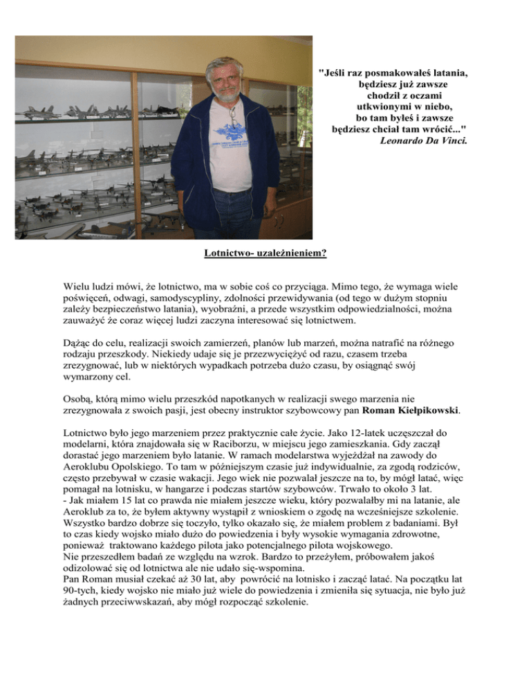 "Jeśli raz posmakowałeś latania, będziesz juŜ zawsze chodził z oczami utkwionymi w niebo, bo tam byłeś i zawsze będziesz chciał tam wrócić..." Leonardo Da Vinci. Lotnictwo- uzaleŜnieniem? Wielu ludzi mówi, Ŝe lotnictwo, ma w sobie coś co przyciąga. Mimo tego, Ŝe wymaga wiele poświęceń, odwagi, samodyscypliny, zdolności przewidywania (od tego w duŜym stopniu zaleŜy bezpieczeństwo latania), wyobraźni, a przede wszystkim odpowiedzialności, moŜna zauwaŜyć Ŝe coraz więcej ludzi zaczyna interesować się lotnictwem. DąŜąc do celu, realizacji swoich zamierzeń, planów lub marzeń, moŜna natrafić na róŜnego rodzaju przeszkody. Niekiedy udaje się je przezwycięŜyć od razu, czasem trzeba zrezygnować, lub w niektórych wypadkach potrzeba duŜo czasu, by osiągnąć swój wymarzony cel. Osobą, którą mimo wielu przeszkód napotkanych w realizacji swego marzenia nie zrezygnowała z swoich pasji, jest obecny instruktor szybowcowy pan Roman Kiełpikowski. Lotnictwo było jego marzeniem przez praktycznie całe Ŝycie. Jako 12-latek uczęszczał do modelarni, która znajdowała się w Raciborzu, w miejscu jego zamieszkania. Gdy zaczął dorastać jego marzeniem było latanie. W ramach modelarstwa wyjeŜdŜał na zawody do Aeroklubu Opolskiego. To tam w późniejszym czasie juŜ indywidualnie, za zgodą rodziców, często przebywał w czasie wakacji. Jego wiek nie pozwalał jeszcze na to, by mógł latać, więc pomagał na lotnisku, w hangarze i podczas startów szybowców. Trwało to około 3 lat. - Jak miałem 15 lat co prawda nie miałem jeszcze wieku, który pozwalałby mi na latanie, ale Aeroklub za to, Ŝe byłem aktywny wystąpił z wnioskiem o zgodę na wcześniejsze szkolenie. Wszystko bardzo dobrze się toczyło, tylko okazało się, Ŝe miałem problem z badaniami. Był to czas kiedy wojsko miało duŜo do powiedzenia i były wysokie wymagania zdrowotne, poniewaŜ traktowano kaŜdego pilota jako potencjalnego pilota wojskowego. Nie przeszedłem badań ze względu na wzrok. Bardzo to przeŜyłem, próbowałem jakoś odizolować się od lotnictwa ale nie udało się-wspomina. Pan Roman musiał czekać aŜ 30 lat, aby powrócić na lotnisko i zacząć latać. Na początku lat 90-tych, kiedy wojsko nie miało juŜ wiele do powiedzenia i zmieniła się sytuacja, nie było juŜ Ŝadnych przeciwwskazań, aby mógł rozpocząć szkolenie. W roku 1993 dowiedział się o moŜliwości przejścia szkolenia szybowcowego na lotnisku w Gotartowicach, a juŜ 1 maja 1994 roku stał członkiem Aeroklubu Rybnickiego Okręgu Węglowego, gdzie rozpoczął szkolenie podstawowe. Odbywało się ono nie w sposób skoszarowany jak jest obecnie, ale „dochodząco” czyli przez weekendy, a trwało ono aŜ do końca września. Szczególną datą dla pana Romana jest 15 sierpień 1964 rok, a dokładniej godzina 17:50, kiedy to po raz pierwszy wzbił się w powietrze na szybowcu „Bocianie”. Przebywał wtedy na lotnisku Aeroklubu Opolskiego, był to lot tzw. hangarowy. -Mój pierwszy lot był dla mnie wielkim przeŜyciem, bardzo długo oczekiwanym. Do dziś pamiętam dokładną datę. Pan Roman Kiełpikowski jest od 2 lat instruktorem szybowcowym. Jak mówi, wychodzi z załoŜenia, Ŝe lotnictwo samo z siebie wiąŜe się z pewnym ryzykiem, dlatego twierdzi, Ŝe tego ryzyka nie warto zwiększać, dlatego stara się latać maksymalnie bezpiecznie nie stwarzając sytuacji zagroŜenia i usiłuje przekazać to uczniom. Najsympatyczniejszym przeŜyciem dla niego był lot na Górze śar, kiedy to zdobył warunek dla Złotej Odznaki. Wielkim sukcesem było takŜe, jak powtarza, zdobycie uprawnień instruktorskich. Na swój pierwszy przelot czekał długo, o tym wydarzeniu mówi: -1,5 roku trwało, zanim zostałem wpuszczony na przelot do Srebrnej Odznaki, wtedy byłem jeszcze uczniem-pilotem. PrzyjeŜdŜałem z zamiarem, Ŝe dzisiaj polecę, a później okazywało się, Ŝe z jakiegoś powodu jest to nie moŜliwe. Takich sytuacji było kilkanaście. Czasem bywało tak, ze przyjeŜdŜałem, deklarowałem chęci lotu, ale nie czułem się zbyt pewnie. Jest to jednak pierwsze oderwanie się od lotniska, ogromne przeŜycie, większe niŜ pierwszy samodzielny lot. Obecnie uczy klasę lotniczą, odbywającą szkolenie na lotnisku w Gotartowicach. O swoich uczniach mówi: - Klasę lotniczą oceniam bardzo dobrze, wszyscy są chętni do latania. Podczas tego szkolenia mogłem zaobserwować jak zmieniają się ich postawy, poznają lotnictwo, latanie i obowiązki z tym związane, a takŜe jak szybko dorośleją. Jak mówi Pan Roman lotnictwo w jego wypadku bardzo angaŜuje. Jest to jego pasja, która zajmuje większość czasu. Monika Bobrzyk