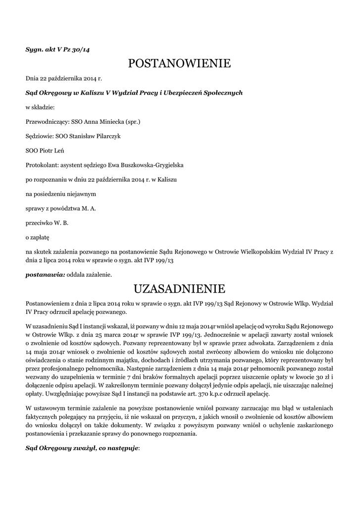 Sygn. akt V Pz 30/14 POSTANOWIENIE Dnia 22 października 2014 r. Sąd Okręgowy w Kaliszu V Wydział Pracy i Ubezpieczeń Społecznych w składzie: Przewodniczący: SSO Anna Miniecka (spr.) Sędziowie: SOO Stanisław Pilarczyk SOO Piotr Leń Protokolant: asystent sędziego Ewa Buszkowska-Grygielska po rozpoznaniu w dniu 22 października 2014 r. w Kaliszu na posiedzeniu niejawnym sprawy z powództwa M. A. przeciwko W. B. o zapłatę na skutek zażalenia pozwanego na postanowienie Sądu Rejonowego w Ostrowie Wielkopolskim Wydział IV Pracy z dnia 2 lipca 2014 roku w sprawie o sygn. akt IVP 199/13 postanawia: oddala zażalenie. UZASADNIENIE Postanowieniem z dnia 2 lipca 2014 roku w sprawie o sygn. akt IVP 199/13 Sąd Rejonowy w Ostrowie Wlkp. Wydział IV Pracy odrzucił apelację pozwanego. W uzasadnieniu Sąd I instancji wskazał, iż pozwany w dniu 12 maja 2014r wniósł apelację od wyroku Sądu Rejonowego w Ostrowie Wlkp. z dnia 25 marca 2014r w sprawie IVP 199/13. Jednocześnie w apelacji zawarty został wniosek o zwolnienie od kosztów sądowych. Pozwany reprezentowany był w sprawie przez adwokata. Zarządzeniem z dnia 14 maja 2014r wniosek o zwolnienie od kosztów sądowych został zwrócony albowiem do wniosku nie dołączono oświadczenia o stanie rodzinnym majątku, dochodach i źródłach utrzymania pozwanego, który reprezentowany był przez profesjonalnego pełnomocnika. Następnie zarządzeniem z dnia 14 maja 2014r pełnomocnik pozwanego został wezwany do uzupełnienia w terminie 7 dni braków formalnych apelacji poprzez uiszczenie opłaty w kwocie 30 zł i dołączenie odpisu apelacji. W zakreślonym terminie pozwany dołączył jedynie odpis apelacji, nie uiszczając należnej opłaty. Uwzględniając powyższe Sąd I instancji na podstawie art. 370 k.p.c odrzucił apelację. W ustawowym terminie zażalenie na powyższe postanowienie wniósł pozwany zarzucając mu błąd w ustaleniach faktycznych polegający na przyjęciu, iż nie wskazał on przyczyn, z jakich wnosił o zwolnienie od kosztów albowiem do wniosku dołączył on także dokumenty. W związku z powyższym pozwany wniósł o uchylenie zaskarżonego postanowienia i przekazanie sprawy do ponownego rozpoznania. Sąd Okręgowy zważył, co następuje: Zażalenie nie jest uzasadnione. Stosownie do treści art. 370 k. p. c. Sąd pierwszej instancji odrzuci na posiedzeniu niejawnym apelację wniesioną po upływie przepisanego terminu, nieopłaconą lub z innych przyczyn niedopuszczalną, jak również apelacje, której braków strona nie uzupełniła w wyznaczonym terminie. W razie stwierdzenia braków formalnych pisma procesowego zawierającego zażalenie strona zostanie wezwana do jego uzupełnienia lub poprawienia w wyznaczonym terminie (terminie sądowym) pod rygorem odrzucenia apelacji (art. 130 § 1 w zw. z art. 370 k.p.c.). Tygodniowy termin, określony w art. 130 § 1 k.p.c. (mającym zastosowanie przy niezachowaniu przez pismo procesowe warunków formalnych), jest terminem ustawowym, a co za tym idzie nie może być on przedłużany ani skracany. Bezskuteczny upływ terminu w przypadku środków odwoławczych skutkuje odrzuceniem pisma (por. Joanna Bodio, Tomasz Demendecki, Andrzej Jakubecki, Olimpia Marcewicz, Przemysław Telenga, Mariusz P. Wójcik „Kodeks postępowania cywilnego. Komentarz” Oficyna 2008). Zgodnie z treścią art. 102 ust.2 ustawy z dnia ustawy z dnia 28 lipca 2005 r o kosztach sądowych w sprawach cywilnych ( Dz. U. t.j. z 2014r poz. 1025) [ dalej. ustawa o kosztach] do wniosku o zwolnienie od kosztów sądowych powinno być dołączone oświadczenie obejmujące szczegółowe dane o stanie rodzinnym, majątku, dochodach i źródłach utrzymania osoby ubiegającej się o zwolnienie od kosztów. Oświadczenie sporządza się według ustalonego wzoru. Jeżeli oświadczenie nie zostało złożone albo nie zawiera wszystkich wymaganych danych, stosuje się art. 130 k. p.c. Wniosek o zwolnienie od kosztów strony reprezentowanej przez adwokata lub radcę prawnego złożony bez dołączenia oświadczenia, o którym mowa w ust. 2, przewodniczący zwraca bez wzywania o uzupełnienie braków formalnych wniosku o zwolnienie od kosztów sądowych ( art. 102 ust.4 ustawy o kosztach). W niniejszej sprawie Sąd I instancji prawidłowo przyjął, iż pozwany, który w toku postępowania jest reprezentowany przez profesjonalnego pełnomocnika będącego adwokatem miał obowiązek dołączenia do wniosku o zwolnienie od kosztów oświadczenia, o którym mowa w art. 102 ust.2 ustawy o kosztach. W sytuacji, gdy do wniosku pozwany nie dołączył oświadczenia Przewodniczący prawidłowo zwrócił wniosek na podstawie art. 102 ust. 4 ustawy o kosztach, który to przepis wprost przewiduje obowiązek zwrotu takiego wniosku. W świetle powyższego zarzut skarżącego co do błędu w ustaleniach faktycznych poczynionych przez Sąd I instancji polegający na przyjęciu, iż nie wskazał on przyczyn z jakich wnosił o zwolnienie od kosztów uznać należy za bezzasadny. Sąd Rejonowy doręczając odpis zarządzenia o zwrocie wniosku o zwolnienie od kosztów prawidłowo wezwał pozwanego do uzupełnienia, w terminie 7 dni, braków formalnych apelacji poprzez uiszczenie opłaty w wysokości 30 zł oraz dołączenie odpisu apelacji. Wezwanie to zostało skutecznie doręczone pełnomocnikowi pozwanego w dniu 27 maja 2014r. ( k.404). Ostateczny termin do uzupełnienia braków formalnych zażalenia upłynął w dniu 2 czerwca 2014 roku. Pozwany w wyznaczonym terminie nie uzupełnił wszystkich braków formalnych złożonego środka odwoławczego albowiem nie uiścił należnej opłaty podstawowej od apelacji w wysokości 30 złotych. Uwzględniając powyższe, Sąd Okręgowy uznał rozstrzygnięcie Sądu I instancji w przedmiocie odrzucenia apelacji pozwanego z uwagi na jego nieopłacenie za prawidłowe i na podstawie art. 385 k.p.c. w zw. z 397 § 2 k.p.c. orzekł jak w sentencji postanowienia.