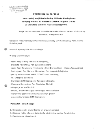 "~d a ~ "I"y I ias!a ~olieglo'tlY 42-350 KOl IEGl?WY ul. Pl. MoniUBzki 14 ..,..01. $Iaskie PROTOKOL Nr43/2010 uroczystej sesji Rady Gminy i Miasta Kozieglowy odbytej w dniu 13 kwietnia 2010 r. 0 godz. 14,00 w Urz~dzie Gminy i Miasta Kozieglowy. Sesja zostaia zwoiana dla oddania hoidu ofiarom katastrofy lotniczej samolotu Prezydenta RP. Obradom Przewodniczyia Przewodniczqca Rady GiM Koziegfowy Pani Joanna Kofodziejczyk. ProtOkOf sporzqdzifa: Urszula Dyja W sesji uczestniczyli: - radni Rady Gminy i Miasta Koziegiowy, - Starosta Powiatowy Pan tukasz Stachera - radni Rady Powiatu w Myszkowie : Pani Dorota Kaim - Hagar,Pan Andrzej Jastrz~bski, Pan Mariusz Morawiec, Pan Krzysztof Gajdziak - poczty sztandarowe SZkOf ,ZOWID oraz harcerzy, - ks. Grzegorz Banasiak - Burmistrz GiM Koziegfowy Pan Jacek Sl~czka - Zast~pca Burmistrza Pan Stanisfaw Bfonski - delegacje ze SZkOf SZkOf - softysi, przewodniczqcy samorzqdu mieszkancow - kierownicy jednostek organizacyjnych gminy - pracownicy Urz~du GiM Koziegfowy Porzqdek obrad sesji: 1. Otwarcie sesji i stwierdzenie jej prawomocnosci. 2. Oddanie hOfdu ofiarom katastrofy lotniczej w okolicy Smolenska. 3. Zakonczenie obrad sesji. Przebieg obrad: Przewodniczqca Rady GiM Koziegtowy Pani Joanna Kotodziejczyk otworzyta obrady uroczystej sesji Rady Gminy i Miasta Koziegtowy .Powitata przybytych na sesj~ radnych, zaproszonych gosci, poczty sztandarowe oraz wszystkich zebranych. Poinformowata, ze Sesja dzisiejsza ma charakter podniosty , poswi~cona jest uczczeniu pami~ci Prezydenta Rzeczypospolitej Polski Lecha Kaczynskiego, Matzonki Prezydenta Pani Marii Kaczynskiej , ostatniego Prezydenta Rzeczypospolitej Polski na Uchodzctwie oraz pozostatych Ofiar katastrofy samolotu prezydenckiego pod Smolenskiem . wpisat si~ tragicznie Ozien 10 kwietnia 2010 r. w kart~ . pami~ci historii naszej Ojczyzny . Tragicznq smien: w katastrofie rZqdowego samolotu pod Smolenskiem poniosto 96 os6b. W wyniku katastrofy lotniczej Rzeczpospolita Polska poniosta dramatycznie bolesn q strat~ ,smien: poniosty z matzonk q , zgin~li najwazniejsze osoby w Panstwie wicemarszatkowie Sejm'u - i Senatu, zginqt Prezydent wra !', ministrowie, postowie i senatorowie wszystkich klub6w parlamentarnych, zgin~li generatowie - dow6dcy wojsk i biskupi. Zgin~li, petniqc SWq stuzb~ publicznq na rzecz dobra wsp6lnego, jakim jest nasza Ojczyzna. Stata si~ rzecz trudna dla catego narodu, Ojczyzna nasza zostata dotkliw ie doswiadczona . Trudno por6wnywac t~ tragedi~ do tragedii w Katyniu, to jednak te dwa dramaty potqczyt fakt i dzien zdarzenia. Zgin~ta elita zycia politycznego. Pojechali, by uczcic pami~c tragedii w Katyniu, tragedii kt6ra wydarzyta si~ 70 lat temu , i w dniu 10 kwietnia 2010 roku sami zapisali nowq Zgin~to kart~ tragedii Polski. dw6ch prezydent6w. To nie zdarza si~ na swiecie. Wtadza nasza zostata zdziesiqtkowana. Z dnia na dzien Polska stata si~ inna. Nar6d Polski jest pogrqzony w wielkim smutku i w zatobie . Burmistrz odczytat Przewodniczqca list~ Rady GiM os6b, kt6re zgin~ty w katastrofie. Po odczytaniu listy podkreslita, ze w obliczu tak wielkiego narodowego 2 dramatu, stojqC W obliczu smierci wielu ludzi, Polacy Sq razem . Wszyscy fqczymy si~ w b61u z rodzinami ofiar i w trosce 0 dalsze losy osieroconej przez nich Ojczyzny . Minutq ciszy zebrani uczcili pami~c: tragicznie zmadych ofiar katastrofy lotniczej . Uroczystq Sesj~ zakonczono modlitwq w intencji zmadych . Przewodniczqca Rady Pani Joanna Kofodziejczyk trzeciej zamkn~fa sesji Rady Gminy i Miasta Koziegfowy. Podzi~kowafa oraz wszystkim zebranym za przybycie i udziaf w sesji. Protok6f sporzqdzifa: Urszula Oyja obrady uroczystej radnym, ,czterdziestej zaproszonym gosciom