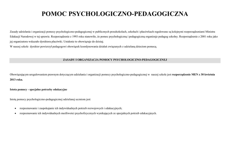 POMOC PSYCHOLOGICZNO-PEDAGOGICZNA Zasady udzielania i organizacji pomocy psychologiczno-pedagogicznej w publicznych przedszkolach, szkołach i placówkach regulowane są kolejnymi rozporządzeniami Ministra Edukacji Narodowej w tej sprawie. Rozporządzenie z 1993 roku stanowiło, że pomoc psychologiczną i pedagogiczną organizuje pedagog szkolny. Rozporządzenie z 2001 roku jako jej organizatora wskazało dyrektora placówki. Ustalenie to obowiązuje do dzisiaj. W naszej szkole dyrektor powierzył pedagogowi obowiązek koordynowania działań związanych z udzielaną dzieciom pomocą. ZASADY I ORGANIZACJA POMOCY PSYCHOLOGICZNO-PEDAGOGICZNEJ Obowiązującym uregulowaniem prawnym dotyczącym udzielania i organizacji pomocy psychologiczno-pedagogicznej w naszej szkole jest rozporządzenie MEN z 30 kwietnia 2013 roku. Istota pomocy - specjalne potrzeby edukacyjne Istotą pomocy psychologiczno-pedagogicznej udzielanej uczniom jest: rozpoznawanie i zaspokajanie ich indywidualnych potrzeb rozwojowych i edukacyjnych; rozpoznawanie ich indywidualnych możliwości psychofizycznych wynikających ze specjalnych potrzeb edukacyjnych. Uczeń z niepełnosprawnością Uczeń z niepełnosprawnością to uczeń z orzeczeniem o potrzebie kształcenia specjalnego, który z uwagi na zaburzenia i odchylenia rozwojowe o zróżnicowanej etiologii, wymaga zastosowania specjalnej organizacji procesu edukacyjnego w zakresie: organizacji warunków technicznych, metod i środków stosowanych w procesie dydaktycznym, kształtowania relacji społecznych, współpracy ze środowiskiem rodzinnym. Do uczniów niepełnosprawnych należy zaliczyć: uczniów niewidomych, słabo widzących, niesłyszących, słabo słyszących, z niepełnosprawnością ruchową (w tym z afazją i mózgowym porażeniem dziecięcym), z autyzmem (w tym z zespołem Aspargera), z upośledzeniem umysłowym (w stopniu lekkim, umiarkowanym lub znacznym), z niepełnosprawnościami sprzężonymi. Specyficzne trudności w uczeniu się Zgodnie z zapisem zawartym w Rozporządzeniu Ministra Edukacji Narodowej w sprawie warunków i sposobu oceniania, klasyfikowania i promowania uczniów i słuchaczy oraz przeprowadzania sprawdzianów i egzaminów w szkołach publicznych, przez specyficzne trudności w uczeniu się, należy rozumieć: trudności w uczeniu się odnoszące się do uczniów w normie intelektualnej, którzy mają trudności w przyswajaniu treści nauczania, wynikające ze specyfiki ich funkcjonowania percepcyjno-motorycznego i poznawczego, nieuwarunkowane schorzeniami neurologicznymi. W szczególności chodzi tu o dysleksję, dysgrafię, dysortografię i dyskalkulię. Niepowodzenia edukacyjne Wyraźne rozbieżności między celami edukacji a osiągnięciami szkolnymi uczniów oraz kształtowanie się negatywnego stosunku wobec wymagań szkoły. Inaczej (J. Konopnicki), to stan, w jakim znalazło się dziecko na skutek niemożności sprostania wymaganiom szkoły. Przejawy najbardziej ewidentne: drugoroczność, wieloroczność, wypadnięcie z systemu. Choroba przewlekła Za chorobę przewlekłą uznaje się takie zaburzenia i odchylenia od normy, które posiadają jedną lub więcej z następujących cech charakterystycznych: są trwałe, spowodowane są przez nieodwracalne zmiany patologiczne, wymagają specjalnego postępowania rehabilitacyjnego, wymagają długotrwałego leczenia, długiego nadzoru, obserwacji czy opieki . Zdiagnozowanie przez lekarza przewlekłej choroby nie oznacza automatycznie potrzeby stosowania specjalnej organizacji nauki i metod pracy wobec tego dziecka, ale wskazuje głównie na jego specjalne potrzeby medyczne. Choroby przewlekłe, to między innymi: astma, hemofilia, padaczka, depresja, schizofrenia, zaburzenia psychotyczne, zaburzenia tikowe, zaburzenia odżywiania (bulimia, anoreksja), cukrzyca. Zaburzenie komunikacji językowej Grupa ekspresji językowej - dzieci, którzy słyszą i rozumieją mowę, jednak nie mogą jej używać i do ekspresji potrzebują alternatywnych form języka. Do tej grupy należeć mogą osoby z normą intelektualną, ale i z upośledzeniem umysłowym w stopniu lekkim, umiarkowanym lub znacznym, z mózgowym porażeniem dziecięcym, z autyzmem, z całkowitą afazją ruchową wrodzoną lub nabytą np. w konsekwencji wypadku. Grupa języka alternatywnego - dzieci mają problem zarówno z rozumieniem mowy jak też z językową ekspresją werbalną. W celu porozumiewania się z nimi językowo, trzeba ustanowić język alternatywny: formę komunikacji, dzięki której nauczą się rozumieć przekaz innych i na bazie tej umiejętności same zaczną jej używać. Szczególnymi przedstawicielami tej grupy są niesłyszący, jednak dla nich opracowano odrębne metody. Tu mówimy raczej o osobach, u których sam zmysł słuchu działa prawidłowo, a zaburzenia rozumienia spowodowane są innymi czynnikami. Dotyczy to osób z autyzmem, z zaburzeniami przetwarzania słuchowego, jak np. w afazji sensorycznej, w głębszym upośledzeniu umysłowym. W tej grupie są też uczniowie niesłyszący z niepełnosprawnością ruchową, którzy nie mogą korzystać z tradycyjnych metod surdopedagogiki. Grupa wsparcia językowego - są w niej dzieci i młodzież, które rozumieją mowę i podejmują próby mówienia, jednak przekaz werbalny nie jest zrozumiały i adekwatny do potrzeb oraz możliwości poznawczych i społecznych. Dla nich język alternatywny ma stanowić uzupełnienie lub wsparcie języka mówionego. Dla tych, którzy wciąż uczą się mowy i języka (mają zajęcia logopedyczne polegające na wywoływaniu i korygowaniu głosek, sylab, słów, zdań), ma stać się rusztowaniem dla tej umiejętności, ułatwić i udrożnić naukę. Inny podział zaburzeń komunikacji językowej: zaburzenia języka: zaburzenia składni, trudności w opanowaniu form gramatycznych, trudności z organizacją tekstu, kłopoty z nabywaniem nowego słownictwa, trudności w używaniu zwrotów adekwatnych do sytuacji, 