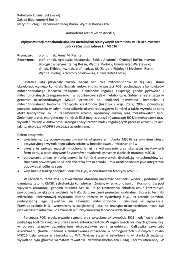 Katarzyna Kuźma (Łukawska) Zakład Bioenergetyki Roślin Instytut Biologii Eksperymentalnej Roślin, Wydział Biologii UW Autoreferat rozprawy doktorskiej Wpływ mutacji mitochondrialnej na metabolizm reaktywnych form tlenu w liściach mutanta ogórka (Cucumis sativus L.) MSC16 Promotor: prof. dr hab. Anna M. Rychter Recenzenci: prof. dr hab. Agnieszka Mostowska (Zakład Anatomii i Cytologii Roślin, Instytut Biologii Eksperymentalnej Roślin, Wydział Biologii, Uniwersytet Warszawski) dr hab. Elżbieta Kuźniak, prof. nadzw. UŁ (Katedra Fizjologii i Biochemii Roślin, Wydział Biologii i Ochrony Środowiska, Uniwersytet Łódzki) Ostatnie lata przyniosły rozwój badao nad rolą mitochondriów w regulacji stanu oksydoredukcyjnego komórek. Sygnały redoks (m. in. w postaci ROS) pochodzące z kompleksów mitochondrialnego łaocucha transportu elektronów regulują ekspresję genów jądrowych i mitochondrialnych zaangażowanych w podstawowe szlaki metaboliczne. Subtelna rearanżacja w genomie mitochondrialnym MSC16 prowadzi do obniżonej aktywności kompleksu I mitochondrialnego łaocucha transportu elektronów (Juszczuk i wsp. 2007, 2009), powodując poważne zaburzenia w całym metabolizmie oksydoredukcyjnym komórki a także wywołując silny efekt fenotypowy, m. in. zahamowany wzrost, opóźniony rozwój oraz mozaikowatośd liści. Zmieniony status energetyczny komórek liści mógł zaburzyd równowagę ROS/antyoksydanty oraz wywoład zmiany w aktywności szeregu specyficznych białek regulujących procesy wzrostu, takich jak np. oksydaza NADPH i oksydaza askorbinianu. Celem pracy było: wyjaśnienie, czy obserwowane zmiany fenotypowe u mutanta MSC16 są wynikiem stresu oksydacyjnego wywołanego zaburzeniami w funkcjonowaniu mitochondriów określenie wpływu mutacji mitochondrialnej na wytwarzanie oraz lokalizację reaktywnych form tlenu, a także aktywnośd systemów antyoksydacyjnych w tkankach mutanta MSC16 porównanie zmian w funkcjonowaniu komórki wywołanych dysfunkcją mitochondriów ze zmianami powstałymi na skutek działania stresu chłodu – rola mitochondrium jako integratora odpowiedzi roślin na stres wyjaśnienie funkcji apoplastu oraz roli H 2O2 w powstawaniu fenotypu MSC16 W liściach mutanta MSC16 stwierdzono obniżoną zawartośd nadtlenku wodoru, podobnie jak u mutanta tytoniu CMSII, z dysfunkcją kompleksu I. Zmiany w funkcjonowaniu mitochondriów pod wpływem rearanżacji genomu mutanta MSC16 lub po traktowaniu chłodem roślin kontrolnych powodowały zwiększone wydzielanie H 2O2 do przestrzeni perimitochondrialnej. Stosując techniki mikroskopii elektronowej wykazano istotne różnice w dystrybucji H2O2 na terenie komórki, podwyższoną jego zawartośd na zewnątrz mitochondriów i obniżoną w apoplaście. Prawdopodobnie H2O2, wytwarzany w zwiększonej ilości na zewnątrz mitochondrium, może byd przekaźnikiem informacji o zmianach w funkcjonowaniu łaocucha oddechowego. Percepcja ROS, przekazywanie sygnału oraz wywołane aktywnością ROS modyfikacje białek podlegają kontroli i regulacji przez szereg antyoksydantów. W organizmach roślinnych główną rolę w obronie przeciw uszkodzeniom oksydacyjnym pełni askorbinian. Całkowita zawartośd askorbinianu (forma utleniona i zredukowana) oznaczona w homogenatach liściowych z roślin MSC16 była wyższa w stosunku do WT. Wyższe stężenie askorbinianu w tkankach mutanta wywołane było głównie wzrostem zawartości dehydroaskorbinianu (DHA) - formy utlenionej. W ekstraktach z liści mutanta MSC16 oznaczono także wyższą w stosunku do kontroli aktywnośd peroksydaz oraz niektórych izoform dysmutazy ponadtlenkowej. Podobny schemat aktywności przeciwutleniaczy enzymatycznych obserwowano u innych mutantów mitochondrialnych: tytoniu CMSII oraz kukurydzy NCS2. Askorbinian stanowi również istotny element złożonej sieci kontroli i współdziałania czynników regulujących procesy wzrostu. Podziały komórkowe są niezwykle wrażliwe na zmiany stężenia AsA, MDHA i DHA w apoplaście. Jednym z enzymów zaangażowanych w metabolizm AsA jest zlokalizowana w apoplaście oksydaza askorbinianowa (AO), regulująca także wzrost elongacyjny komórek. W tkankach MSC16 oznaczono wyższą w stosunku do WT aktywnośd AO. Wykazano także, że apoplastyczna pula ROS zaangażowana w procesy rozwojowe jest produkowana głównie przez związaną z plazmalemmą oksydazę NADPH. Obniżona zawartośd nadtlenku wodoru na terenie apoplastu w tkankach MSC16 wynika prawdopodobnie z obniżonej produkcji spowodowanej niższą aktywnością oksydazy NADPH i jednocześnie wzmożonej detoksyfikacji związanej z podwyższoną zawartością askorbinianu na terenie apoplastu. Przeprowadzone badania wykazały, że wywołane mutacją zmiany w funkcjonowaniu mitochondrialnego łaocucha transportu elektronów pociągają za sobą istotne zaburzenia w statusie redoks całej komórki. Oznaczona podwyższona aktywnośd antyoksydantów enzymatycznych, niższy stopieo utlenienia przeciwutleniaczy niskocząsteczkowych oraz brak wzrostu peroksydacji lipidów w tkankach mutanta MSC16 sugerują, że nie występuje tam zjawisko stresu antyoksydacyjnego. Stwierdzono jednak zachwianie równowagi ROS/antyoksydanty. Zaobserwowane różnice mogą mied kluczowe znaczenie dla procesów fizjologicznych zachodzących w komórce powodując ich zakłócenie, co może byd przyczyną powstawania fenotypu MSC16. Niższe tempo wzrostu oraz deformacja liści MSC16 spowodowane są prawdopodobnie niskim poziomem apoplastycznej puli ROS, istotnej dla prawidłowego wzrostu i rozwoju organów. Obserwowane większe rozmiary komórek mezofilu liści mutanta mogą wynikad ze wzmożonego wzrostu elongacyjnego komórek, połączonego z zaburzeniami usztywniania struktury ściany komórkowej. Publikacje: Szal B, Łukawska K, Zdolioska I, Rychter AM. 2009. Chilling stress and mitochondrial genome r earrangement in the MSC16 cucumber mutant affect the alternative ox
