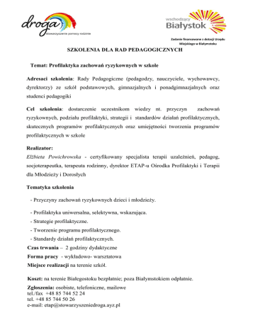 Zadanie finansowane z dotacji Urzędu Miejskiego w Białymstoku SZKOLENIA DLA RAD PEDAGOGICZNYCH Temat: Profilaktyka zachowań ryzykownych w szkole Adresaci szkolenia: Rady Pedagogiczne (pedagodzy, nauczyciele, wychowawcy, dyrektorzy) ze szkół podstawowych, gimnazjalnych i ponadgimnazjalnych oraz studenci pedagogiki Cel szkolenia: dostarczenie uczestnikom wiedzy nt. przyczyn zachowań ryzykownych, podziału profilaktyki, strategii i standardów działań profilaktycznych, skutecznych programów profilaktycznych oraz umiejętności tworzenia programów profilaktycznych w szkole Realizator: Elżbieta Powichrowska - certyfikowany specjalista terapii uzależnień, pedagog, socjoterapeutka, terapeuta rodzinny, dyrektor ETAP-u Ośrodka Profilaktyki i Terapii dla Młodzieży i Dorosłych Tematyka szkolenia - Przyczyny zachowań ryzykownych dzieci i młodzieży. - Profilaktyka uniwersalna, selektywna, wskazująca. - Strategie profilaktyczne. - Tworzenie programu profilaktycznego. - Standardy działań profilaktycznych. Czas trwania – 2 godziny dydaktyczne Forma pracy - wykładowo- warsztatowa Miejsce realizacji na terenie szkół. Koszt: na terenie Białegostoku bezpłatnie; poza Białymstokiem odpłatnie. Zgłoszenia: osobiste, telefoniczne, mailowe tel./fax +48 85 744 52 24 tel. +48 85 744 50 26 e-mail: [email protected] Zadanie finansowane z dotacji Urzędu Miejskiego w Białymstoku SZKOLENIA DLA RAD PEDAGOGICZNYCH Temat: Podstawy komunikacji empatycznej w pracy z uczniem/wychowankiem Adresaci szkolenia: pedagodzy, nauczyciele, wychowawcy, dyrektorzy ze szkół podstawowych, gimnazjalnych i ponadgimnazjalnych oraz studenci pedagogiki Cel szkolenia: zapoznanie uczestników szkolenia z metodą Porozumienia bez przemocy (NVC) wg Marshalla Rosenberga i kształtowanie umiejętności komunikacji empatycznej oraz zastosowanie nabytych umiejętności w praktyce w pracy z uczniem Tematyka szkolenia: 1) Komunikacja - narzędzia skutecznego porozumiewania się (empatia) 2) Przedstawienie 4 stopniowego modelu empatii NVC 3) Czworo przyjaciół: złość, depresja, wina i wstyd – czyli jak sobie radzić z trudnymi uczuciami 4) Jak uczyć się na błędach nie tracąc poczucia własnej wartości wg Porozumienia bez przemocy Prowadzący: Andrzej Karolczyk – certyfikowany specjalista terapii uzależnień, mgr pedagog, mediator NVC Metody pracy: mini wykład, metody aktywne Czas trwania –2 godziny dydaktyczne Miejsce realizacji na terenie szkół. Koszt: na terenie Białegostoku bezpłatnie; poza Białymstokiem odpłatnie. Zgłoszenia: osobiste, telefoniczne, mailowe tel./fax +48 85 744 52 24 tel. +48 85 744 50 26 e-mail: [email protected] Zadanie finansowane z dotacji Urzędu Miejskiego w Białymstoku SZKOLENIA DLA RAD PEDAGOGICZNYCH Temat: Psychospołeczny aspekt uzależnień Adresaci szkolenia: Rady Pedagogiczne (pedagodzy, nauczyciele, wychowawcy, dyrektorzy) ze szkół podstawowych, gimnazjalnych i ponadgimnazjalnych. Cel szkolenia: dostarczenie uczestnikom wiedzy przyczyn, skutków, faz i mechanizmów eksperymentowania i uzależnienia, form pomocy, jak również kształtowanie umiejętności dotyczących działań profilaktycznych, interwencyjnych skierowanych do dzieci, młodzieży i ich rodziców. Realizatorzy: Elżbieta Powichrowska - certyfikowany specjalista terapii uzależnień, mgr pedagog, socjoterapeutka, terapeuta rodzinny, Tematyka szkolenia -Zjawisko narkomanii. Psychospołeczny aspekt uzależnień. - Fazy, mechanizmy, rodzaje uzależnień. - Formy pomocy osobom eksperymentującym i uzależnionym od narkotyków, dopalaczy. Czas trwania – 2 godziny dydaktyczne Miejsce realizacji na terenie szkół. Koszt: na terenie Białegostoku bezpłatnie; poza Białymstokiem odpłatnie. Zgłoszenia: osobiste, telefoniczne, mailowe tel./fax +48 85 744 52 24 tel. +48 85 744 50 26 e-mail: [email protected] Zadanie finansowane z dotacji Urzędu Miejskiego w Białymstoku SZKOLENIA DLA RAD PEDAGOGICZNYCH Temat: Wczesne rozpoznawanie i interwencja wobec osób eksperymentujących i uzależnionych od środków psychoaktywnych Adresaci szkolenia: Rady Pedagogiczne (pedagodzy, nauczyciele, wychowawcy, dyrektorzy) ze szkół podstawowych, gimnazjalnych i ponadgimnazjalnych. Cel szkolenia: dostarczenie uczestnikom wiedzy nt. rodzajów narkotyków, dopalaczy, jak rozpoznać czy uczeń sięga po narkotyki, dopalacze?, przyczyn, skutków, faz i mechanizmów eksperymentowania i uzależnienia, form pomocy, jak również kształtowanie umiejętności dotyczących działań profilaktycznych, interwencyjnych skierowanych do dzieci, młodzieży i ich rodziców. Realizatorzy: Elżbieta Powichrowska - certyfikowany specjalista terapii uzależnień, mgr pedagog, socjoterapeutka, terapeuta rodzinny, Wojciech Powichrowski – certyfikowany specjalista terapii uzależnień, mgr pedagog, mediator Tematyka szkolenia -Zjawisko narkomanii. Psychospołeczny aspekt uzależnień. - Fazy, mechanizmy, rodzaje uzależnień. - Formy pomocy osobom eksperymentującym i uzależnionym od narkotyków, dopalaczy. - Rodzaje narkotyków, dopalacze. Jak rozpoznać czy dziecko sięga po narkotyki, dopalacze? - Wczesna interwencja wobec osoby używającej narkotyków, dopalaczy. - Procedury postępowania szkoły w przypadku dzieci zażywających narkotyki, dopalaczy. Czas trwania – 2 godziny dydaktyczne Miejsce realizacji na terenie szkół. Koszt: na terenie Białegostoku bezpłatnie; poza Białymstokiem odpłatnie. Zgłoszenia: osobiste, telefoniczne, mailowe tel./fax +48 85 744 52 24 tel. +48 85 744 50 26 e-mail: [email protected]