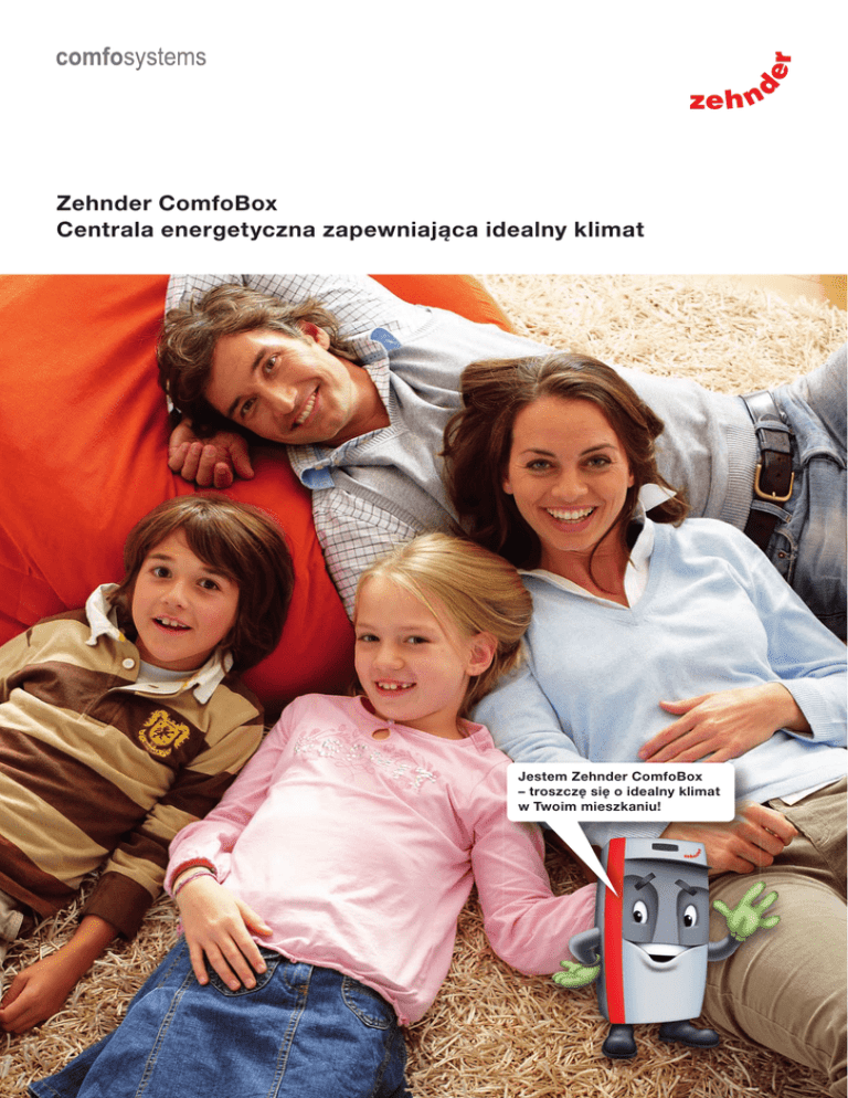 Zehnder ComfoBox Centrala energetyczna zapewniająca idealny klimat Jestem Zehnder ComfoBox – troszczę się o idealny klimat w Twoim mieszkaniu! Zehnder ComfoBox. Komfortowa centrala energetyczna. Nasze samopoczucie w domu zależy od dobrego klimatu pomieszczenia. Dobry klimat to odpowiednie ogrzewanie, chłodzenie i dostarczanie świeżego powietrza. Czyż nie byłoby komfortowe, gdyby wszystkie te funkcje spełniało jedno jedyne urządzenie? Zehnder ComfoBox jest właśnie takim urządzeniem. Pompa ciepła i centrala wentylacyjna w jednym – połączenie całej niezbędnej dla jednego domu techniki: ogrzewania, chłodzenia, wentylacji i podgrzewania wody. Centrala wykorzystuje odnawialne źródła energii, co czyni z niej wyjątkowo wydajną i przyszłościową alternatywę – to idealne rozwiązanie dla komfortu Twojego domu. Dowodem na to, iż dobry klimat może mieć też dobry wygląd, jest ponadczasowy nowoczesny design centrali, która ma zaledwie 0,5 m2 powierzchni podstawy. Komfortowa, wydajna, estetyczna: kompaktowa centrala energetyczna Zehnder ComfoBox zapewnia dobrą jakość życia. Przyszłościowe rozwiązanie: efektywność z wykorzystaniem odnawialnych źródeł energii Kompaktowość: pompa ciepła i centrala wentylacyjna w jednym Komfort: ogrzewanie, chłodzenie, wentylacja i podgrzewanie wody Oszczędność miejsca: tylko 0,5 m2 powierzchni podstawy (z bojlerem 1 m2) Dla budynków nowych i modernizowanych Korzyści Zehnder ComfoBox Korzyści komfortowej wentylacji Zehnder Korzyści pompy ciepła Zehnder Zasada funkcjonowania Parametry Opcje Dlaczego Zehnder 4 6 8 10 14 16 18 Zehnder ComfoBox: kompaktowość i same korzyści. Nawet, jeżeli w porównaniu z innymi urządzeniami centrala Zehnder ComfoBox wydaje się niewielka, to przecież ma ona w sobie „to coś”. Kompaktowa obudowa skrywa bowiem nie tylko pompę ciepła i centralę rekuperacyjną wraz z całym oprzyrządowaniem – gwarantuje również 100% korzyści wykorzystania wszystkich tych urządzeń. 1 All-in-one Ogrzewanie, chłodzenie, wentylacja, podgrzewanie wody – Zehnder ComfoBox to multitalent, który troszczy się o Twoje dobre samopoczucie. Zajmuje niewiele miejsca i dobrze się prezentuje Zehnder ComfoBox to komfort i jakość życia. Ekonomiczność Do odzysku energii Zehnder ComfoBox wykorzystuje efektywnie energię geotermalną. Jednocześnie rekuperator odzyskuje do 95% energii cieplnej z odprowadzanego powietrza i przekazuje ją do powietrza doprowadzanego. 3 Przyszłościowe rozwiązanie Zehnder ComfoBox to inwestycja w przyszłość: rozsądne korzystanie z odnawialnych źródeł energii pozwala obniżyć zużycie paliwa węglowego i tym samym emisję CO2, wspierając tym samym niezależność międzynarodowego rynku gazowego i naftowego. 4 Utrzymanie wartości Dzięki Zehnder ComfoBox możemy naprawdę cieszyć się korzyściami, jakie daje szczelna izolacja budynku. Wentylacja opierająca się na ciągłym mechanicznym odzysku ciepła nie pozwala na straty energii, a jednocześnie odprowadza wilgoć i zapobiega powstawaniu grzyba – to nieocenione dla utrzymania wartości i ponownej sprzedaży Twojej nieruchomości. Bezpieczeństwo Zehnder ComfoBox to nie tylko wysoka jakość i technologia przyszłości, lecz również doświadczenie i rzetelność silnej marki: każde urządzenie uruchamiane jest testowo w zakładzie produkcyjnym i sprawdzane pod kątem funkcjonalności i bezpieczeństwa systemu. 2 Troszczę się o wartościową przyszłość – i utrzymanie wartości Twojej nieruchomości. 4 Korzyści Zehnder ComfoBox Komfortowa wentylacja: po prostu świeże powietrze. Ponad 70% naszego czasu spędzamy w pomieszczeniach zamkniętych. Właśnie dlatego świeże powietrze jest tak ważne dla naszego samopoczucia. Wentylacja komfortowa dostarcza nieprzerwanie świeże powietrze, redukuje straty ciepła przez wentylację, chroni przed hałasem i zanieczyszczeniami oraz zabezpiecza przed włamaniem. To przecież jasne: tam, gdzie jest świeże powietrze, czujemy się po prostu lepiej. 6 Tak funkcjonuje system komfortowej wentylacji. Zehnder Comfosystems ComfoFond Gruntowy wymiennik ciepła (opcjonalnie) ComfoUnit Wentylacja nawiewno-wywiewna Zamknięty obieg pompy ciepła Temperatura ComfoFresh System dystrybucji powietrza Na sprawność całego systemu składa się sprawność jego poszczególnych komponentów. Elementy systemu komfortowej wentylacji Zehnder Comfosystems są do siebie idealnie dopasowane – aby zapewnić idealny klimat pomieszczenia. Centrala energetyczna Zehnder ComfoBox jest podstawą – wraz z odpowiednim systemem dystrybucji powietrza i opcjonalnym gruntowym wymiennikiem ciepła Zehnder ComfoFond-L otrzymujemy w jednym urządzeniu kompletny system komfortowej wentylacji Zehnder. Zasada funkcjonowania jest prosta i efektywna: Zanieczyszczenia powietrza Instalacja w betonie podłoga wylewka warstwy izolacyjne strop betonowy kanał okrągły ComfoTube 51 Promieniowanie słoneczne 4. Rozprężanie Hałas 1. Wyparowanie Pyłki Instalacja na betonie 3. Skraplanie 2. Sprężanie 1. Sonda gruntowa pobiera energię ziemi i przekazuje ją do pompy ciepła. W parowniku ciepło to przekazywane jest do środka chłodzącego, który przechodzi w stan gazowy. Warianty pompy ciepła Bezpieczeństwo Pompa ciepła może pobierać naturalne zasoby energii na różne sposoby: pionową sondą gruntową, poziomym kolektorem gruntowym lub poprzez wodę gruntową. 2. Moduł wentylacyjny w centrali Zehnder ComfoBox odzyskuje do 95% energii z odprowadzanego powietrza i przekazuje ją do powietrza doprowadzanego. System solanka/ woda System woda /woda Już od głębokości 5 m ziemia wykazuje w niektórych warstwach stałą temperaturę na poziomie ok. 10° C. 3. Kanałami dystrybucyjnymi systemu Zehnder ComfoFresh świeże powietrze o odpowiedniej temperaturze doprowadzane jest do poszczególnych pomieszczeń, a powietrze zużyte odprowadzane jest na zewnątrz. Pompa odprowadzaj