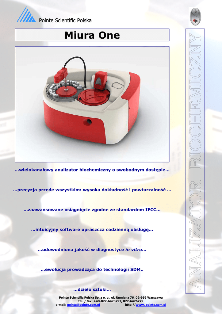 Pointe Scientific Polska Miura One …wielokanałowy analizator biochemiczny o swobodnym dostępie… …precyzja przede wszystkim: wysoka dokładność i powtarzalność … …zaawansowane osiągnięcie zgodne ze standardem IFCC... …intuicyjny software upraszcza codzienną obsługę... …udowodniona jakość w diagnostyce in vitro... …ewolucja prowadząca do technologii SDM.. …dzieło sztuki… Pointe Scientific Polska Sp. z o. o., ul. Rumiana 76, 02-956 Warszawa tel. / fax: +48-022-6423797, 022-6426779 e-mail: [email protected] http://www. pointe.com.pl one DANE TECHNICZNE System Pomiarowy: metody analityczne: krzywa kalibracyjna: fotometr: źródło światła: temperatura inkubacji: objętość odczytu: wydajność: system pracy: absorbancja, punkt końcowy, kinetyka fixed time, kinetyka ze standardem lub faktorem, róŜnicowanie ślepej dla próbki, kalibracja jedno- i wielopunktowa, róŜnicowanie monochromatyczne i bichromatyczne, immunoturbidymetria; regresja liniowa, krzywa złoŜona 3 stopnia, liniowa nieciągła, wielomian; 9 filtrów o długości fali 340 - 700 nm; liniowość 0 - 3,0 OD; lampa halogenowa o przedłuŜonej Ŝywotności; 37° C ± 0,1° C; 150 - 250 µl; 120 testów fotometrycznych w ciągu godz., do 180 testów z modułem ISE; pacjent po pacjencie, seryjny, próbki pilne; Charakterystyka Próbek: ilość próbek: wymienne statywy po 9 pozycji: probówki pierwotne, kubeczki 3 ml; ilość standardów: jednocześnie do 9 pozycji z moŜliwością samoczynnego rozcieńczania; ilość kontrolek: 3 (krzywe Levy-Jenings’a); moduł ISE: Na+, K+, Li+ i Cl- w surowicy, plazmie i moczu; objętość próbki: 1-100 µl; identyfikacja: bar-kodowa; Charakterystyka Odczynników: ilość odczynników: 20 mono-reagentów (pozycje chłodzone); metody: metody jedno-, dwu- i trójodczynnikowe; objętość robocza: 180-400 µl; przedział odczynników: chłodzony; identyfikacja: bar-kodowa; Miejsca Reakcyjne: miejsca pomiarowe: mycie kuwet: rozcieńczanie: 80 kuwet wielo- lub jednokrotnego uŜycia (moŜliwość wymiany pojedynczej lub wszystkich kuwet); dostępna automatyczna stacja myjąca (<2 l wody/godz.) automatyczne, od 1:1 do 1:100; Moduł Sterujący: komputer: system operacyjny: monitor: drukarka: praca w sieci (LIS): zewnętrzny, klasa PC; Windows® XP; zewnętrzny, 15” LCD; HP-LaserJet; interfejs dwukierunkowy; Ogólne: wymagania zewn.: certyfikacja: zasilanie: temperatura 18-32° C, wilgotność 30-70 %; CE, TüV; AC 115-230 V, 50-60 Hz; ze względu na ciągłe udoskonalanie produktu specyfikacja podlega zmianom bez uprzedniej notyfikacji --2009-- Pointe Scientific Polska