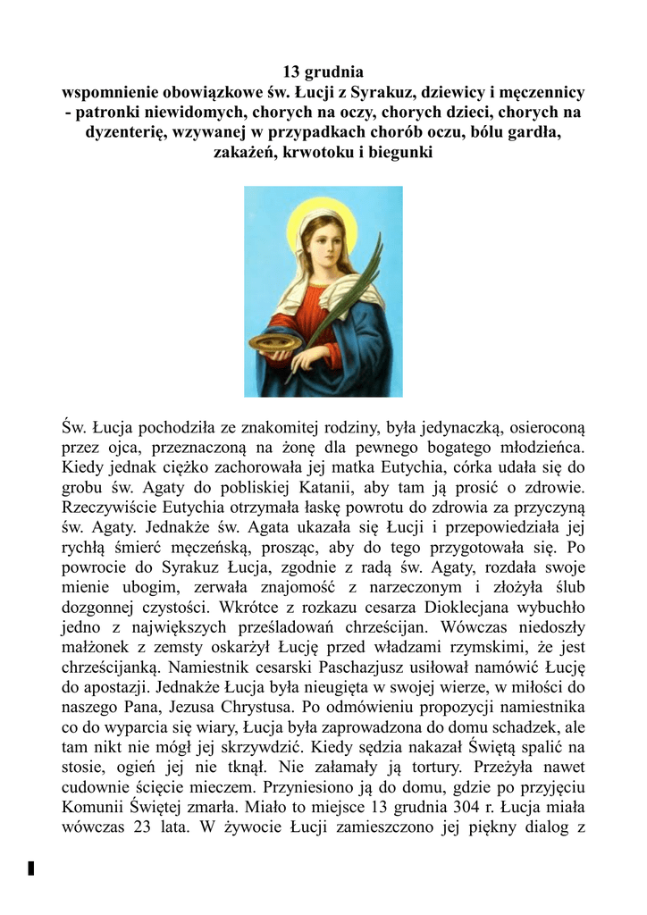 13 grudnia wspomnienie obowiązkowe św. Łucji z Syrakuz, dziewicy i męczennicy - patronki niewidomych, chorych na oczy, chorych dzieci, chorych na dyzenterię, wzywanej w przypadkach chorób oczu, bólu gardła, zakażeń, krwotoku i biegunki Św. Łucja pochodziła ze znakomitej rodziny, była jedynaczką, osieroconą przez ojca, przeznaczoną na żonę dla pewnego bogatego młodzieńca. Kiedy jednak ciężko zachorowała jej matka Eutychia, córka udała się do grobu św. Agaty do pobliskiej Katanii, aby tam ją prosić o zdrowie. Rzeczywiście Eutychia otrzymała łaskę powrotu do zdrowia za przyczyną św. Agaty. Jednakże św. Agata ukazała się Łucji i przepowiedziała jej rychłą śmierć męczeńską, prosząc, aby do tego przygotowała się. Po powrocie do Syrakuz Łucja, zgodnie z radą św. Agaty, rozdała swoje mienie ubogim, zerwała znajomość z narzeczonym i złożyła ślub dozgonnej czystości. Wkrótce z rozkazu cesarza Dioklecjana wybuchło jedno z największych prześladowań chrześcijan. Wówczas niedoszły małżonek z zemsty oskarżył Łucję przed władzami rzymskimi, że jest chrześcijanką. Namiestnik cesarski Paschazjusz usiłował namówić Łucję do apostazji. Jednakże Łucja była nieugięta w swojej wierze, w miłości do naszego Pana, Jezusa Chrystusa. Po odmówieniu propozycji namiestnika co do wyparcia się wiary, Łucja była zaprowadzona do domu schadzek, ale tam nikt nie mógł jej skrzywdzić. Kiedy sędzia nakazał Świętą spalić na stosie, ogień jej nie tknął. Nie załamały ją tortury. Przeżyła nawet cudownie ścięcie mieczem. Przyniesiono ją do domu, gdzie po przyjęciu Komunii Świętej zmarła. Miało to miejsce 13 grudnia 304 r. Łucja miała wówczas 23 lata. W żywocie Łucji zamieszczono jej piękny dialog z 1 pogańskim sędzią, który uważa się swego rodzaju arcydzieło nauki moralnej ku zachęcie chrześcijan i ich podbudowaniu. W ikonografii przedstawia się św. Łucję w stroju rzymskiej niewiasty, z palmą męczeństwa w jednej ręce i płaskim naczyniem w drugiej, na którym są dwoje oczu. Imię Łucja wywodzi się z łacińskiego słowa lux, co znaczy światło. Modlitwy: Wszechmogący Boże, ożyw w nas gorliwość za wstawiennictwem świętej Łucji, dziewicy i męczennicy, abyśmy za jej przykładem postępowali na ziemi jak dzieci światłości, a w niebie oglądali jej chwałę. Wysłuchaj nas Boże i Zbawicielu nasz i spraw miłościwie, abyśmy obchodząc pamiątkę św. Łucji, Dziewicy i Męczenniczki Twojej, w uczuciach pobożności nabierali wzrostu. Przez Pana naszego Jezusa Chrystusa, który króluje w Niebie i na ziemi. Amen. Duchu Święty zdroju łaski i miłości Ty w swoim uprzedzającym działaniu obdarzyłeś św. Łucję Bożą miłością, a ona wspaniałomyślnie odpowiedziała. Teraz oręduje za nami w niebie, błagam Cię Duchu Pocieszycielu natchnij moją modlitwę i udziel mi łaski, o którą przez wstawiennictwo św, Łucji proszę .......... Koronka do Św. Łucji Na medaliku ze św. Łucją: O wspaniała św. Łucjo, dziewico i męczennico, która oddałaś swoje życie za Kościół, czcimy twoje poświęcenie dla naszej wiary. Powołując się na dobroć, Panie, pokornie prosimy, za wstawiennictwem św. Łucji, abyś dał nam doskonałe widzenie i ochronę przed wszelkimi dolegliwościami oczu, żeby lepiej służyć Tobie i wypełniać Twoją Wolę. Dobra św. Łucjo usłysz nasze modlitwy i spełnij nasze prośby. Amen. Na 3 częściach po 3 paciorki każda: (3 razy) Ojcze nasz... (3 razy) Zdrowaś Maryjo... (3 razy) Chwała Ojcu... 2