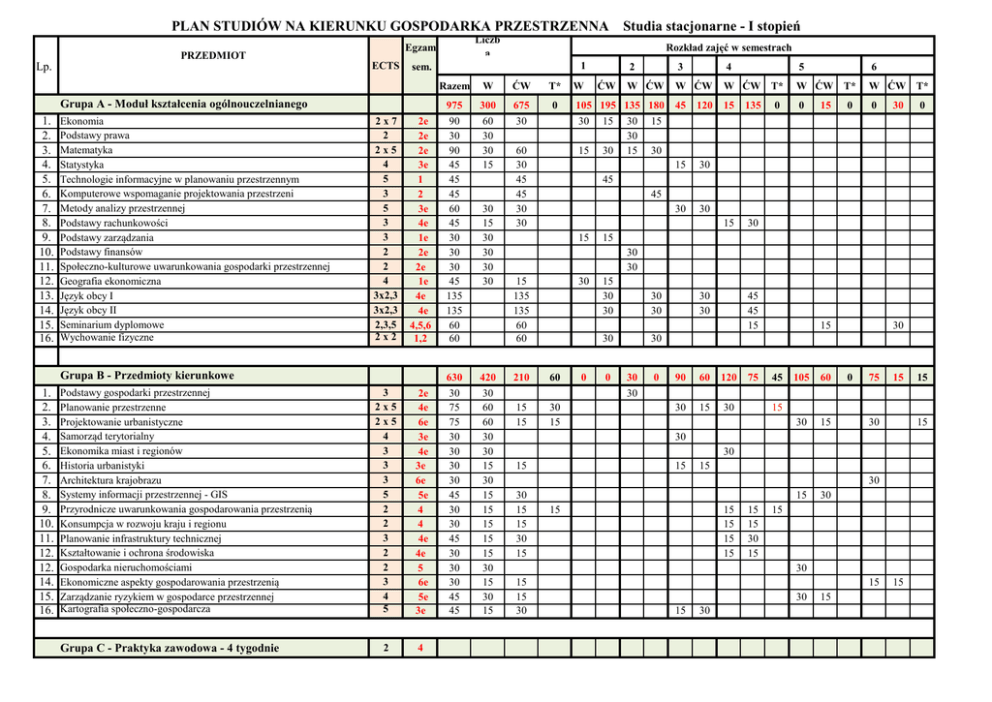 PLAN STUDIÓW NA KIERUNKU GOSPODARKA PRZESTRZENNA Egzam PRZEDMIOT ECTS Lp. 1. 2. 3. 4. 5. 6. 7. 8. 9. 10. 11. 12. 13. 14. 15. 16. Ekonomia Podstawy prawa Matematyka Statystyka Technologie informacyjne w planowaniu przestrzennym Komputerowe wspomaganie projektowania przestrzeni Metody analizy przestrzennej Podstawy rachunkowości Podstawy zarządzania Podstawy finansów Społeczno-kulturowe uwarunkowania gospodarki przestrzennej Geografia ekonomiczna Język obcy I Język obcy II Seminarium dyplomowe Wychowanie fizyczne Podstawy gospodarki przestrzennej Planowanie przestrzenne Projektowanie urbanistyczne Samorząd terytorialny Ekonomika miast i regionów Historia urbanistyki Architektura krajobrazu Systemy informacji przestrzennej - GIS Przyrodnicze uwarunkowania gospodarowania przestrzenią Konsumpcja w rozwoju kraju i regionu Planowanie infrastruktury technicznej Kształtowanie i ochrona środowiska Gospodarka nieruchomościami Ekonomiczne aspekty gospodarowania przestrzenią Zarządzanie ryzykiem w gospodarce przestrzennej Kartografia społeczno-gospodarcza Grupa C - Praktyka zawodowa - 4 tygodnie 1 Razem W ĆW T* 975 90 30 90 45 45 45 60 45 30 30 30 45 135 135 60 60 300 60 30 30 15 675 30 0 2e 2e 2e 3e 1 2 3e 4e 1e 2e 2e 1e 4e 4e 4,5,6 1,2 3 2x5 2x5 4 3 3 3 5 2 2 3 2 2 3 4 5 2e 4e 6e 3e 4e 3e 6e 5e 4 4 4e 4e 5 6e 5e 3e 630 30 75 75 30 30 30 30 45 30 30 45 30 30 30 45 45 420 30 60 60 30 30 15 30 15 15 15 15 15 30 15 30 15 2 4 2x7 2 2x5 4 5 3 5 3 3 2 2 4 3x2,3 3x2,3 2,3,5 2x2 Grupa B - Przedmioty kierunkowe 1. 2. 3. 4. 5. 6. 7. 8. 9. 10. 11. 12. 12. 14. 15. 16. Rozkład zajęć w semestrach sem. Grupa A - Moduł kształcenia ogólnouczelnianego Studia stacjonarne - I stopień Liczb a 30 15 30 30 30 30 60 30 45 45 30 30 W ĆW 2 3 4 5 6 W ĆW W ĆW W ĆW T* W ĆW T* W ĆW T* 45 120 15 135 0 0 15 30 30 30 15 30 105 195 135 180 30 15 30 15 30 15 30 15 30 0 15 0 30 0 45 45 15 15 30 30 15 135 135 60 60 30 210 60 15 15 30 15 0 15 30 30 30 30 30 30 0 30 30 0 30 30 45 45 15 90 60 120 30 15 30 75 15 45 105 60 30 15 15 30 30 0 75 15 15 30 15 30 30 15 15 15 30 30 15 15 30 15 15 15 15 15 15 15 15 30 15 15 30 15 15 30 15 30 15 30 15 15 15 Specjalność: Strategie rozwoju regionalnego Grupa S - Przedmioty specjalnościowe 1. 2. 3. 4. 5. 6. 7. 8. Strategie rozwoju regionalnego i lokalnego Turystyka w gospodarce regionalnej Gospodarowanie na obszarach chronionych Przygotowanie projektów unijnych Finanse publiczne Przedsiębiorstwo w rozwoju regionalnym Metody heurystyczne w strategiach rozwoju regionalnego Ewaluacja programów i projektów 4 3 2 2 2 2 5 5 5e 5e 5 5 6 6e 6 6 Ogółem liczba godzin (A+B+S) / Egzaminy 285 60 45 15 15 30 30 45 45 165 30 30 15 15 30 15 15 15 120 30 15 1890 885 1005 15 0 Specjalność: 0 0 0 0 0 0 90 30 30 15 15 45 30 15 15 75 105 195 165 180 135 180 135 210 45 75 75 30 15 15 15 15 30 30 0 15 15 30 30 180 195 120 15 150 120 3 6 5 7 4 4 30 30 30 30 30 30 15 Zarządzanie miastem Grupa S - Przedmioty specjalnościowe 1. 2. 3. 4. 5. 6. 7. 8. 0 15 Egzaminy Ilość ECTS - ogółem 0 Podstawy geodezji Projektowanie przestrzeni miasta Socjologia miasta Zagospodarowanie turystyczne Rewitalizacja zdegradowanych zespołów miejskich Przedsiębiorstwo w rozwoju miasta Wycena nieruchomości miejskich Zarządzanie projektami ekonomicznymi i organizacyjnymi 4 3 2 2 4 2 3 5 Ogólna liczba godzin (A+B+S) Egzaminy Ilość ECTS - ogółem T* - zajęcia terenowe nie uwzględnia się w bilansie godzin 180 5e 5 5 5e 6 6e 6 6 285 45 30 30 30 45 30 30 45 165 15 15 30 30 30 15 15 15 120 30 15 1890 885 1005 15 15 0 0 0 0 0 0 0 0 0 90 15 15 30 30 45 30 15 15 15 15 15 15 30 90 105 195 165 180 135 180 135 210 45 195 120 15 75 75 30 15 15 15 15 15 15 30 150 120 3 6 5 7 4 4 30 30 30 30 30 30 0 30