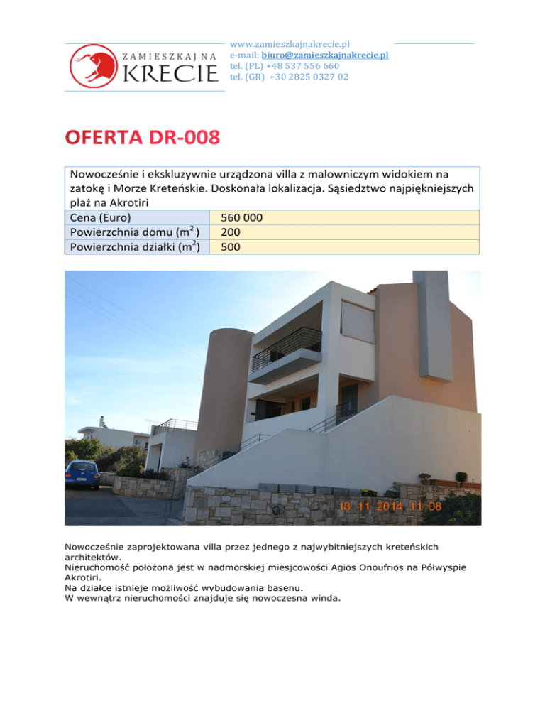www.zamieszkajnakrecie.pl e-‐‑mail: [email protected] tel. (PL) +48 537 556 660 tel. (GR) +30 2825 0327 02 Nowocześnie i ekskluzywnie urządzona villa z malowniczym widokiem na zatokę i Morze Kreteńskie. Doskonała lokalizacja. Sąsiedztwo najpiękniejszych plaż na Akrotiri Cena (Euro) 560 000 2 Powierzchnia domu (m ) 200 Powierzchnia działki (m2) 500 Nowocześnie zaprojektowana villa przez jednego z najwybitniejszych kreteńskich architektów. Nieruchomość położona jest w nadmorskiej miesjcowości Agios Onoufrios na Półwyspie Akrotiri. Na działce istnieje możliwość wybudowania basenu. W wewnątrz nieruchomości znajduje się nowoczesna winda. www.zamieszkajnakrecie.pl e-‐‑mail: [email protected] tel. (PL) +48 537 556 660 tel. (GR) +30 2825 0327 02 Na par terze są 3 sypialnie i łazienka z wanną, wyłożona płytkami ceramicznymi w kolorze biało-niebieskim. Na piętro oprócz windy, prowadzą schody, wyłożone jasnym drewnem. Na piętrze znajduje się duży salon z kominkiem, łazienka z wanną, toaleta oraz duża i nowocześnie urządzona kuchnia. Ekskluzywne meble kuchenne w kolorze jasnego brązu wykonane są z materiałów najwyższej jakości, jak również urządzenia AGD, które zamontowane są w kuchni. Z kuchni jest wejście do pomieszczenia gospodarczego. Sufity na piętrze mają bardzo ciekawą drewnianą konstrukcję. www.zamieszkajnakrecie.pl e-‐‑mail: [email protected] tel. (PL) +48 537 556 660 tel. (GR) +30 2825 0327 02 W budynku jest nowoczesna stolarka okienna w kolorze grafitowym. Z kuchni i salonu są wyjścia na duże balkony, z których rozciąga się przepiękny i malowniczy widok na całą okolicę, Morze Kreteńskie i Górę Stavros. W willi zamontowane są nowoczesne urządzenia centralnego ogrzewania oraz klimatyzacji. Do części przypiwnicznej prowadzą marmurowe schody i znajdują się w niej: pomieszczenia gospodarcze oraz pokój z łazienką, który ma osobne wejście z zewnątrz budynku i może służyć jako sypialnia dla gości. www.zamieszkajnakrecie.pl e-‐‑mail: [email protected] tel. (PL) +48 537 556 660 tel. (GR) +30 2825 0327 02 Posadzki w nieruchomości wyłożone są dużymi ceramicznymi płytkami w jasnym beżowym kolorze. Wszystkie materiały użyte do budowy i wykończenia willi są bardzo wysokiej jakości. Odległość od kameralnej, piaszczystej plaży z mariną - 2 km. Bliska odległość od malowniczych, piaszczystych plaż takich jak: Kalathas czy Stavros. Odległość od miasta Chania 7 km. Odległość od lotniska 7 km. Cena nieruchomości po dużej obniżce 560 000 €.