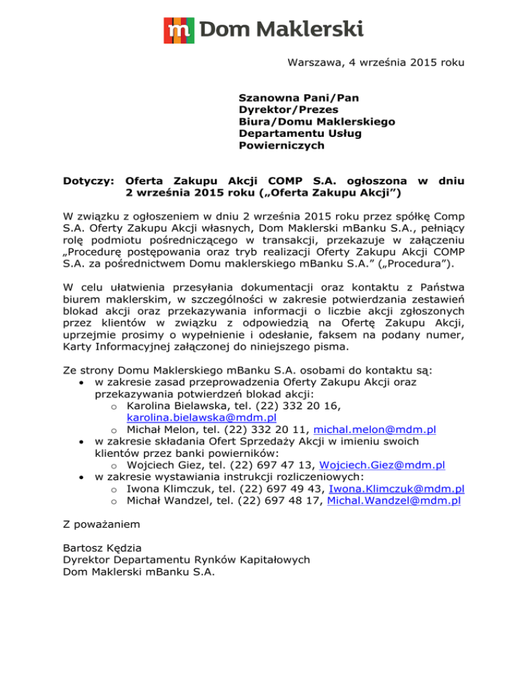 Warszawa, 4 września 2015 roku Szanowna Pani/Pan Dyrektor/Prezes Biura/Domu Maklerskiego Departamentu Usług Powierniczych Dotyczy: Oferta Zakupu Akcji COMP S.A. ogłoszona w dniu 2 września 2015 roku („Oferta Zakupu Akcji”) W związku z ogłoszeniem w dniu 2 września 2015 roku przez spółkę Comp S.A. Oferty Zakupu Akcji własnych, Dom Maklerski mBanku S.A., pełniący rolę podmiotu pośredniczącego w transakcji, przekazuje w załączeniu „Procedurę postępowania oraz tryb realizacji Oferty Zakupu Akcji COMP S.A. za pośrednictwem Domu maklerskiego mBanku S.A.” („Procedura”). W celu ułatwienia przesyłania dokumentacji oraz kontaktu z Państwa biurem maklerskim, w szczególności w zakresie potwierdzania zestawień blokad akcji oraz przekazywania informacji o liczbie akcji zgłoszonych przez klientów w związku z odpowiedzią na Ofertę Zakupu Akcji, uprzejmie prosimy o wypełnienie i odesłanie, faksem na podany numer, Karty Informacyjnej załączonej do niniejszego pisma. Ze strony Domu Maklerskiego mBanku S.A. osobami do kontaktu są: w zakresie zasad przeprowadzenia Oferty Zakupu Akcji oraz przekazywania potwierdzeń blokad akcji: o Karolina Bielawska, tel. (22) 332 20 16, [email protected] o Michał Melon, tel. (22) 332 20 11, [email protected] w zakresie składania Ofert Sprzedaży Akcji w imieniu swoich klientów przez banki powierników: o Wojciech Giez, tel. (22) 697 47 13, [email protected] w zakresie wystawiania instrukcji rozliczeniowych: o Iwona Klimczuk, tel. (22) 697 49 43, [email protected] o Michał Wandzel, tel. (22) 697 48 17, [email protected] Z poważaniem Bartosz Kędzia Dyrektor Departamentu Rynków Kapitałowych Dom Maklerski mBanku S.A. Dom Maklerski mBanku S.A. Departament Rynków Kapitałowych ul. Senatorska 18 00-950 Warszawa fax (22) 33 22 010 KARTA INFORMACYJNA OFERTA ZAKUPU AKCJI COMP S.A. Nazwa podmiotu prowadzącego przedsiębiorstwo maklerskie lub banku powiernika Adres Kod uczestnictwa w KDPW Kod KDPW podmiotu pośredniczącego w transakcji (wypełnia bank powiernik) Osoba odpowiedzialnej za potwierdzanie dokonywania blokady akcji Osoba odpowiedzialnej za wystawienie instrukcji rozliczeniowej Adres e-mail: Tel. Faks Tel. Faks Procedura postępowania oraz tryb realizacji Oferty Zakupu Akcji COMP S.A. z siedzibą w Warszawie za pośrednictwem Domu Maklerskiego mBanku S.A. INSTRUKCJA DO UŻYTKU WEWNĘTRZNEGO Używane oznaczenia: Akcje Zdematerializowane akcje zwykłe na okaziciela spółki COMP S.A., oznaczone przez KDPW kodem ISIN PLCMP0000017, będące przedmiotem Oferty Zakupu ogłoszonej w dniu 2 września 2015 roku przez Spółkę w formie komunikatu bieżącego nr 20/2015 oraz ogłoszonej komunikatem przekazanym do Polskiej Agencji Prasowej Oferta Sprzedaży, Oferta Oferta sprzedaży Akcji składana przez akcjonariuszy Sprzedaży Akcji Spółki w odpowiedzi na Ofertę Zakupu Akcji Oferta, Oferta Zakupu, Oferta zakupu akcji Spółki ogłoszona przez Spółkę w Oferta Zakupu Akcji formie raportu bieżącego i komunikatu przekazanego do Polskiej Agencji Prasowej w dniu 2 września 2015 roku Podmiot Pośredniczący Dom Maklerski mBanku S.A. POK Punkt Obsługi Klienta Domu Maklerskiego Spółka, COMP S.A., Emitent COMP Spółka Akcyjna z siedzibą w Warszawie, ul. Jutrzenki 116 Informacje dotyczące Oferty Zakupu zostały podane do publicznej wiadomości w formie komunikatu bieżącego nr 20/2015 oraz komunikatu przekazanego przez Emitenta do PAP, zostały opublikowane na stronie internetowej Domu Maklerskiego (www.mdm.pl) oraz będą dostępne w POK. I. Informacje ogólne W ramach Oferty Zakupu akcji spółka COMP S.A. z siedzibą w Warszawie, ul. Jutrzenki 116 oferuje Akcjonariuszom Spółki nabycie akcji własnych, będących zdematerializowanymi akcjami zwykłymi na okaziciela, oznaczonymi przez KDPW kodem ISIN PLCMP0000017, w liczbie nie większej niż 158.640 Akcji, co stanowi do 2,68 % ogólnej liczby głosów na Walnym Zgromadzeniu Akcjonariuszy Spółki (oraz 3,21% ogólnej liczby głosów na WZA przy uwzględnieniu braku możliwości wykonywania prawa głosu na WZA przez Comp S.A. wraz z jednostką zależną Spółki – spółką Comp Centrum Innowacji Sp. z o.o., będącą spółką zależną od Spółki w 100%). Walne Zgromadzenie Akcjonariuszy Spółki podjęło w dniu 30 czerwca 2014 roku uchwałę nr 31/2014 w sprawie udzielenia upoważnienia Zarządowi Spółki do nabycia do dnia 31 grudnia 2017 roku do 1.183.637 akcji własnych Spółki, tj. akcji stanowiących do 20,00% wszystkich akcji Spółki oraz do 23,26% ogólnej liczby głosów na WZA, przy uwzględnieniu braku możliwości wykonywania prawa głosu na WZA przez Comp S.A. wraz z jednostką zależną Spółki – spółką Comp Centrum Innowacji Sp. z o.o., będącą spółką zależną od Spółki w 100% (akcje własne). Zgodnie z w/w uchwałą WZA (a) cena zaoferowana przez Spółkę za jedną akcję musi mieścić się w przedziale 30-100 złotych, przy czym w okresie trzech miesięcy od dnia powzięcia w/w uchwały WZA minimalna proponowana kwota zapłaty za jedną akcję wynosić będzie 67 złotych; (b) nabywanie akcji własnych może nastąpić w drodze składania zleceń maklerskich, zawierania transakcji pakietowych, zawierania umów cywilno-prawnych, bądź ogłoszenia wezwania na podstawie przepisów Ustawy lub za pośrednictwem osób trzecich lub powszechnego skupu akcji, przy czym nabywanie akcji własnych odbędzie się w taki sposób, aby zapewnić równe traktowanie wszystkich akcjonariuszy Spółki; (c) nabyte przez Spółkę akcje własne mogą zostać umorzone na podstawie odrębnej uchwały walnego zgromadzenia, lub po uprzednim pozytywnym zaopiniowaniu przez Radę Nadzorczą Spółki mogą zostać przeznaczone do dalszej odsprzedaży, wymiany lub na inny cel określony uchwałą Zarządu, w szczególności dotyczy to przeniesienia posiadania Akcji w związku z prowadzoną działalnością inwestycyjną przez Spółkę, z zastrzeżeniem, i