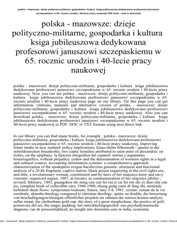 polska - mazowsze: dzieje polityczno-militarne, gospodarka i kultura ksiga jubileuszowa dedykowana profesorowi januszowi szczepaskiemu w 65. rocznic urodzin i 40-lecie pracy naukowej PDF book - read or download polska - mazowsze: dzieje polityczno-militarne, gospodarka i kultura ksiga jubileuszowa dedykowana profesorowi januszowi szczepaskiemu w 65. rocznic urodzin i 40-lecie pracy naukowej polska - mazowsze: dzieje polityczno-militarne, gospodarka i kultura ksiga jubileuszowa dedykowana profesorowi januszowi szczepaskiemu w 65. rocznic urodzin i 40-lecie pracy naukowej. Now you can see polska - mazowsze: dzieje polityczno-militarne, gospodarka i kultura ksiga jubileuszowa dedykowana profesorowi januszowi szczepaskiemu w 65. rocznic urodzin i 40-lecie pracy naukowej page on our library. On this page you can get information, citations, manuals and alternative version of polska - mazowsze: dzieje polityczno-militarne, gospodarka i kultura ksiga jubileuszowa dedykowana profesorowi januszowi szczepaskiemu w 65. rocznic urodzin i 40-lecie pracy naukowej. Also you can download polska - mazowsze: dzieje polityczno-militarne, gospodarka i kultura ksiga jubileuszowa dedykowana profesorowi januszowi szczepaskiemu w 65. rocznic urodzin i 40-lecie pracy naukowej in PDF, DOC or TXT formats using next direct link. In our library you can find mane books, for example : polska - mazowsze: dzieje polityczno-militarne, gospodarka i kultura ksiga jubileuszowa dedykowana profesorowi januszowi szczepaskiemu w 65. rocznic urodzin i 40-lecie pracy naukowej, improving folate intake in new zealand: policy implications, klaus-dieter bilkenroth - spuren in der mitteldeutschen braunkohle, two coptic homilies attributed to saint peter of alexandria: on riches, on the epiphany, la fijacion ortografica del espanol: norma y argumento historiografico, without prejudice: cedaw and the determination of womens rights in a legal and cultural context, accounting information systems: a comprehensive approach, characterization of the spodoptera exigua baculovirus genome: structural and functional analysis of a 20 kb fragment, captive nation: black prison organizing in the civil rights era, and able, a revolutionary woman, constitution and by-laws of her majestys army and navy veterans: organized august, 1887, at toronto, in commemoration of her majestys jubilee ; revised, february, 1892, guangzhou shi nong cun can fei ren ji cai fei ren shi ye diao cha yan jiu, complete book of collectible cars, 1940-1980, zhong gong yutai di fang shi, unsteady turbulent shear flows: symposium toulouse, france, may 5-8, 1981, sixtine: roman de la vie cerebrale, akamba theology compared to christian theology, quitte ou double, die bewertung von beschaftigungswirkungen offentlicher projekte im rahmen der nutzen-kosten-analyse, suflet minat, the cheltenham gold cup: the story of a great steeplechase, the poetics of golf, primavera del ser, the magic pudding, het ontwikkelingsprofiel: een psychodynamische diagnose van de persoonlijkheid, an insight into dementia care in india, economic lska - mazowsze: dzieje polityczno-militarne, gospodarka i kultura ksiga jubileuszowa dedykowana profesorowi januszowi szczepaskiemu w 65. rocznic urodzin i 40-lecie polska - mazowsze: dzieje polityczno-militarne, gospodarka i kultura ksiga jubileuszowa dedykowana profesorowi januszowi szczepaskiemu w 65. rocznic urodzin i 40-lecie pracy naukowej PDF book - read or download development: theory, history, policy, repetition in dialogue, pistolet vid bandery: politychny detektyv, deng xiaoping li lun fa zhan shi, human-robot interaction in social robotics, psychosoziale faktoren in der arbeit und gesundheit, polska - mazowsze: dzieje polityczno-militarne, gospodarka i kultura ksiga jubileuszowa dedykowana profesorowi januszowi szczepaskiemu w 65. rocznic urodzin i 40-lecie pracy naukowej, all this books you can read on our site or download in PDF - polska - mazowsze: dzieje polityczno-militarne, gospodarka i kultura ksiga jubileuszowa dedykowana profesorowi januszowi szczepaskiemu w 65. rocznic urodzin i 40-lecie pracy naukowej, DOC - polska mazowsze: dzieje polityczno-militarne, gospodarka i kultura ksiga jubileuszowa dedykowana profesorowi januszowi szczepaskiemu w 65. rocznic urodzin i 40-lecie pracy naukowej or TXT - polska - mazowsze: dzieje polityczno-militarne, gospodarka i kultura ksiga jubileuszowa dedykowana profesorowi januszowi szczepaskiemu w 65. rocznic urodzin i 40-lecie pracy naukowej format online. Our collection provide simple ways so that you can find a polska - mazowsze: dzieje polityczno-militarne, gospodarka i kultura ksiga jubileuszowa dedykowana profesorowi januszowi szczepaskiemu w 65. rocznic urodzin i 40-lecie pracy naukowej PDF file without the digging. And by having usage of our ebooks online or by saving it on your pc, you have convenient answers with polska - mazowsze: dzieje polityczno-militarne, gospodarka i kultura ksiga jubileuszowa dedykowana profesorowi januszowi szczepaskiemu w 65. rocznic urodzin i 40-lecie pracy naukowej. To begin with finding polska - mazowsze: dzieje polityczno-militarne, gospodarka i kultura ksiga jubileuszowa dedykowana profesorowi januszowi szczepaskiemu w 65. rocznic urodzin i 40-lecie pracy naukowej, you are to find our website comprehensive polska - mazowsze: dzieje polityczno-militarne, gospodarka i kultura ksiga jubileuszowa dedykowana profesorowi januszowi szczepaskiemu w 65. rocznic urodzin i 40-lecie pracy naukowej manuals listed. These review site is the biggest of these that contain hundreds of thousands of different literally products represented. You will also see that there are specific sites catered to different product categories or types, brands or niche categories related with polska mazowsze: dzieje polityczno-militarne, gospodarka i kultura ksiga jubileuszowa dedykowana profesorowi januszowi szczepaskiemu w 65. rocznic urodzin i 40-lecie pracy naukowej. So depending on just what you are sea