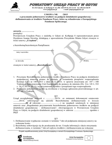 81-332 Gdynia ul. Kołłątaja 8 tel. (58) 620-49-54, 621-11-61 fax (58) 621-06-95 www.pupgdynia.pl e-mail: pup@pupgdynia. pl UMOWA NR /2015 o przyznanie jednorazowo środków na podjęcie działalności gospodarczej – dofinansowania ze środków Funduszu Pracy, które są refundowane z Europejskiego Funduszu Społecznego. zawarta …………….. pomiędzy: Powiatowym Urzędem Pracy z siedzibą w Gdyni ul. Kołłątaja 8 reprezentowanym przez Dyrektora Joannę Siwicką, działającą z upoważnienia Prezydenta Miasta Gdyni zwanym w treści umowy „Urzędem”, a bezrobotną/bezrobotnym PaniąPanem: ........................................................................ imię i nazwisko ............................... nr dowodu ................................ PESEL zwanym w treści umowy „Bezrobotnym”. §1 1. Przyznane Bezrobotnemu jednorazowo środki z Funduszu Pracy na podjęcie działalności gospodarczej stanowią pomoc de minimis, w rozumieniu przepisów rozporządzenia Komisji (UE) nr 1407/2013 z dnia 18.12.2013r. w sprawie stosowania art. 107 i 108 Traktatu o funkcjonowaniu Unii Europejskiej do pomocy de minimis (Dz. Urz. UE L 352 z 24.12.2013r. str. 1) i są przyznawane zgodnie z przepisami tego rozporządzenia. 2. Przyznane jednorazowo środki są zwolnione z wymogu zgłoszenia przewidzianego w art. 107 ust. 1 Traktatu. §2 Urząd uwzględniając wniosek z ................2015r. .ze zmianami dokonanymi ostatecznie ..........2015r. zobowiązuje się udzielić Bezrobotnemu dofinansowanie w kwocie .....................,00 zł (słownie:..................................) na zasadach ustalonych w niniejszej umowie oraz „Regulaminie przyznawania bezrobotnemu jednorazowo środków na podjęcie działalności gospodarczej – dofinansowania”, obowiązującym w Powiatowym Urzędzie Pracy w Gdyni, na podjęcie działalności gospodarczej w zakresie ........................... zgodnie z PKD §3 1. Dofinansowanie wypłacone zostanie w terminie 7 dni od podpisania niniejszej umowy na wskazane konto. 2. Bezrobotny zobowiązuje się do przekazania do tut. Urzędu informacji o dacie otrzymania dofinansowania, w terminie 7 dni od wpływu środków z dofinansowania na wskazane Projekt współfinansowany przez Unię Europejską w ramach Europejskiego Funduszu Społecznego konto. §4 1. Bezrobotny zobowiązuje się do: 1) podjęcia działalności gospodarczej nie wcześniej niż następnego dnia po wpływie środków na wskazane konto; 2) podjęcia działalności gospodarczej do dnia ............................... 3) podjęcia i prowadzenia działalności w sposób nieprzerwany przez 12 miesięcy w zakresie o którym mowa w § 2; do okresu prowadzenia działalności gospodarczej zalicza się przerwy w jej prowadzeniu z powodu choroby lub korzystania ze świadczenia rehabilitacyjnego; termin 12 miesięcy liczony jest zgodnie z art. 112 i 115 Kodeksu Cywilnego tj. 1)) termin oznaczony w miesiącach kończy się z upływem dnia, który nazwą lub datą odpowiada początkowemu dniowi terminu, a gdyby takiego dnia w ostatnim miesiącu nie było – w ostatnim dniu tego miesiąca; 2)) jeżeli koniec terminu przypada na dzień uznany ustawowo za wolny od pracy, termin upływa dnia następnego. 4) udokumentowania terminu rozpoczęcia działalności gospodarczej poprzez przedstawienie czytelnej kserokopii (potwierdzonej za zgodność z oryginałem przez Bezrobotnego) następujących dokumentów: 1)) CEIDG-1 Wniosek o Wpis do Centralnej Ewidencji i Informacji Działalności Gospodarczej; 2)) potwierdzenie rejestracji w CEIDG wraz z nadanym Numerem REGON; 3)) potwierdzenia zgłoszenia działalności gospodarczej do Zakładu Ubezpieczeń Społecznych ( ZUS ZUA lub potwierdzenie okresu ubezpieczenia); 5) wydatkowania przyznanych środków na podjęcie działalności gospodarczej, zgodnie ze specyfikacją określoną we wniosku o którym mowa w § 2. Ewentualna zmiana zakupów określonych w wyżej wymienionym wniosku wymaga uprzedniej akceptacji Urzędu; zaakceptowana zmiana nie zmienia określonych w umowie terminów. 6) Rozliczenia wydatkowanych środków, w terminie 2 miesięcy od dnia podjęcia działalności gospodarczej; przy czym: 1)) w celu monitorowania zakupów złożenia w Urzędzie w terminie 40 dni kalendarzowych od dnia podjęcia działalności gospodarczej rozliczenia zgodnie ze wzorem stanowiącym załącznik nr 3 do umowy, zawierającego zestawienie kwot wydatkowanych od dnia zawarcia umowy o dofinansowanie, na poszczególne towary i usługi ujęte we wniosku, o którym mowa w § 2 z uwzględnieniem podatku od towarów i usług, a także informacji, czy bezrobotnemu przysługuje prawo do obniżenia kwoty podatku należnego o kwotę podatku naliczonego zawartego w wykazywanych wydatkach lub prawo do zwrotu podatku naliczonego. 2)) w terminie 2 miesięcy od dnia podjęcia działalności gospodarczej- zwrotu dofinansowania otrzymanego, a niewydatkowanego przez bezrobotnego lub nieuznanego przez Urząd jako wydatku prawidłowo poniesionego, co stanowi o ostatecznym rozliczeniu wydatkowanych środków. 7) zwrotu równowartości odliczonego lub zwróconego zgodnie z ustawą z dnia 11 marca 2004 r. o podatku od towarów i usług podatku naliczonego dotyczącego zakupionych towarów i usług w ramach przyznanego dofinansowania w terminie: 1)) 90 dnia od dnia złożenia przez Bezrobotnego deklaracji podatkowej dotyczącej podatku od towarów i usług, w której wykazano kwotę podatku naliczonego z tego tytułu - w przypadku, gdy z deklaracji za dany okres rozliczeniowy wynika kwota podatku podlegająca wpłacie do urzędu skarbowego lub kwota do przeniesienia na Strona 2 z 7 następny okres rozliczeniowy, 2)) 30 dni od dnia dokonania przez urząd skarbowy zwrotu podatku na rzecz Bezrobotnego- w przypadku, gdy z deklaracji podatkowej dotyczącej podatku od towarów i usług, w której wykazano kwotę podatku naliczonego z tego tytułu, za dany okres rozliczeniowy, wynika kwota do zwrotu.
