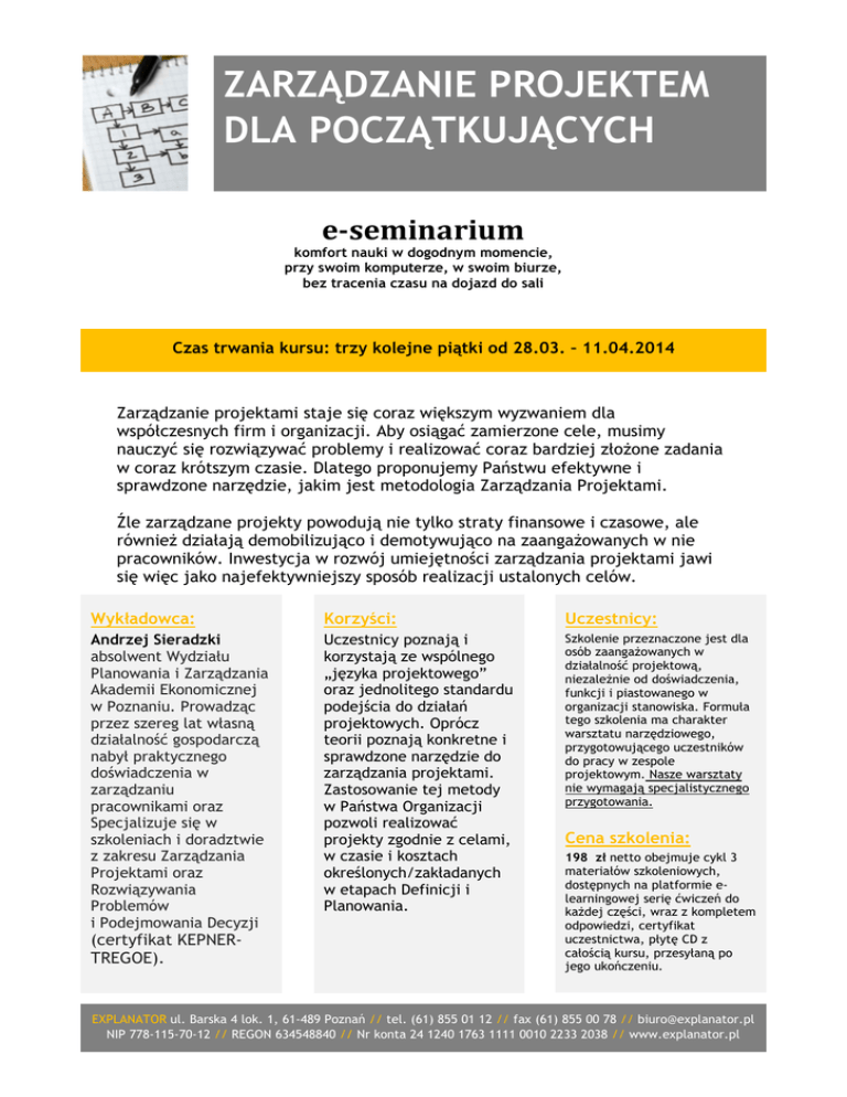 ZARZĄDZANIE PROJEKTEM DLA POCZĄTKUJĄCYCH e-seminarium komfort nauki w dogodnym momencie, przy swoim komputerze, w swoim biurze, bez tracenia czasu na dojazd do sali Czas trwania kursu: trzy kolejne piątki od 28.03. – 11.04.2014 Zarządzanie projektami staje się coraz większym wyzwaniem dla współczesnych firm i organizacji. Aby osiągać zamierzone cele, musimy nauczyć się rozwiązywać problemy i realizować coraz bardziej złożone zadania w coraz krótszym czasie. Dlatego proponujemy Państwu efektywne i sprawdzone narzędzie, jakim jest metodologia Zarządzania Projektami. Źle zarządzane projekty powodują nie tylko straty finansowe i czasowe, ale również działają demobilizująco i demotywująco na zaangażowanych w nie pracowników. Inwestycja w rozwój umiejętności zarządzania projektami jawi się więc jako najefektywniejszy sposób realizacji ustalonych celów. Wykładowca: Korzyści: Uczestnicy: Andrzej Sieradzki absolwent Wydziału Planowania i Zarządzania Akademii Ekonomicznej w Poznaniu. Prowadząc przez szereg lat własną działalność gospodarczą nabył praktycznego doświadczenia w zarządzaniu pracownikami oraz Specjalizuje się w szkoleniach i doradztwie z zakresu Zarządzania Projektami oraz Rozwiązywania Problemów i Podejmowania Decyzji Uczestnicy poznają i korzystają ze wspólnego „języka projektowego” oraz jednolitego standardu podejścia do działań projektowych. Oprócz teorii poznają konkretne i sprawdzone narzędzie do zarządzania projektami. Zastosowanie tej metody w Państwa Organizacji pozwoli realizować projekty zgodnie z celami, w czasie i kosztach określonych/zakładanych w etapach Definicji i Planowania. Szkolenie przeznaczone jest dla osób zaangażowanych w działalność projektową, niezależnie od doświadczenia, funkcji i piastowanego w organizacji stanowiska. Formuła tego szkolenia ma charakter warsztatu narzędziowego, przygotowującego uczestników do pracy w zespole projektowym. Nasze warsztaty nie wymagają specjalistycznego przygotowania. (certyfikat KEPNERTREGOE). Cena szkolenia: 198 zł netto obejmuje cykl 3 materiałów szkoleniowych, dostępnych na platformie elearningowej serię ćwiczeń do każdej części, wraz z kompletem odpowiedzi, certyfikat uczestnictwa, płytę CD z całością kursu, przesyłaną po jego ukończeniu. EXPLANATOR ul. Barska 4 lok. 1, 61-489 Poznań // tel. (61) 855 01 12 // fax (61) 855 00 78 // [email protected] NIP 778-115-70-12 // REGON 634548840 // Nr konta 24 1240 1763 1111 0010 2233 2038 // www.explanator.pl UMOWA — ZGŁOSZENIE UCZESTNICTWA Czytelnie wypełnione zgłoszenie prosimy przesłać faksem na nr: (61) 855 00 78 Szczegółowy program Program kursu: MODUŁ I – start kursu – 28.03.2014 Etap definicji i inicjacji projektu 1. Definicja i sformułowanie projektu 2. Ustalanie celów projektu 3. Definiowanie ograniczeń projektu 4. Struktura podziału pracy w projekcie 5. Określane zasobów projektowych Niniejszym zgłaszamy udział następujących osób w warsztatach: Zarządzanie projektem dla początkujących e-seminarium 28.03 – 11.04.2014 r. 1. E-mail uczestnika: 2. Test sprawdzający MODUŁ II – 04.04.2014 Etap planowania projektu 1. Podział odpowiedzialności w projekcie 2. Kolejność działań w projekcie 3. Harmonogram działań w projekcie 4. Harmonogram zasobów w projekcie 5. Zabezpieczenie realizacji projektu Zadanie sprawdzające E-mail uczestnika: 3. E-mail uczestnika: Nazwa firmy: NIP: MODUŁ III – 11.04.2014 Etapy wdrożenia i ewaluacji projektu 1. Rozpoczęcie realizacji projektu 2. Monitoring projektu 3. Modyfikacje projektu 4. Elementy zamknięcia i oceny projektu 5. Czynniki sukcesu (key factors) realizacji projektu Zadanie sprawdzające: test wiedzy Koszty udziału w szkoleniu dla 1 osoby: 198 zł netto Ulica: Miejscowość i kod: Nr telefonu: Faks: …………………………………………………………………………………. Informacje dodatkowe: • Po przesłaniu niniejszego zgłoszenia otrzymają Państwo potwierdzenie jego przyjęcia, szczegóły organizacyjne oraz fakturę pro-forma. Faktura VAT zostanie wystawiona po dokonaniu płatności. • Niedokonanie wpłaty nie jest rezygnacją z uczestnictwa w szkoleniu. Rezygnacji dokonać można wyłącznie w formie pisemnej najpóźniej w terminie 5 dni roboczych przed terminem szkolenia. • Niedotrzymanie powyższych warunków skutkuje obciążeniem zgłaszającego pełnymi kosztami udziału. Explanator zastrzega sobie możliwość odwołania lub zmiany terminu szkolenia. • Zmiana może nastąpić na co najmniej 3 dni przed planowanym terminem. W przypadku odwołania szkolenia Explanator dokona zwrotu wpłaconych kosztów uczestnictwa w terminie 5 dni roboczych. Rabaty: 5% przy zgłoszeniu 2 i 3 osób, 10% przy zgłoszeniu powyżej 3 osób WEB/14 Data i podpis zamawiającego Pieczątka Wyrażam zgodę na przechowywanie i przetwarzanie moich danych osobowych dla potrzeb procesu rejestracji zgłoszenia oraz w celach marketingowych dla firmy Explanator zgodnie z ustawą z dnia 29.08.1997 r. o ochronie danych osobowych (Dz. U. nr 133 poz. 883) oraz z ustawą z dnia 18.07.2002 r. o świadczeniu usług drogą elektroniczną (Dz. U. nr 144 poz. 1204).