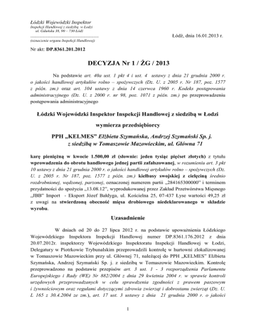 Łódzki Wojewódzki Inspektor Inspekcji Handlowej z siedzibą w Łodzi ul. Gdańska 38, 90 – 730 Łódź Łódź, dnia 16.01.2013 r. ..................................................... (oznaczenie organu Inspekcji Handlowej) Nr akt: DP.8361.201.2012 DECYZJA Nr 1 / ŻG / 2013 Na podstawie art. 40a ust. 1 pkt 4 i ust. 4 ustawy z dnia 21 grudnia 2000 r. o jakości handlowej artykułów rolno – spożywczych (Dz. U. z 2005 r. Nr 187, poz. 1577 z późn. zm.) oraz art. 104 ustawy z dnia 14 czerwca 1960 r. Kodeks postępowania administracyjnego (Dz. U. z 2000 r. nr 98, poz. 1071 z późn. zm.) po przeprowadzeniu postępowania administracyjnego Łódzki Wojewódzki Inspektor Inspekcji Handlowej z siedzibą w Łodzi wymierza przedsiębiorcy PPH „KELMES” Elżbieta Szymańska, Andrzej Szymański Sp. j. z siedzibą w Tomaszowie Mazowieckim, ul. Główna 71 karę pieniężną w kwocie 1.500,00 zł (słownie: jeden tysiąc pięćset złotych) z tytułu wprowadzenia do obrotu handlowego jednej partii zafałszowanej, w rozumieniu art. 3 pkt 10 ustawy z dnia 21 grudnia 2000 r. o jakości handlowej artykułów rolno – spożywczych (Dz. U. z 2005 r. Nr 187, poz. 1577 z późn. zm.) kiełbasy swojskiej z cielęciną średnio rozdrobnionej, wędzonej, parzonej, oznaczonej numerem partii „284165300000” i terminem przydatności do spożycia „13.08.12”, wyprodukowanej przez Zakład Przetwórstwa Mięsnego „JBB” Import - Eksport Józef Bałdyga, ul. Kościelna 25, 07-437 Łyse wartości 49,25 zł z uwagi na stwierdzoną obecność mięsa drobiowego niedeklarowanego w składzie wyrobu. Uzasadnienie W dniach od 20 do 27 lipca 2012 r. na podstawie upoważnienia Łódzkiego Wojewódzkiego Inspektora Inspekcji Handlowej numer DP.8361.176.2012 z dnia 20.07.2012r. inspektorzy Wojewódzkiego Inspektoratu Inspekcji Handlowej w Łodzi, Delegatury w Piotrkowie Trybunalskim przeprowadzili kontrolę w hurtowni zlokalizowanej w Tomaszowie Mazowieckim przy ul. Głównej 71, należącej do PPH „KELMES” Elżbieta Szymańska, Andrzej Szymański Sp. j. z siedzibą w Tomaszowie Mazowieckim. Kontrolę przeprowadzono na podstawie przepisów art. 3 ust. 1 - 3 rozporządzenia Parlamentu Europejskiego i Rady (WE) Nr 882/2004 z dnia 29 kwietnia 2004 r. w sprawie kontroli urzędowych przeprowadzanych w celu sprawdzenia zgodności z prawem paszowym i żywnościowym oraz regułami dotyczącymi zdrowia zwierząt i dobrostanu zwierząt (Dz. U. L 165 z 30.4.2004 ze zm.), art. 17 ust. 3 ustawy z dnia 21 grudnia 2000 r. o jakości 1 handlowej artykułów rolno-spożywczych (Dz. U. z 2005 r. nr 187, poz. 1577, z późn. zm.), art. 3 ust. 1 pkt 1, 2 i 6 ustawy z dnia 15 grudnia 2000 r. o Inspekcji Handlowej (Dz. U. z 2009 r. Nr 151, poz. 1219 ze zm.) w obecności wspólnika Elżbiety Szymańskiej. W toku kontroli w dniu 20 lipca 2012 r. z partii liczącej 3 opakowania o masie 2,522 kg pobrano do badań laboratoryjnych próbkę kiełbasy swojskiej z cielęciną średnio rozdrobnionej, wędzonej, parzonej, oznaczonej numerem partii „284165300000” i terminem przydatności do spożycia „13.08.12”, wyprodukowanej przez Zakład Przetwórstwa Mięsnego „JBB” Import - Eksport Józef Bałdyga, ul. Kościelna 25, 07-437 Łyse. Próbka przedmiotowej kiełbasy została opisana w protokóle pobrania próbki produktu numer 00149 i przekazana do Laboratorium Kontrolno-Analitycznego Urzędu Ochrony Konkurencji i Konsumentów w Warszawie, ul. Sienkiewicza 3 celem przeprowadzenia badań organoleptycznych i fizyczno-chemicznych. W wyniku przeprowadzonych analiz stwierdzono, że badana próbka nie odpowiadała deklaracji podanej na opakowaniu ze względu na obecność mięsa drobiowego niedeklarowanego w składzie wyrobu. Na etykiecie dołączonej do produktu w wykazie składników poza wodą, substancjami dodatkowymi i przyprawami wykazano mięso wieprzowe 90,1% i cielęcinę 2%. Po zapoznaniu się z wynikami badań przedsiębiorca oświadczył (pismo z dnia 16 sierpnia 2012 r.), iż rezygnuje z badania próbki kontrolnej, która została pobrana w trakcie tej samej kontroli za protokołem pobrania próbki kontrolnej numer 00150 w ilości 0,717 kg (jedno opakowanie). Stwierdzone nieprawidłowości zostały udokumentowane w sprawozdaniu z badań numer 419/2012 z dnia 07 sierpnia 2012 r. wydanym przez Laboratorium Kontrolno – Analityczne Urzędu Ochrony Konkurencji I Konsumentów w Warszawie, ul. Sienkiewicza 3 oraz w protokole kontroli numer DP.8361.201.2012 z dnia 16 sierpnia 2012 r. W związku ze stwierdzoną nieprawidłowością w dniu 16 listopada 2012 r. zostało wszczęte z urzędu postępowanie administracyjne w przedmiocie wymierzenia, na podstawie art. 40 a ust. 1 pkt 4 ustawy z dnia 21 grudnia o jakości handlowej artykułów rolno – spożywczych (Dz. U. z 2005 r. nr187, poz. 1577, z późn. zm.) zwanej dalej „ustawą o jakości”, kary pieniężnej z tytułu wprowadzenia do obrotu zafałszowanego środka spożywczego. Strona została poinformowana o wszczęciu postępowania z urzędu oraz o przysługującym prawie do zapoznania się z aktami sprawy, wypowiedzenia się co do zebranych dowodów i materiałów, lecz z tego prawa nie skorzystała. Jednocześnie poproszono stronę o przesłanie informacji na temat wielkości przychodu i obrotu spółki za rok 2011, lecz strona tej informacji nie przekazała. Przedmiotowe pismo zostało odebrane w dniu 19 listopada 2012 r. W dniu 12 grudnia 2012 r. pismem numer DP.8361.201.2012 poinformowano stronę o przedłużeniu terminu zakończenia toczącego się postępowania administracyjnego i ponownie poproszono o przesłanie informacji na temat wielkości przychodu i obrotu za rok 2011. Przedmiotowe pismo zostało odebrane przez stronę w dniu 14 grudnia 2012 r. Również 2 w tym przypadku strona nie przesłała informacji na temat wielkości przychodu i obrotu za rok 2011. Łódzki Wojewódzki Inspektor Inspekcji Handlowej z siedzibą w Łodzi mając na uwadze powyższe