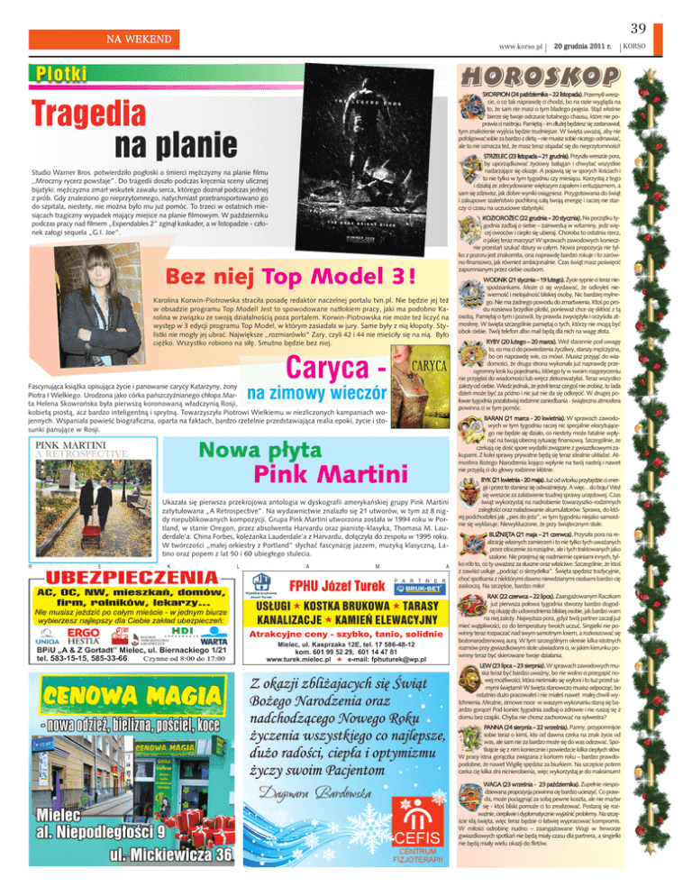 39 NA W E K E N D www.korso.pl 20 grudnia 2011 r. Plotki SKORPION (24 października – 22 listopada). Przemyśl wreszcie, o co tak naprawdę ci chodzi, bo na razie wygląda na to, że sam nie masz o tym bladego pojęcia. Stąd właśnie bierze się twoje odczucie totalnego chaosu, które nie poprawia ci nastroju. Pamiętaj - im dłużej będziesz się zastanawiał, tym znalezienie wyjścia będzie trudniejsze. W święta uważaj, aby nie pofolgować sobie za bardzo z dietą – nie musisz sobie niczego odmawiać, ale to nie oznacza też, że masz teraz objadać się do nieprzytomności! Tragedia na planie STRZELEC (23 listopada – 21 grudnia). Przyszła wreszcie pora, by uporządkować życiowy bałagan i chwytać wszystkie nadarzające się okazje. A pojawią się w sporych ilościach i to nie tylko w tym tygodniu czy miesiącu. Korzystaj z tego i działaj ze zdecydowanie większym zapałem i entuzjazmem, a sam się zdziwisz, jak dobre wyniki osiągniesz. Przygotowania do świąt i zakupowe szaleństwo pochłoną całą twoją energię i raczej nie starczy ci czasu na uczuciowe statystyki. Studio Warner Bros. potwierdziło pogłoski o śmierci mężczyzny na planie filmu ,,Mroczny rycerz powstaje”. Do tragedii doszło podczas kręcenia sceny ulicznej bijatyki: mężczyzna zmarł wskutek zawału serca, którego doznał podczas jednej z prób. Gdy znaleziono go nieprzytomnego, natychmiast przetransportowano go do szpitala, niestety, nie można było mu już pomóc. To trzeci w ostatnich miesiącach tragiczny wypadek mający miejsce na planie filmowym. W październiku podczas pracy nad filmem „Expendables 2” zginął kaskader, a w listopadzie - członek załogi sequela „G.I. Joe”. KOZIOROŻEC (22 grudnia – 20 stycznia). Na początku tygodnia zadbaj o siebie – zainwestuj w witaminy, jedz więcej owoców i ciepło się ubieraj. Choroba to ostatnia rzecz, o jakiej teraz marzysz! W sprawach zawodowych koniecznie przestań szukać dziury w całym. Nowa propozycja nie tylko z pozoru jest znakomita, ona naprawdę bardzo rokuje i to zarówno finansowo, jak również ambicjonalnie. Czas świąt masz poświęcić zapomnianym przez ciebie osobom. Bez niej Top Model 3! Karolina Korwin-Piotrowska straciła posadę redaktor naczelnej portalu tvn.pl. Nie będzie jej też w obsadzie programu Top Model! Jest to spowodowane natłokiem pracy, jaki ma podobno Karolina w związku ze swoją działalnością poza portalem. Korwin-Piotrowska nie może też liczyć na występ w 3 edycji programu Top Model, w którym zasiadała w jury. Same były z nią kłopoty. Stylistki nie mogły jej ubrać. Największe ,,rozmiarówki" Zary, czyli 42 i 44 nie mieściły się na nią. Było ciężko. Wszystko robiono na siłę. Smutno będzie bez niej. Caryca Fascynująca książka opisująca życie i panowanie carycy Katarzyny, żony Piotra I Wielkiego. Urodzona jako córka pańszczyźnianego chłopa Marta Helena Skowrońska była pierwszą koronowaną władczynią Rosji, kobietą prostą, acz bardzo inteligentną i sprytną. Towarzyszyła Piotrowi Wielkiemu w niezliczonych kampaniach wojennych. Wspaniała powieść biograficzna, oparta na faktach, bardzo rzetelnie przedstawiająca realia epoki, życie i stosunki panujące w Rosji. na zimowy wieczór Pink Martini Ukazała się pierwsza przekrojowa antologia w dyskografii amerykańskiej grupy Pink Martini zatytułowana „A Retrospective”. Na wydawnictwie znalazło się 21 utworów, w tym aż 8 nigdy niepublikowanych kompozycji. Grupa Pink Martini utworzona została w 1994 roku w Portland, w stanie Oregon, przez absolwenta Harvardu oraz pianistę-klasyka, Thomasa M. Lauderdale’a. China Forbes, koleżanka Lauderdale’a z Harvardu, dołączyła do zespołu w 1995 roku. W twórczości „małej orkiestry z Portland” słychać fascynację jazzem, muzyką klasyczną, Latino oraz popem z lat 50 i 60 ubiegłego stulecia. E K L A M RYBY (20 lutego – 20 marca). Weź starannie pod uwagę to, co ma ci do powiedzenia życzliwy, starszy mężczyzna, bo on naprawdę wie, co mówi. Musisz przyjąć do wiadomości, że druga strona wykonała już naprawdę przeogromny krok ku pojednaniu, którego ty w swoim rozgoryczeniu nie przyjęłaś do wiadomości lub wręcz zlekceważyłaś. Teraz wszystko zależy od ciebie. Wiedz jednak, że jeżeli teraz czegoś nie zrobisz, to lada dzień może być za późno i nic już nie da się odkręcić. W drugiej połowie tygodnia pozałatwiaj rodzinne zaniedbania - świąteczna atmosfera powinna ci w tym pomóc. BARAN (21 marca - 20 kwietnia). W sprawach zawodowych w tym tygodniu raczej nic specjalnie ekscytującego nie będzie się działo, co niestety może fatalnie wpłynąć na twoją obecną sytuację finansową. Szczególnie, że czekają cię dość spore wydatki związane z gwiazdkowymi zakupami. Z kolei sprawy prywatne będą się teraz idealnie układać. Atmosfera Bożego Narodzenia kojąco wpłynie na twój nastrój i nawet nie przyjdą ci do głowy rodzinne kłótnie. Nowa płyta R WODNIK (21 stycznia – 19 lutego). Życie sypnie ci teraz niespodziankami. Może ci się wydawać, że odkryłeś niewierność i nielojalność bliskiej osoby. Nic bardziej mylnego. Nie ma żadnego powodu do zmartwienia. Ktoś po prostu rozsiewa brzydkie plotki, ponieważ chce cię skłócić z tą osobą. Pamiętaj o tym i pozwól, by prawda zwyciężyła i oczyściła atmosferę. W święta szczególnie pamiętaj o tych, którzy nie mogą być obok ciebie. Twój telefon albo mail będą dla nich na wagę złota. A BYK (21 kwietnia - 20 maja). Już od wtorku przybędzie ci energii i przez to staniesz się odważniejszy. A więc... do boju! Weź się wreszcie za załatwienie trudnej sprawy urzędowej. Czas świąt wykorzystaj na nadrobienie towarzyszko-rodzinnych zaległości oraz naładowanie akumulatorów. Sprawa, do której podchodziłeś jak „pies do jeża”, w tym tygodniu niejako samoistnie się wyklaruje. Niewykluczone, że przy świ
