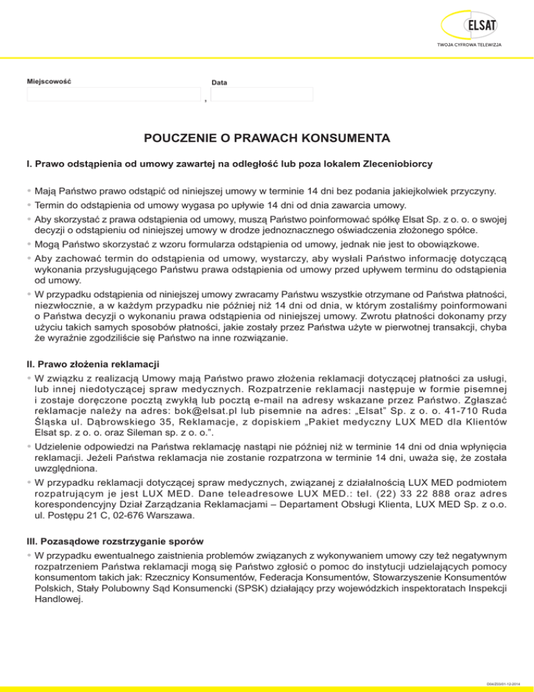 Miejscowość Data , POUCZENIE O PRAWACH KONSUMENTA I. Prawo odstąpienia od umowy zawartej na odległość lub poza lokalem Zleceniobiorcy M ają Państwo prawo odstąpić od niniejszej umowy w terminie 14 dni bez podania jakiejkolwiek przyczyny. T ermin do odstąpienia od umowy wygasa po upływie 14 dni od dnia zawarcia umowy. A by skorzystać z prawa odstąpienia od umowy, muszą Państwo poinformować spółkę Elsat Sp. z o. o. o swojej decyzji o odstąpieniu od niniejszej umowy w drodze jednoznacznego oświadczenia złożonego spółce. M ogą Państwo skorzystać z wzoru formularza odstąpienia od umowy, jednak nie jest to obowiązkowe. A by zachować termin do odstąpienia od umowy, wystarczy, aby wysłali Państwo informację dotyczącą wykonania przysługującego Państwu prawa odstąpienia od umowy przed upływem terminu do odstąpienia od umowy. W przypadku odstąpienia od niniejszej umowy zwracamy Państwu wszystkie otrzymane od Państwa płatności, niezwłocznie, a w każdym przypadku nie później niż 14 dni od dnia, w którym zostaliśmy poinformowani o Państwa decyzji o wykonaniu prawa odstąpienia od niniejszej umowy. Zwrotu płatności dokonamy przy użyciu takich samych sposobów płatności, jakie zostały przez Państwa użyte w pierwotnej transakcji, chyba że wyraźnie zgodziliście się Państwo na inne rozwiązanie. II. Prawo złożenia reklamacji W związku z realizacją Umowy mają Państwo prawo złożenia reklamacji dotyczącej płatności za usługi, lub innej niedotyczącej spraw medycznych. Rozpatrzenie reklamacji następuje w formie pisemnej i zostaje doręczone pocztą zwykłą lub pocztą e-mail na adresy wskazane przez Państwo. Zgłaszać reklamacje należy na adres: [email protected] lub pisemnie na adres: „Elsat” Sp. z o. o. 41-710 Ruda Śląska ul. Dąbrowskiego 35, Reklamacje, z dopiskiem „Pakiet medyczny LUX MED dla Klientów Elsat sp. z o. o. oraz Sileman sp. z o. o.”. U dzielenie odpowiedzi na Państwa reklamację nastąpi nie później niż w terminie 14 dni od dnia wpłynięcia reklamacji. Jeżeli Państwa reklamacja nie zostanie rozpatrzona w terminie 14 dni, uważa się, że została uwzględniona. W przypadku reklamacji dotyczącej spraw medycznych, związanej z działalnością LUX MED podmiotem rozpatrującym je jest LUX MED. Dane teleadresowe LUX MED.: tel. (22) 33 22 888 oraz adres korespondencyjny Dział Zarządzania Reklamacjami – Departament Obsługi Klienta, LUX MED Sp. z o.o. ul. Postępu 21 C, 02-676 Warszawa. III. Pozasądowe rozstrzyganie sporów W przypadku ewentualnego zaistnienia problemów związanych z wykonywaniem umowy czy też negatywnym rozpatrzeniem Państwa reklamacji mogą się Państwo zgłosić o pomoc do instytucji udzielających pomocy konsumentom takich jak: Rzecznicy Konsumentów, Federacja Konsumentów, Stowarzyszenie Konsumentów Polskich, Stały Polubowny Sąd Konsumencki (SPSK) działający przy wojewódzkich inspektoratach Inspekcji Handlowej. D04/Z03/01-12-2014