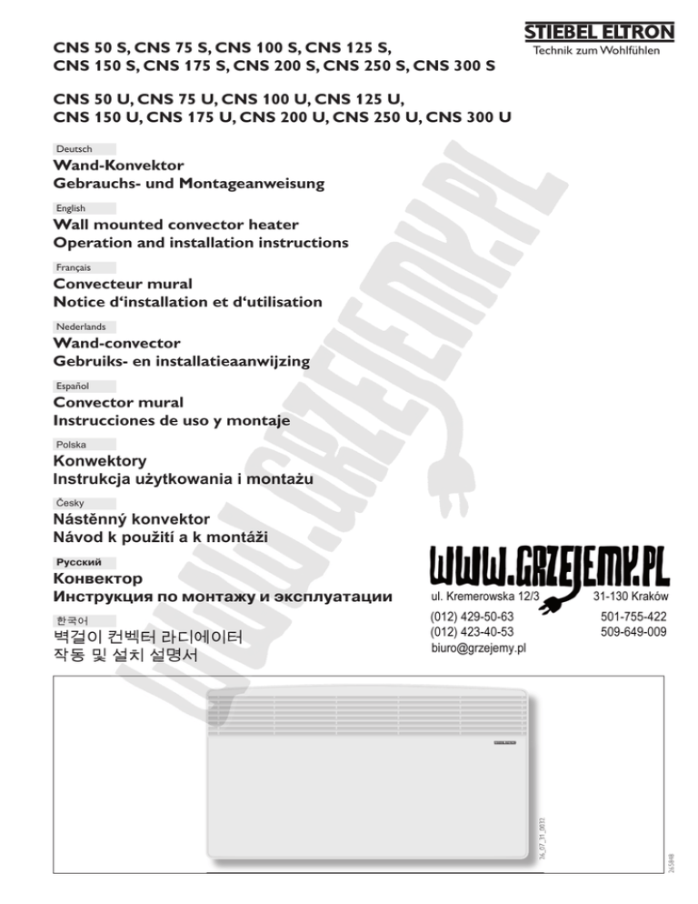 CNS50S,CNS75S,CNS100S,CNS125S, CNS150S,CNS175S,CNS200S,CNS250S,CNS300S Technik zum Wohlfühlen CNS50U,CNS75U,CNS100U,CNS125U, CNS150U,CNS175U,CNS200U,CNS250U,CNS300U Deutsch Wand-Konvektor Gebrauchs-undMontageanweisung English Wallmountedconvectorheater Operationandinstallationinstructions Français Convecteurmural Noticed‘installationetd‘utilisation Nederlands Wand-convector Gebruiks-eninstallatieaanwijzing Español Convectormural Instruccionesdeusoymontaje Polska Konwektory Instrukcja użytkowania i montażu Česky Nástěnný konvektor Návod k použití a k montáži Pyccкий Êонвектор Инструкцияпомонтажуиэксплуатации 한국어 65848 6_07_31_003 벽걸이 컨벡터 라디에이터 작동 및 설치 설명서 Inhaltsverzeichnis Deutsch Seite 4 - 7 Inhoudsoverzicht Nederlandsbladzijde 14 - 16 Česky 1. Gebrauchsanweisung 1.1 Gerätebeschreibung 1.2 Bedienung 1.3 Sicherheitshinweise 1.4 Pflege und Wartung Was tun wenn . . .? 2.Montageanweisung 2.1 Geräteaufbau 2.2 Vorschriften und Bestimmungen 2.3 Montage 2.4 Elektrischer Anschluss 2.5 Übergabe Technische Daten 3.Umwelt und Recycling 4.Kundendienst und Garantie 1. Gebruiksaanwijzing 1.1 Toestelbeschrijving 1.2 Bediening 1.3 Veiligheidsaanwijzingen 1.4 Verzorging en onderhoud Wat te doen als . . .? 2.Montageaanwijzing 2.1 Opbouw van het toestel 2.2 Voorschriften en bepalingen 2.3 Montage 2.4 Elektrische aansluiting 2.5 Overdracht Technische gegevens 3.Milieu en recycling 4.Garantie 23 Oetovn Co dlat, kdy . . .? 24 Instrukce 24 P a ustanoven jka Technick data5 5 5 4 5 5 6 6 7 Table of contents English page 8 - 10 Índice Español 1. Operating instructions 1.1 Description 1.2 Operation 1.3 Safety notes 1.4 Care and maintenance What to do if . . .? 2.Installation instructions 2.1 Structure of unit 2.2 Provisions and specifications 2.3 Installation 2.4 Electrical connection 2.5 Handover Technical data 3.Environment and recycling 4.Guarantee 1. Instrucciones de uso 1.1 Descripción del aparato 1.2 Manejo 1.3 Indicaciones de seguridad 1.4 Cuidados y mantenimiento ¿Qué hacer cuando . . .? 2.Instrucciones de montaje 2.1 Componentes del aparato 2.2 Reglamentos e instrucciones 2.3 Montaje 2.4 Conexionado eléctrico 2.5 Entrega Datos técnicos 3.Medio ambiente y reciclaje 4.Garantía 8 9 9 10 10 10 14 15 15 16 16 16 Páginas 17 - 19 17 18 18 19 19 19 Table des matières Français page 11 - 13 20 22 1. Notice d‘utilisation 1.1 Description de l‘appareil 1.2 Fonctionnement 1.3 Consignes de sécurité 1.4 Entretien et maintenance Que faire quand . . .? 2.Instructions de montage 2.1 Composition de l‘appareil 2.2 Normes et spécifications 2.3 Montage 2.4 Raccordement électrique 2.5 Remise de l‘appareil Caractéristique techniques 3.Environment et recyclage 4.Garantie 20 C i k Co robi, gdy ? 21 21 Dane techniczne 22 2 2 11 12 12 13 13 13 23 25 Coдepжaние PyccкийСтраница 26 - 28 1. Инструкция по эксплуатации 26 1.1 Описание прибора 1.2 Обслуживание 1.3 Указания по безопасности 1.4 Уход и техническое обслуживание Что делать, если . . . ? 2. Инструкция по монтажу 27 2.1 Составляющие прибора 2.2 Указания по безопасности 2.3 Монтаж 2.4 Электрическое подключение 2.5 Сдача в эксплуатацию Технические характеристики 28 3.Окружающая среда и вторсырьё 28 4.Гарантия 28 목차 한국어 페이지 29-31 1. 사용 설명서 1.1 상세설명서 1.2 사용 1.3 설치 시 주의사항 1.4 관리 및 유지 이럴 땐 어떻게 해야 하나요…? 2. 설치 설명서 2.1 제품 구조 2.2 설치 시 주의사항 2.3 설치 2.4 전기 연결 2.5 의무사항 기술정보 3. 환경과 재활용 4. 보증 29 29 30 30 30 30 c a a d A 5 b b aI II C26_07_31_0035 B C26_07_31_0036 163 mm c 261 mm ≥ 500 mm C26_07_31_0034 ≥ 100 mm ≥ 150 mm C26_07_31_0033 450 B 100 80 4 1 7 5 A ≥ 100 mm ≥ 100 mm C d 6 b 5 b 1. Instrukcja obsługi dla Użytkownika i Instalatora 1 Wyłącznik wł. / wył. 2 Pokrętło doboru temperatury 3 Sztyfty ograniczające W celu uniknięcia potencjalnego ryzyka pożaru lub porażenia prądem elektrycznym użytkowanie urządzeń elektrycznych musi być zgodne z obowiązującymi w tym zakresie przepisami. W związku z powyższym urządzenie należy użytkować zgodnie z wskazówkami zaleceniami zawartymi w niniejszej instrukcji. Każde użycie konwektora niezgodne z zaleceniami producenta może spowodować uszkodzenie urządzenia lub niebezpieczeństwo dla zdrowia Użytkownika. Należy zwrócić uwagę na prawidłowy dobór mocy grzewczej konwektora do zapotrzebowania ciepła pomieszczenia. Przed rozpoczęciem eksploatacji urządzenia należy przeczytać starannie niniejszą instrukcję i przestrzegać jej zaleceń. Niniejszą instrukcję obsługi należy starannie przechować i w przypadku sprzedaży urządzenia przekazać ją nowemu właścicielowi. W przypadku napraw lub konserwacji konwektora instrukcję należy udostępnić Serwisantowi do wglądu. 1.1 Opis urządzenia Konwektory typu CNS są przystosowane wyłącznie do montażu na ścianie. Służą jako wyłączne źródło ogrzewania np. w łazienkach lub toaletach, oraz jako ogrzewanie wspomagające lub okresowe w pokojach gościnnych i pomieszczeniach do uprawiania hobby. Typoszereg CNS – S Zimne powietrze dopływa do urządzenia poprzez otwory znajdujące się w jego dolnej części. Elementy zabezpieczające Konwektory CNS posiadają ogranicznik temperatury bezpieczeństwa (STR), który wyłącza urządzenie w przypadku jego przegrzania. Po usunięciu przyczyny np. zatkane otwory dopływu lub odpływu powietrza, konwektor podejmuje automatycznie dalszą pracę. 1.2 Obsługa Konwektor jest włączany lub wyłączany przy pomocy wyłącznika (