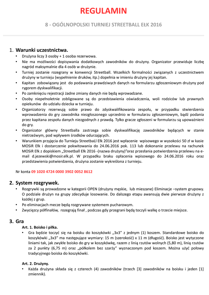 REGULAMIN 8 - OGÓLNOPOLSKI TURNIEJ STREETBALL EŁK 2016 1. Warunki uczestnictwa. • • • • • • • • • Drużyna liczy 3 osoby + 1 osoba rezerwowa. Nie ma możliwości dopisywania dodatkowych zawodników do drużyny. Organizator przewiduje liczbę nagród maksymalnie dla 4 osób w drużynie. Turniej zostanie rozegrany w konwencji Streetball. Wszelkich formalności związanych z uczestnictwem drużyny w turnieju (wypełnienie druków, itp.) dopełnia w imieniu drużyny jej kapitan. Kapitan zobowiązany jest do podawania prawdziwych danych na formularzu zgłoszeniowym drużyny pod rygorem dyskwalifikacji. Po zamknięciu rejestracji żadne zmiany danych nie będą wprowadzane. Osoby niepełnoletnie zobligowane są do przedstawienia oświadczenia, woli rodziców lub prawnych opiekunów do udziału dziecka w turnieju. Organizatorzy rezerwują sobie prawo do zdyskwalifikowania zespołu, w przypadku stwierdzenia wprowadzenia do gry zawodnika niezgłoszonego uprzednio w formularzu zgłoszeniowym, bądź podania przez kapitana zespołu danych niezgodnych z prawdą. Tylko gracze zgłoszeni w formularzu są upoważnieni do gry. Organizator główny Streetballa zastrzega sobie dyskwalifikację zawodników będących w stanie nietrzeźwym, pod wpływem środków odurzających. Warunkiem przyjęcia do Turnieju StreetbaLl Ełk 2016 jest wpłacenie wpisowego w wysokości 50 zł w kasie MOSiR Ełk i dostarczenie pokwitowania do 24.06.2016 pok. 113 lub dokonanie przelewu na rachunek MOSiR Ełk z dopiskiem „Streetball Ełk 2016 -(nazwa drużyny)”oraz przesłania potwierdzenia przelewu na email [email protected]. W przypadku braku opłacenia wpisowego do 24.06.2016 roku oraz przedstawienia potwierdzenia, drużyna zostanie wykreślona z turnieju. Nr konta 09 1020 4724 0000 3902 0052 8612 2. System rozgrywek. • • • Rozgrywki są prowadzone w kategorii OPEN (drużyny męskie, lub mieszane) Eliminacje –system grupowy. O podziale drużyn na grupy zdecyduje losowanie. Do dalszego etapu awansują dwie pierwsze drużyny z każdej z grup. Po eliminacjach mecze będą rozgrywane systemem pucharowym. Zwycięzcy półfinałów, rozegrają finał , podczas gdy przegrani będą toczyli walkę o trzecie miejsce. 3. Gra Art. 1. Boisko i piłka. • Gra będzie toczyć się na boisku do koszykówki „3x3” z jednym (1) koszem. Standardowe boisko do koszykówki „3x3” ma następujące wymiary: 15 m (szerokość) x 11 m (długość). Boisko jest wytyczone liniami tak, jak zwykłe boisko do gry w koszykówkę, razem z linią rzutów wolnych (5,80 m), linią rzutów za 2 punkty (6,75 m) oraz „półkolem bez szarży” wyznaczonym pod koszem. Można użyć połowy tradycyjnego boiska do koszykówki. Art. 2. Drużyny. • Każda drużyna składa się z czterech (4) zawodników (trzech [3] zawodników na boisku i jeden [1] zmiennik). Art. 3. Sędziowie. • Zespół sędziowski składa się z jednego (1) sędziego boiskowego oraz dwóch (2) sędziów stolikowych • (mierzący czas gry oraz sekretarz). • Uwaga: Organizator może wyznaczyć dwóch (2) sędziów boiskowych. Art. 4. Rozpoczęcie meczu. • Przed rozpoczęciem meczu obie drużyny rozgrzewają się jednocześnie. • O tym, która drużyna otrzyma pierwsze posiadanie piłki decyduje losowanie (rzut monetą). • Drużyna, która wygra losowanie może wybrać pomiędzy posiadaniem piłki na rozpoczęcie meczu a posiadaniem piłki na rozpoczęcie ewentualnej dogrywki. • Aby rozpocząć mecz, drużyny muszą liczyć po trzech (3) zawodników. Art. 5. Punktacja. • Za każdy celny rzut z miejsca wewnątrz łuku zostaje przyznany jeden (1) punkt. • Za każdy celny rzut z miejsca na zewnątrz łuku zostają przyznane dwa (2) punkty. • Za każdy celny rzut wolny zostaje przyznany jeden (1) punkt. Art. 6. Czas gry Zwycięzca meczu. • Czas gry jest następujący: • Jeden (1) okres 10 minut gry. Czas gry zatrzymywany jest podczas sytuacji martwej piłki i rzutów wolnych. Czas gry jest włączany ponownie w momencie, gdy wymiana piłki zostanie zakończona (tak szybko, jak tylko piłka będzie w rękach zawodnika drużyny atakującej). • Jeżeli jedna z drużyn uzyska 15 lub więcej punktów, wygrywa mecz, jeżeli zdarzy się to przed końcem regularnego czasu gry. Ten artykuł odnosi się jedynie do sytuacji w regularnym czasie gry (nie w ewentualnej dogrywce). • Jeżeli na koniec regularnego czasu gry drużyny mają tyle samo punktów, zostanie rozegrana dogrywka. Przed rozpoczęciem dogrywki ma miejsce jednominutowa (1) przerwa w grze. Pierwszy zespół, który zdobędzie w dogrywce dwa (2) punkty, wygrywa mecz. • Drużyna przegrywa mecz walkowerem, jeżeli o wyznaczonej godzinie zespół nie stawi się na boisku z trzema (3) zawodnikami gotowymi do gry. Art. 7. Faule/Rzuty wolne. • Drużyna podlega karze za faule drużyny, kiedy popełniła siedem (7) fauli. • Zawodnik, który popełnił cztery (4) faule, musi opuścić boisko. • Za faul w akcji rzutowej wewnątrz łuku zostanie przyznany faulowanemu jeden (1) rzut wolny. • Za faul w akcji rzutowej na zewnątrz łuku zostaną przyznane faulowanemu dwa (2) rzuty wolne. • Za faul w akcji rzutowej, po którym piłka wpada do kosza, zostanie przyznany jeden (1) dodatkowy rzut wolny. • Za faul niezwiązany z akcją rzutową w sytuacji kary za faule drużyny, zostanie przyznany jeden (1) rzut wolny. Art. 8. Gra na zwłokę. • Gra na zwłokę lub zaniechanie aktywnej gry zmierzającej do zdobycia punktów jest błędem. • Jeżeli boisko do gry jest wyposażone w zegar odmierzający czas do rzutu, drużyna musi wykonać próbę rzutu do kosza w czasie dwunastu (12) sekund. Zegar zostaje uruchomiony tak szybko, jak tylko piłka znajdzie się w rękach zawodnika drużyny atakującej (po wymianie piłki z zawodnikiem drużyny broniącej lub po zdobytym koszu po wybiciu piłki spod kosza). • Uwaga: Jeżeli boisko nie jest wyposażone w zegar odmierzający czas do rzut