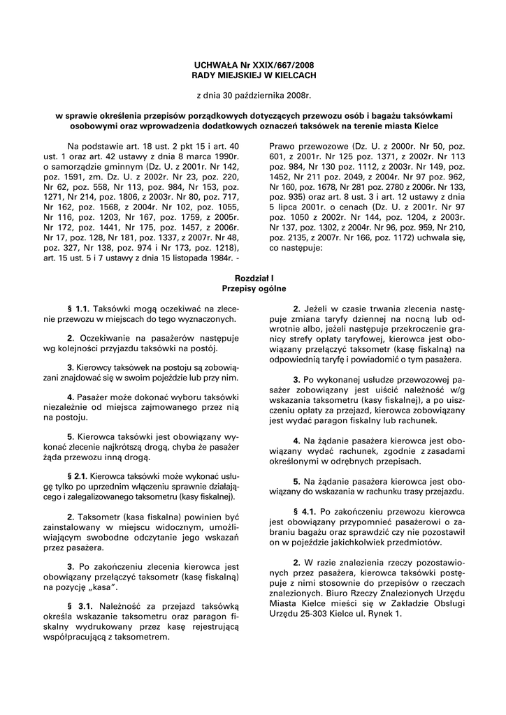 UCHWAŁA Nr XXIX/667/2008 RADY MIEJSKIEJ W KIELCACH z dnia 30 października 2008r. w sprawie określenia przepisów porządkowych dotyczących przewozu osób i bagaŜu taksówkami osobowymi oraz wprowadzenia dodatkowych oznaczeń taksówek na terenie miasta Kielce Na podstawie art. 18 ust. 2 pkt 15 i art. 40 ust. 1 oraz art. 42 ustawy z dnia 8 marca 1990r. o samorządzie gminnym (Dz. U. z 2001r. Nr 142, poz. 1591, zm. Dz. U. z 2002r. Nr 23, poz. 220, Nr 62, poz. 558, Nr 113, poz. 984, Nr 153, poz. 1271, Nr 214, poz. 1806, z 2003r. Nr 80, poz. 717, Nr 162, poz. 1568, z 2004r. Nr 102, poz. 1055, Nr 116, poz. 1203, Nr 167, poz. 1759, z 2005r. Nr 172, poz. 1441, Nr 175, poz. 1457, z 2006r. Nr 17, poz. 128, Nr 181, poz. 1337, z 2007r. Nr 48, poz. 327, Nr 138, poz. 974 i Nr 173, poz. 1218), art. 15 ust. 5 i 7 ustawy z dnia 15 listopada 1984r. - Prawo przewozowe (Dz. U. z 2000r. Nr 50, poz. 601, z 2001r. Nr 125 poz. 1371, z 2002r. Nr 113 poz. 984, Nr 130 poz. 1112, z 2003r. Nr 149, poz. 1452, Nr 211 poz. 2049, z 2004r. Nr 97 poz. 962, Nr 160, poz. 1678, Nr 281 poz. 2780 z 2006r. Nr 133, poz. 935) oraz art. 8 ust. 3 i art. 12 ustawy z dnia 5 lipca 2001r. o cenach (Dz. U. z 2001r. Nr 97 poz. 1050 z 2002r. Nr 144, poz. 1204, z 2003r. Nr 137, poz. 1302, z 2004r. Nr 96, poz. 959, Nr 210, poz. 2135, z 2007r. Nr 166, poz. 1172) uchwala się, co następuje: Rozdział I Przepisy ogólne § 1.1. Taksówki mogą oczekiwać na zlecenie przewozu w miejscach do tego wyznaczonych. 2. Oczekiwanie na pasaŜerów następuje wg kolejności przyjazdu taksówki na postój. 3. Kierowcy taksówek na postoju są zobowiązani znajdować się w swoim pojeździe lub przy nim. 2. JeŜeli w czasie trwania zlecenia następuje zmiana taryfy dziennej na nocną lub odwrotnie albo, jeŜeli następuje przekroczenie granicy strefy opłaty taryfowej, kierowca jest obowiązany przełączyć taksometr (kasę fiskalną) na odpowiednią taryfę i powiadomić o tym pasaŜera. 4. PasaŜer moŜe dokonać wyboru taksówki niezaleŜnie od miejsca zajmowanego przez nią na postoju. 3. Po wykonanej usłudze przewozowej pasaŜer zobowiązany jest uiścić naleŜność w/g wskazania taksometru (kasy fiskalnej), a po uiszczeniu opłaty za przejazd, kierowca zobowiązany jest wydać paragon fiskalny lub rachunek. 5. Kierowca taksówki jest obowiązany wykonać zlecenie najkrótszą drogą, chyba Ŝe pasaŜer Ŝąda przewozu inną drogą. 4. Na Ŝądanie pasaŜera kierowca jest obowiązany wydać rachunek, zgodnie z zasadami określonymi w odrębnych przepisach. § 2.1. Kierowca taksówki moŜe wykonać usługę tylko po uprzednim włączeniu sprawnie działającego i zalegalizowanego taksometru (kasy fiskalnej). 5. Na Ŝądanie pasaŜera kierowca jest obowiązany do wskazania w rachunku trasy przejazdu. 2. Taksometr (kasa fiskalna) powinien być zainstalowany w miejscu widocznym, umoŜliwiającym swobodne odczytanie jego wskazań przez pasaŜera. 3. Po zakończeniu zlecenia kierowca jest obowiązany przełączyć taksometr (kasę fiskalną) na pozycję „kasa”. § 3.1. NaleŜność za przejazd taksówką określa wskazanie taksometru oraz paragon fiskalny wydrukowany przez kasę rejestrującą współpracującą z taksometrem. § 4.1. Po zakończeniu przewozu kierowca jest obowiązany przypomnieć pasaŜerowi o zabraniu bagaŜu oraz sprawdzić czy nie pozostawił on w pojeździe jakichkolwiek przedmiotów. 2. W razie znalezienia rzeczy pozostawionych przez pasaŜera, kierowca taksówki postępuje z nimi stosownie do przepisów o rzeczach znalezionych. Biuro Rzeczy Znalezionych Urzędu Miasta Kielce mieści się w Zakładzie Obsługi Urzędu 25-303 Kielce ul. Rynek 1. Rozdział II Przewóz osób § 5.1. PasaŜer ma prawo zabrać ze sobą do pojazdu, z którego korzysta, inne osoby na wolne miejsca, bez uiszczania za to dodatkowych naleŜności. 2. Kierowca bez zgody pasaŜera nie moŜe dysponować wolnymi miejscami w taksówce. 3. NaleŜność za przejazd taksówką reguluje tylko jeden pasaŜer, kierowca nie moŜe Ŝądać zapłaty od pozostałych osób znajdujących się w taksówce, bez względu na okoliczności, w jakich korzystali oni z przejazdu. § 6. Przewóz dzieci dokonywany jest tylko pod opieką dorosłych, chyba Ŝe osoba, pod której opieką dziecko się znajduje, upowaŜnia kierowcę do przewiezienia dziecka samego - w takim przypadku naleŜność za usługę uiszczają rodzice lub opiekunowie z góry. § 7. Kierowca taksówki, w miarę moŜliwości, powinien uwzględnić pierwszeństwo przewozu osób wymagających natychmiastowej pomocy lub znajdujących się w szczególnej potrzebie. § 8. Kierowca taksówki moŜe odmówić wykonania przewozu lub rozpoczęty przewóz przerwać, jeŜeli pasaŜer: a) swoim zachowaniem zdradza objawy odurzenia alkoholem lub innymi środkami odurzającymi, b) spoŜywa w taksówce alkohol. Rozdział III Przewóz bagaŜu w taksówce osobowej § 9.1. PasaŜer ma prawo zabrać ze sobą do pojazdu, bez uiszczania dodatkowej naleŜności, bagaŜ podręczny oraz, za zgodą kierowcy, psy lub inne małe zwierzęta domowe, które moŜna umieścić tak, aby nie uszkodziły lub nie zanieczyściły pojazdu. 2. Do bagaŜu podręcznego zalicza się w szczególności: walizkę, plecak, worek turystyczny, składany wózek dziecięcy lub inwalidzki. 3. Z zachowaniem warunków ust. 1 i 2 dopuszcza się przewóz nart z kijkami oraz na ryzyko pasaŜera - m. in. telewizorów, radioodbiorników oraz innego sprzętu za dodatkową opłatą. § 10.1. BagaŜ podręczny pasaŜera moŜna przewozić w bagaŜniku znajdującym się wewnątrz pojazdu. 2. BagaŜnik powinien być utrzymany w naleŜytej czystości i wolny od wszelkiego sprzętu dodatkowego (poza sprzętem słuŜącym do napraw samochodu lub jego niezbędnego wyposaŜenia). 3. Dopuszcza się przewóz bagaŜu podręcznego wewnątrz taksówki z zachowaniem warunków, o których mowa w § 10 ust. 1 i 2. 4. Kierowca taksówki jest obowiązany do załadunku i wyładunku b