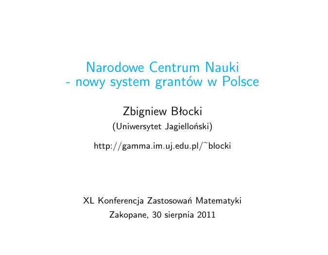 Narodowe Centrum Nauki - nowy system grantów w Polsce Zbigniew Błocki (Uniwersytet Jagielloński) http://gamma.im.uj.edu.pl/eblocki XL Konferencja Zastosowań Matematyki Zakopane, 30 sierpnia 2011 Ustawa z 30 kwietnia 2010 o Narodowym Centrum Nauki: Ustawa z 30 kwietnia 2010 o Narodowym Centrum Nauki: • finansowanie badań podstawowych realizowanych w formie projektów badawczych Ustawa z 30 kwietnia 2010 o Narodowym Centrum Nauki: • finansowanie badań podstawowych realizowanych w formie projektów badawczych • siedziba w Krakowie Ustawa z 30 kwietnia 2010 o Narodowym Centrum Nauki: • finansowanie badań podstawowych realizowanych w formie projektów badawczych • siedziba w Krakowie • • • • Dyrektor Centrum Rada Centrum Koordynatorzy Dyscyplin Zespoły Ekspertów Dyrektor NCN: • zarządza Centrum i reprezentuje go na zewnątrz • zatwierdza listy rankingowe i podpisuje umowy • przygotowuje i, po akceptacji Rady, przedstawia Ministrowi do zatwierdzenia roczne plany i sprawozdania, finansowe oraz merytoryczne • kontroluje wykonanie przyznanych projektów badawczych Zadania i uprawnienia Rady NCN • udział w wyborze Dyrektora NCN (3/5) • określanie dyscyplin (max 30) • wybór Koordynatorów Dyscyplin • określanie zasad przeprowadzania konkursów • wybór Zespołów Ekspertów do oceny wniosków • podział środków na dyscypliny • powołanie Komisji Odwoławczej (spośród członków Rady) • ocena merytoryczna Dyrektora i Koordynatorów Dyscyplin Koordynatorzy Dyscyplin: • organizują i przeprowadzają konkursy • organizują prace Zespołów Ekspertów • analizują wnioski pod względem formalnym • oceniają rzetelność i bezstronność opinii przygotowanych przez ekspertów • przedkładają Dyrektorowi do zatwierdzenia listy rankingowe przygotowane przez Zespoły Ekspertów • w szczególnych przypadkach, po zasięgnięciu opinii Zespołu Ekspertów, mogą dokonać zmian kolejności projektów badawczych na liście rankingowej Badania podstawowe - oryginalne prace badawcze eksperymentalne lub teoretyczne podejmowane przede wszystkim w celu zdobywania nowej wiedzy o podstawach zjawisk i obserwowalnych faktów bez nastawienia na bezpośrednie praktyczne zastosowanie lub użytkowanie (Art. 2 p. 3a Ustawy o zasadach finansowania nauki z 30 kwietnia 2010 r.) Zespół Identyfikujący • Maciej Żylicz, biologia, Międzynarodowy Instytut Biologii Molekularnej i Komórkowej (przewodniczący) • Adam Proń, chemia, Komisariat Energii Atomowej w Grenoble, Politechnika Warszawska • Piotr Sztompka, socjologia, Uniwersytet Jagielloński, • Stanisław Woronowicz, fizyka matematyczna, Uniwersytet Warszawski • Franciszek Ziejka, literatura polska, Uniwersytet Jagielloński. Rada NCN • Michał Karoński, matematyka, UAM (przewodniczący) Komisja K1: Komisja K2: • Ryszard Nycz, filologia polska, UJ (przewodniczący) • Krzysztof Frysztacki, socjologia, UJ • Janina Jóźwiak, demografia, SGH • Mirosław Kofta, psychologia, UW • Leszek Leszczyński, prawo, UMCS • Teresa Malecka, muzykologia, AM Kraków • Wojciech Nowakowski, archeologia, UW • Andrzej Szostek, filozofia, KUL • Wojciech Tygielski, historia sztuki, UW • Henryk Kozłowski, chemia, UWr (przewodniczący) • Jacek Błażewicz, informatyka, Politechnika Poznańska • Zbigniew Błocki, matematyka, UJ • Bożena Czerny, astronomia, CAMK • Andrzej Duda, chemia, CBMM PAN, Łódź • Janusz Janeczek, geologia, UŚ • Tomasz Kapitaniak, mechanika, Politechnika Łódzka • Marek Żukowski, fizyka, UG Komisja K3: • • • • • • Leszek Kaczmarek, biologia, IBD im. Nenckiego PAN (przewodniczący) Jakub Gołąb, immunologia, WUM Tomasz Motyl, genetyka, SGGW Krzysztof Nowak, genetyka, AR Poznań Jerzy Pałka, farmaceutyka, AM Białystok Adam Torbicki, kardiologia, Instytut Gruźlicy i Chorób Płuc, Warszawa Dyrektor NCN Andrzej Jajszczyk • profesor AGH (telekomunikacja) • Nagroda FNP (2008) Panele NCN HS1 Fundamentalne pytania o naturę człowieka i otaczającej go rzeczywistości HS2 Kultura i twórczość kulturowa HS3 Wiedza o przeszłości HS4 Jednostka, instytucje, rynki HS5 Normy i władza HS6 Człowiek i życie społeczne ST1 Nauki matematyczne ST2 Podstawowe składniki materii ST3 Fizyka fazy skondensowanej ST4 Chemia analityczna i fizyczna ST5 Synteza i materiały ST6 Informatyka i technologie informacyjne ST7 Inżynieria systemów i komunikacji ST8 Inżynieria procesów i produkcji ST9 Astronomia i badania kosmiczne ST10 Nauki o Ziemi NZ1 NZ2 NZ3 NZ4 NZ5 NZ6 NZ7 NZ8 NZ9 Podstawowe procesy życiowe na poziomie molekularnym Genetyka, genomika Biologia na poziomie komórki Biologia na poziomie tkanek, narządów i organizmów Choroby niezakaźne ludzi i zwierząt Immunologia i choroby zakaźne ludzi i zwierząt Zdrowie publiczne Podstawy wiedzy o życiu na poziomie środowiskowym Stosowane nauki o życiu ST1 Nauki matematyczne: wszystkie dziedziny matematyki, teoretyczne oraz stosowane, a także podstawy matematyczne informatyki, fizyka matematyczna i statystyka matematyczna, m.in.: ST1 ST1 ST1 ST1 ST1 ST1 ST1 ST1 ST1 ST1 ST1 ST1 ST1 ST1 ST1 ST1 ST1 ST1 ST1 1 Logika i podstawy matematyki 2 Algebra 3 Teoria liczb 4 Geometria algebraiczna i zespolona 5 Geometria 6 Topologia 7 Grupy Liego i algebry Liego 8 Analiza 9 Algebry operatorowe i analiza funkcjonalna 10 Równania różniczkowe zwyczajne i układy dynamiczne 11 Równania różniczkowe cza̧stkowe 12 Fizyka matematyczna 13 Rachunek prawdopodobieństwa i statystyka matematyczna 14 Kombinatoryka 15 Matematyczne aspekty informatyki 16 Analiza numeryczna i obliczenia naukowe 17 Teoria sterowania i optymalizacja 18 Zastosowania matematyki w innych naukach 19 Inne zagadnienia pokrewne Konkursy 15 czerwca 2011 (przyjmowanie wniosków) • podstawowe 276 507 000, w tym 5 694 000 na ST1 • dla początkujących naukowców (przed doktoratem) 62 386 000, w tym 838 000 na ST1 • dla młodych naukowców (no