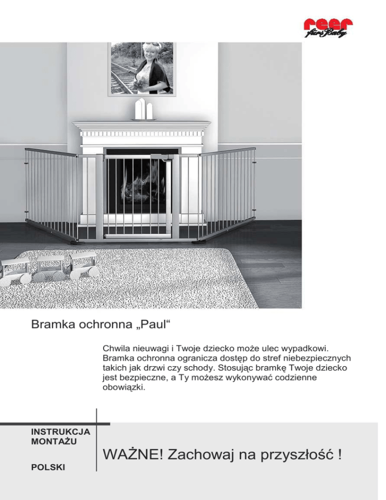 Bramka ochronna „Paul“ Chwila nieuwagi i Twoje dziecko moŜe ulec wypadkowi. Bramka ochronna ogranicza dostęp do stref niebezpiecznych takich jak drzwi czy schody. Stosując bramkę Twoje dziecko jest bezpieczne, a Ty moŜesz wykonywać codzienne obowiązki. INSTRUKCJA MONTAśU WAśNE! Zachowaj na przyszłość ! POLSKI 1. Zasady bezpiecznego uŜytkowania Gratulujemy zakupu bezpiecznej bramki firmy Reer. Jesteśmy przekonani, Ŝe będziecie Państwo zadowoleni z jakości naszych produktów przez cały czas ich uŜywania. Proszę poświęcić odpowiednio duŜo czasu na zapoznanie się z zasadami bezpieczeństwa oraz montaŜu bramki. JeŜeli planujecie montaŜ w późniejszym terminie proszę przeczytać jeszcze instrukcję przed montaŜem. Polski (PL) Proszę, poświęć kilka minut i zapoznać się z instrukcją i zasadami bezpieczeństwa. Zastosowanie się do wskazówek pozwoli uniknąć uszkodzenia elementów montaŜowych i ryzyku wypadku lub zranienie w trakcie montaŜu lub uŜytkowania. WAśNE: Rozpocząć montaŜ, tylko jeŜeli wszystkie wymienione obok wytyczne są spełnione Ogólne zasady bezpieczeństwa: − Bramka ochronna przeznaczona do uŜytku dla dzieci do 24 miesięcy − Istnieje zagroŜenie, Ŝe dzieci starsze będą się wspinać na bramkę − Natychmiast zaprzestań uŜywania bramki, kiedy dziecko jest w stanie samodzielnie otworzyć bramkę lub wspiąć się na nią, − Zadbaj, aby dziecko nie miało w pobliŜu przedmiotów ułatwiających wspinanie na bramkę (np. pudła, pojemniki na zabawki lub krzesła), − Bramka nie jest zabawką. Została zaprojektowana aby zwiększyć bezpieczeństwo Twojego dziecka. − Bramka nie zastępuje opieki i nadzoru dziecka przez osobę dorosłą. − Nigdy nie pozostawiać dzieci bez nadzoru, − Nie naleŜy uŜywać bramki do innych celów niŜ wskazane w instrukcji, − Regularnie sprawdzać stabilność i stan techniczny bramki, − Stosować wyłącznie części zamienne dostarczane przez producenta, − Nie uŜywać w przypadku uszkodzenia, − Regularnie sprawdzać poprawne działanie (zwłaszcza mechanizm blokujący) − Bramka nie jest przeznaczona do zabezpieczenia okien lub podobnych obiektów − W przypadku uŜytkowania w pobliŜu źródeł ciepła takich jak grzejniki, kominki itp. zachować bezpieczną odległość co mniej 50 cm − Po montaŜu, wyrzucić wszystkie opakowania bramki i jej elementów. − Opakowanie nie jest zabawką i moŜe stanowić zagroŜenie dla zdrowia lub Ŝycia Twojego dziecka − Bezpiecznie przechowywać niewykorzystane elementy montaŜowe. − Jeśli masz jakiekolwiek pytania, skontaktuj się z nami pod adresem: [email protected] Bramka ochronna moŜe być uŜywana wyłącznie: − JeŜeli moŜna ją solidnie i zamontować . − JeŜeli nie brakuje elementów lub nie są uszkodzone. − JeŜeli dziecko nie potrafi samodzielnie otworzyć bramki. − JeŜeli dziecko nie umie wspiąć się na bramkę. − JeŜeli dziecko nie jest starsze niŜ 24 miesięcy Instrukcja obsługi i uŜytkowania bramki ochronnej: − Bramka wykonana jest: z drewna bukowego, stali oraz elementów z tworzyw sztucznych. Do czyszczenia nie uŜywać agresywnych detergentów lub ostrych narzędzi. Czyścić regularnie za pomocą wilgotnej szmatki i mydła lub delikatnych środków myjących. 2. Zasady bezpieczeństwa w trakcie z montaŜu bramki UWAGA: Nigdy nie naleŜy uŜywać bramki bez podstaw stabilizacyjnych! UWAGA: Bramka nie moŜe być montowane w oknach i przestrzeniach podobnych MontaŜ bramki naleŜy wykonać wyłącznie w sposób opisany w instrukcji. Po montaŜu, naleŜy sprawdzić, czy bramka jest spasowana i czy działa prawidłowo. Zasady bezpieczeństwa dla montaŜu bramki na klatce schodowej: JeŜeli planujemy montaŜ bramki na klatce schodowej, to prawidłowy montaŜu jest szczególnie waŜny. Nieprawidłowo zainstalowana bramka moŜe być niebezpieczna i spowodować powaŜne obraŜenia! Schody są bardzo niebezpieczne dla dziecka. W celu ochrony dziecka z schodów, bramka powinna być zainstalowana na górze schodów. Zasady montaŜu do ścian z wykończeniem przypodłogowym. Przy montaŜu bramki do ściany z wykończeniem przypodłogowym takim jak listwy, cokoły itp. naleŜy wypełnić równomiernie pustą przestrzeń powstałą pomiędzy ścianą a panelem ogrodzenia bramki. UŜywanie bramki na zewnątrz. Bramka wykonana jest: z drewna bukowego, stali oraz elementów z tworzyw sztucznych. W czasie dobrej, suchej pogody bramka moŜe być uŜywana na tarasie lub na patio. Upewnij się, Ŝe podłoŜe jest na tyle stabilne, Ŝe bramka moŜe być zainstalowana solidnie. Zalecamy zakotwiczenie bramki do ściany lub podłoŜa. Po uŜyciu bramki na zewnątrz zalecamy oczyścić bramkę. strona 4 3. Lista i opis elementów Zawartość zestawu English WAśNE”: W zestawie podstawowym znajduje się jedna dodatkowa nóŜka stabilizacyjna. Proszę ją zachować na wypadek rozbudowy zestawu w przyszłości. LEGENDA A Obejma zawiasu (4x) B Podkładka obejmy (4x) C Kołek drewniany (2x) D Zaślepka zawiasu (4x) E Kołek rozporowy (11x) F Wkręt kotwiczny (8x) G Śruba mocowania nóŜki (6x) H Połączenie śrub do zawiasu szpilki (8x) I MontaŜ śrub na piętrze (3x) J Klucz imbusowy(1x) K Szpilka zawiasu (4x) L NóŜka stabilizacyjna (3x) M Panel ogrodzenia (2x) N Panel drzwiowy(1x) Zestaw podstawowy składa się z dwóch paneli drewnianego ogrodzenia oraz jednego panelu z metalowymi drzwiami. W przypadku, w którym zestaw o długości 237 cm jest za krótki dla zabezpieczeniu niebezpiecznego obszaru, moŜe zostać rozbudowany po obu stronach zastawu. Elementy wymagane do rozbudowy dostępne są oddzielnie. Wszystkie dodatkowe panele mogą być montowane bezpośrednio do panelu bramy lub do pozostałych rozszerzeń zestawu. Ze względów bezpieczeństwa, naleŜy zapewnić, Ŝe kaŜde dwa panele ogrodzenia połączone z uŜyciem nóŜki stabilizacyjnej. D N M E C F G H I B A J L K MontaŜ bramki ochronnej w 