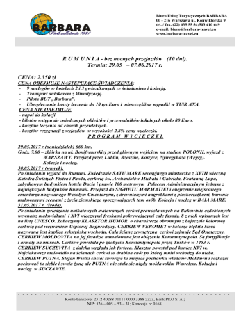 Biuro Usług Turystycznych BARBARA 00 - 216 Warszawa ul. Konwiktorska 9 tel. / fax. (22) 635 55 54;503 410 649 e–mail: [email protected] www.barbara-travel.eu R U M U N I A - bez nocnych przejazdów (10 dni). Termin: 29.05 – 07.06.2017 r. CENA: 2.350 zł CENA OBEJMUJE NASTEPUJĄCE ŚWIADCZENIA: - 9 noclegów w hotelach 2 i 3 gwiazdkowych ze śniadaniem i kolacją. - Transport autokarem z klimatyzacją. - Pilota BUT „Barbara”. - Ubezpieczenie koszty leczenia do 10 tys Euro i nieszczęśliwe wypadki w TUiR AXA. CENA NIE OBEJMUJE - napoi do kolacji - biletów wstępu do zwiedzanych obiektów i przewodników lokalnych około 80 Euro. - kosztów leczenia od chorób przewlekłych. - kosztów rezygnacji z wyjazdów w wysokości 2,8% ceny wycieczki. P R O G R A M W Y C I E C Z K I. 29.05.2017 r.(poniedziałek) 660 km. Godz. 7.00 – zbiórka na ul. Bonifraterskiej przed głównym wejściem na stadion POLONII, wyjazd z WARSZAWY. Przejazd przez Lublin, Rzeszów, Koszyce, Nyiregyhaza (Węgry). Kolacja i nocleg. 30.05.2017 r (wtorek). Po śniadaniu wyjazd do Rumuni. Zwiedzanie SATU MARE secesyjnego miasteczka z XVIII wieczną Katedrą Świętych Piotra i Pawła, cerkwią św. Archaniołów Michała i Gabriela, Fontanną Lupa, zabytkowym budynkiem hotelu Dacia i prawie 100 metrowym Pałacem Administracyjnym jednym z największych budynków Rumunii. Przejazd do SIGHETU MARMATIEI i obejrzenie miejscowego cmentarza nazywanego Wesołym Cmentarzem, z drewnianymi nagrobkami z płaskorzeżbami, barwnie malowanymi scenami z życia ziemskiego spoczywających tam osób. Kolacja i nocleg w BAIA MARE. 31.05.2017 r. (środa). Po śniadaniu zwiedzanie unikatowych malowanych cerkwi prawosławnych na Bukowinie ozdobionych wewnątrz malowidłami i XVI wiecznymi freskami pokrywającymi całe fasady. 8 z nich wpisanych jest na listę UNESCO. Zobaczymy KLASZTOR HUMOR o charakterze obronnym z bajecznie kolorową cerkwią pod wezwaniem Uśpionej Bogurodzicy. CERKIEW VEROMET w kolorze błękitu która nazywana jest kaplicą sykstyńską wschodu. Całą ścianę zewnętrzną cerkwi zajmuje Sąd Ostateczny. CERKIEW MOLDOVITA na jej fasadzie namalowane jest oblężenie Konstantynopola. Są fortyfikacje i armaty na murach. Cerkiew powstała po zdobyciu Konstantynopola przez Turków w 1453 r. CERKIEW SUCZEVITA z daleka wygląda jak forteca. Klasztor powstał pod koniec XVI w. Najciekawsze malowidło na ścianach cerkwi to drabina cnót po której mnisi wchodzą do nieba. CERKIEW PUTNA. Stefan Wielki chciał stworzyć tu miejsce pochówku władców Mołdawii i rozkazał pochować tu siebie i swoja żonę ale PUTNA nie stała się nigdy mołdawskim Wawelem. Kolacja i nocleg w SUCZAWIE. .................................................. Konto bankowe: 2312 40288 71111 0000 3388 2323, Bank PKO S. A.; NIP: 526 – 005 – 53 – 31; Koncesja nr 0168; 01.06.2017r. (czwartek). Po śniadaniu zwiedzanie SUCZAWY miasta położonego w historycznej Mołdawii z jednym z największych sanktuariów ormiańskich na świecie i pozostałością wieży tronowej. Klasztor św. Jana Nowego z cerkwią św. Jerzego z XVI w.,(wpisany na listę UNESCO), Cerkiew św. Dematriusza ozdobiona malowidłami , klasztor ormiański ZAMCA. Przejazd do BUKARESZTU stolicy Rumuni. Kolacja i nocleg. 02.06.2017 r. (piątek). Po śniadaniu zwiedzanie BUKARESZTU. Plac Unirli z gigantyczną fontanną, bukaresztańskie Pola Elizejskie, Dom Ludu dziś siedziba parlamentu, cerkiew św. Mikołaja z 1559 r., ruiny dworu książąt wołoskich zbudowanego na rozkaz Drakuli Księcia Vlada Palownika, Pałac Królewski dawniej siedziba Rady Państwa a dziś Narodowe Muzeum Sztuki z kolekcją ponad 100 tys. dzieł sztuki europejskiej, Katedra Prawosławna i Pałac Patriarchy, główna arteria miasta Calea Victoriel z architekturą paryską i secesyjne budowle. W mieście znajduje się największy na świecie Ogród Botaniczny z 10 tysiącami gatunków roślin. Kolacja i nocleg. 03.06.2017 r. (sobota). Po śniadaniu wyjazd do SINOIA i spacer Bulwarem Karola I. Zwiedzanie ZAMKU PELES dawnej letniej rezydencji królów Rumunii. Pałac zbudowany został z wielkim przepychem w stylu bawarskim z parkiem angielskim. Zwiedzanie BRASZOWA starego miasta z ratuszem, późnośredniowiecznego czarnego kościoła, cerkwi św Mikołaja z XIV w., murów miejskich i synagogi z 1901 r. Zwiedzanie ZAMKU BRAN malowniczo położonego w górach i słynącego z legendy o hrabim Draculi, którego duch wciąż błąka się po komnatach zamku. Kolacja i nocleg. 04.06.2017 r. (niedziela). Po śniadaniu przejazd do SIBINU miasta z rustykalną architekturą, dwupiętrowymi domami. Główny plac miasta PLATA MARE 142 na 93 m jest największym placem w Transylwanii, Brukenthala Pałac z XVIII w. dawna siedziba gubernatora, Mały Rynek z Domem Sztuki i kościołem luterańskim. Przejazd do SIGHISOARA miasta ze świetnie zachowanym starym miastem, Mury miejskie, wieża zegarowa, zabytkowe kamienice jak Dom Drakulii, Dom Wenecki, gotycki kościół. Kolacja i nocleg. 05.06.2017 r. (poniedziałek). Przejazd do TIRGU MURES widokową drogą wzdłuż jeziora i zapory wodnej w BICAZ . W mieście zobaczymy twierdzę, cerkiew prawosławną z XVIII w. największą w Rumunii , Pałac Kultury, Teatr Narodowy. Wyjazd do KLUŻ NAPOKA. Zwiedzanie starych miejskich placów i zabytkowych obiektów sakralnych jak Plac Avrama Iancu z piękną prawosławną katedrą, Teatr Narodowy, Plac Unii, Plac Luciana Blagi Kolacja i nocleg. 06.06.2017 r. (wtorek). Po śniadaniu przejazd do ORADEA. Zobaczymy katedrę barokową największą w kraju, twierdzę Cetatea Oradea zbudowaną na planie pięciokąta. W mieście znajduje się ponad 100 kościołów, są synagogi i zbory Baptystów. Kolacja i nocleg. 07.06.2017 r. (środa). Po śniadaniu wyjazd do WARSZAWY. Przyjazd do WARSZAWY około godz. 21.00. Z A P R A S Z A M Y!!!!! 1. 2. 3. 4. 5. Przy zapisie wpłata zaliczki w wysokości 30% ceny wycieczki i wybór miejsca w autokarze. W au
