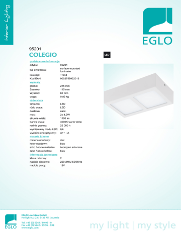 95201 COLEGIO podstawowe informacje artyku: 95201 typ owietlenia: surface-mounted luminaire kolekcja: Trend Kod EAN: 9002759952013 wymiary gboko: 215 mm Szeroko: 115 mm Wysoko: 60 mm waga: 0,82 kg ródo wiata Gniazdo: LED ródo wiata: LED dostawa: zacz. moc: 2x 4,2W strumie wiata: 1100 lm barwa wiata: 3000K warm white rednia ywotno: 25 000 h wymienialny modu LED: tak wydajno energetyczny: A++ - A materia & kolor materia obudowy: stal kolor obudowy: biay szko / odcie materiau: tworzywo sztuczne szko / odcie koloru: biay informacje techniczne klasa ochrony: 2 napicie sieciowe: 220-240V,50/60Hz napicie pracy: 12V