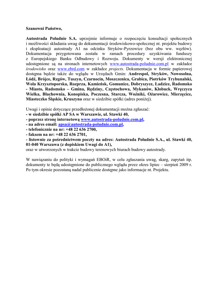 Szanowni Państwo, Autostrada Południe S.A. uprzejmie informuje o rozpoczęciu konsultacji społecznych i moŜliwości składania uwag do dokumentacji środowiskowo-społecznej nt. projektu budowy i eksploatacji autostrady A1 na odcinku Stryków-Pyrzowice (bez obu ww. węzłów). Dokumentacja przygotowana została w ramach procedury uzyskiwania funduszy z Europejskiego Banku Odbudowy i Rozwoju. Dokumenty w wersji elektronicznej udostępnione są na stronach internetowych www.autostrada-poludnie.com.pl w zakładce środowisko oraz www.ebrd.com w zakładce projects. Dokumentacja w formie papierowej dostępna będzie takŜe do wglądu w Urzędach Gmin: Andrespol, Stryków, Nowosolna, Łódź, Brójce, Rzgów, Tuszyn, Czarnocin, Moszczenica, Grabica, Piotrków Trybunalski, Wola Krzysztoporska, Rozprza, Kamieńsk, Gomunice, Dobryszyce, Ładzice, Radomsko - Miasto, Radomsko – Gmina, Rędziny, Częstochowa, Mykanów, Kłobuck, Wręczyca Wielka, Blachownia, Konopiska, Poczesna, Starcza, Woźniki, OŜarowice, Mierzęcice, Miasteczko Śląskie, Kruszyna oraz w siedzibie spółki (adres poniŜej). Uwagi i opinie dotyczące przedłoŜonej dokumentacji moŜna zgłaszać: - w siedzibie spółki AP SA w Warszawie, ul. Stawki 40, - poprzez stronę internetową www.autostrada-poludnie.com.pl, - na adres email: [email protected], - telefonicznie na nr: +48 22 636 2700, - faksem na nr: +48 22 636 2701, - listownie za pośrednictwem poczty na adres: Autostrada Południe S.A., ul. Stawki 40, 01-040 Warszawa (z dopiskiem Uwagi do A1), oraz w utworzonych w trakcie budowy terenowych biurach budowy autostrady. W nawiązaniu do polityki i wymagań EBOiR, w celu zgłaszania uwag, skarg, zapytań itp. dokumenty te będą udostępnione do publicznego wglądu przez okres lipiec – sierpień 2009 r. Po tym okresie pozostaną nadal publicznie dostępne jako informacje nt. Projektu.