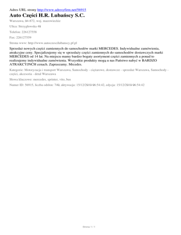 Adres URL strony http://www.adresyfirm.net/56915 Auto Części H.R. Lubańscy S.C. Warszawa, 04-872, woj. mazowieckie Ulica: Strzygłowska 40 Telefon: 226127558 Fax: 226127559 Strona www: http://www.autoczescilubanscy.pf.pl Sprzedaż nowych części zamiennych do samochodów marki MERCEDES. Indywidualne zamówienia, atrakcyjne ceny. Specjalizujemy się w sprzedaży części zamiennych do samochodów dostawczych marki MERCEDES od 14 lat. Na miejscu mamy bardzo bogaty asortyment części zamiennych a ponad to realizujemy indywidualne zamówienia. Wszystkie produkty mogą u nas Państwo nabyć w BARDZO ATRAKCYJNCH cenach. Zapraszamy. Mrcedes. Kategorie: Motoryzacja i transport Warszawa, Samochody - ciężarowe, dostawcze - sprzedaż Warszawa, Samochody części, akcesoria - detal Warszawa Słowa kluczowe: mercedes, sprinter, vito, bus Numer ID: 56915, liczba odsłon: 740, aktywacja: 15/12/2010 06:54:42, edycja: 15/12/2010 06:54:42 Strona 1 / 1