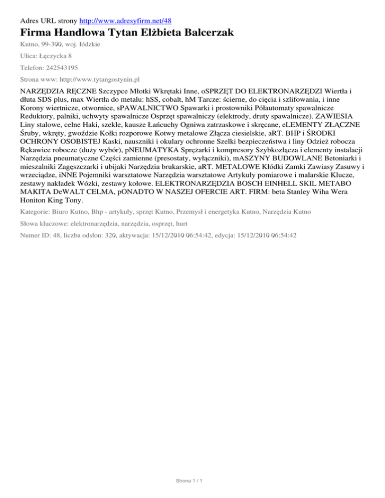 Adres URL strony http://www.adresyfirm.net/48 Firma Handlowa Tytan Elżbieta Balcerzak Kutno, 99-300, woj. łódzkie Ulica: Łęczycka 8 Telefon: 242543195 Strona www: http://www.tytangostynin.pl NARZĘDZIA RĘCZNE Szczypce Młotki Wkrętaki Inne, oSPRZĘT DO ELEKTRONARZĘDZI Wiertła i dłuta SDS plus, max Wiertła do metalu: hSS, cobalt, hM Tarcze: ścierne, do cięcia i szlifowania, i inne Korony wiertnicze, otwornice, sPAWALNICTWO Spawarki i prostowniki Półautomaty spawalnicze Reduktory, palniki, uchwyty spawalnicze Osprzęt spawalniczy (elektrody, druty spawalnicze). ZAWIESIA Liny stalowe, celne Haki, szekle, kausze Łańcuchy Ogniwa zatrzaskowe i skręcane, eLEMENTY ZŁĄCZNE Śruby, wkręty, gwoździe Kołki rozporowe Kotwy metalowe Złącza ciesielskie, aRT. BHP i ŚRODKI OCHRONY OSOBISTEJ Kaski, nauszniki i okulary ochronne Szelki bezpieczeństwa i liny Odzież robocza Rękawice robocze (duży wybór), pNEUMATYKA Sprężarki i kompresory Szybkozłącza i elementy instalacji Narzędzia pneumatyczne Części zamienne (presostaty, wyłączniki), mASZYNY BUDOWLANE Betoniarki i mieszalniki Zagęszczarki i ubijaki Narzędzia brukarskie, aRT. METALOWE Kłódki Zamki Zawiasy Zasuwy i wrzeciądze, iNNE Pojemniki warsztatowe Narzędzia warsztatowe Artykuły pomiarowe i malarskie Klucze, zestawy nakładek Wózki, zestawy kołowe. ELEKTRONARZĘDZIA BOSCH EINHELL SKIL METABO MAKITA DeWALT CELMA, pONADTO W NASZEJ OFERCIE ART. FIRM: beta Stanley Wiha Wera Honiton King Tony. Kategorie: Biuro Kutno, Bhp - artykuły, sprzęt Kutno, Przemysł i energetyka Kutno, Narzędzia Kutno Słowa kluczowe: elektronarzędzia, narzędzia, osprzęt, hurt Numer ID: 48, liczba odsłon: 320, aktywacja: 15/12/2010 06:54:42, edycja: 15/12/2010 06:54:42 Strona 1 / 1