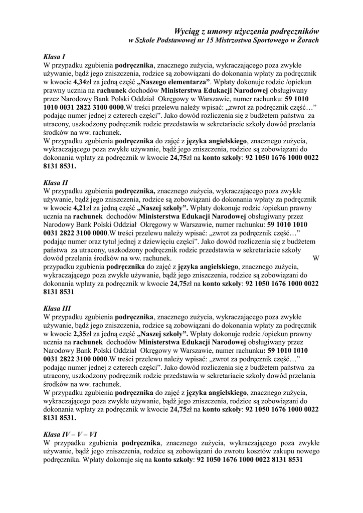 Wyciąg z umowy użyczenia podręczników w Szkole Podstawowej nr 15 Mistrzostwa Sportowego w Żorach Klasa I W przypadku zgubienia podręcznika, znacznego zużycia, wykraczającego poza zwykłe używanie, bądź jego zniszczenia, rodzice są zobowiązani do dokonania wpłaty za podręcznik w kwocie 4,34zł za jedną część „Naszego elementarza”. Wpłaty dokonuje rodzic /opiekun prawny ucznia na rachunek dochodów Ministerstwa Edukacji Narodowej obsługiwany przez Narodowy Bank Polski Oddział Okręgowy w Warszawie, numer rachunku: 59 1010 1010 0031 2822 3100 0000.W treści przelewu należy wpisać: „zwrot za podręcznik część…” podając numer jednej z czterech części”. Jako dowód rozliczenia się z budżetem państwa za utracony, uszkodzony podręcznik rodzic przedstawia w sekretariacie szkoły dowód przelania środków na ww. rachunek. W przypadku zgubienia podręcznika do zajęć z języka angielskiego, znacznego zużycia, wykraczającego poza zwykłe używanie, bądź jego zniszczenia, rodzice są zobowiązani do dokonania wpłaty za podręcznik w kwocie 24,75zł na konto szkoły: 92 1050 1676 1000 0022 8131 8531. Klasa II W przypadku zgubienia podręcznika, znacznego zużycia, wykraczającego poza zwykłe używanie, bądź jego zniszczenia, rodzice są zobowiązani do dokonania wpłaty za podręcznik w kwocie 4,21zł za jedną część „Naszej szkoły”. Wpłaty dokonuje rodzic /opiekun prawny ucznia na rachunek dochodów Ministerstwa Edukacji Narodowej obsługiwany przez Narodowy Bank Polski Oddział Okręgowy w Warszawie, numer rachunku: 59 1010 1010 0031 2822 3100 0000.W treści przelewu należy wpisać: „zwrot za podręcznik część…” podając numer oraz tytuł jednej z dziewięciu części”. Jako dowód rozliczenia się z budżetem państwa za utracony, uszkodzony podręcznik rodzic przedstawia w sekretariacie szkoły dowód przelania środków na ww. rachunek. W przypadku zgubienia podręcznika do zajęć z języka angielskiego, znacznego zużycia, wykraczającego poza zwykłe używanie, bądź jego zniszczenia, rodzice są zobowiązani do dokonania wpłaty za podręcznik w kwocie 24,75zł na konto szkoły: 92 1050 1676 1000 0022 8131 8531 Klasa III W przypadku zgubienia podręcznika, znacznego zużycia, wykraczającego poza zwykłe używanie, bądź jego zniszczenia, rodzice są zobowiązani do dokonania wpłaty za podręcznik w kwocie 2,35zł za jedną część „Naszej szkoły”. Wpłaty dokonuje rodzic /opiekun prawny ucznia na rachunek dochodów Ministerstwa Edukacji Narodowej obsługiwany przez Narodowy Bank Polski Oddział Okręgowy w Warszawie, numer rachunku: 59 1010 1010 0031 2822 3100 0000.W treści przelewu należy wpisać: „zwrot za podręcznik część…” podając numer jednej z czterech części”. Jako dowód rozliczenia się z budżetem państwa za utracony, uszkodzony podręcznik rodzic przedstawia w sekretariacie szkoły dowód przelania środków na ww. rachunek. W przypadku zgubienia podręcznika do zajęć z języka angielskiego, znacznego zużycia, wykraczającego poza zwykłe używanie, bądź jego zniszczenia, rodzice są zobowiązani do dokonania wpłaty za podręcznik w kwocie 24,75zł na konto szkoły: 92 1050 1676 1000 0022 8131 8531. Klasa IV – V – VI W przypadku zgubienia podręcznika, znacznego zużycia, wykraczającego poza zwykłe używanie, bądź jego zniszczenia, rodzice są zobowiązani do zwrotu kosztów zakupu nowego podręcznika. Wpłaty dokonuje się na konto szkoły: 92 1050 1676 1000 0022 8131 8531