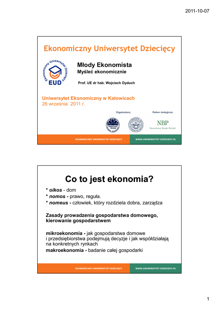 2011-10-07 Ekonomiczny Uniwersytet Dziecięcy Młody Ekonomista Myśleć ekonomicznie Prof. UE dr hab. Wojciech Dyduch Uniwersytet Ekonomiczny w Katowicach 26 września 2011 r. EKONOMICZNY UNIWERSYTET DZIECIĘCY WWW.UNIWERSYTET-DZIECIECY.PL Co to jest ekonomia? * oikos - dom * nomos - prawo, reguła. * nomeus - człowiek, który rozdziela dobra, zarządza Zasady prowadzenia gospodarstwa domowego, kierowanie gospodarstwem mikroekonomia - jak gospodarstwa domowe i przedsiębiorstwa podejmują decyzje i jak współdziałają na konkretnych rynkach makroekonomia - badanie całej gospodarki EKONOMICZNY UNIWERSYTET DZIECIĘCY WWW.UNIWERSYTET-DZIECIECY.PL 1 2011-10-07 Kim są ekonomiści? EKONOMICZNY UNIWERSYTET DZIECIĘCY WWW.UNIWERSYTET-DZIECIECY.PL Bankierzy EKONOMICZNY UNIWERSYTET DZIECIĘCY WWW.UNIWERSYTET-DZIECIECY.PL 2 2011-10-07 Księgowi EKONOMICZNY UNIWERSYTET DZIECIĘCY WWW.UNIWERSYTET-DZIECIECY.PL Kim są ekonomiści? • Finansiści, towaroznawcy, praktycy gospodarczy • Konsultanci, badacze rynku, • Politycy, menedżerowie • Demografia, rynek • pracy, finanse publiczne • Ekonometria EKONOMICZNY UNIWERSYTET DZIECIĘCY WWW.UNIWERSYTET-DZIECIECY.PL 3 2011-10-07 Do czego potrzebni są ekonomiści? EKONOMICZNY UNIWERSYTET DZIECIĘCY WWW.UNIWERSYTET-DZIECIECY.PL Do czego potrzebni są ekonomiści? • analizują, jak zasoby (ziemia, praca, surowce, maszyny) są rozdzielane w społeczeństwie (ziemia, praca, surowce, maszyny) w celu produkcji dóbr) • przeprowadzają badania dotyczące trendów • badają gospodarkę • badają wydatki • gospodarstw EKONOMICZNY UNIWERSYTET DZIECIĘCY WWW.UNIWERSYTET-DZIECIECY.PL 4 2011-10-07 Jak myślą ekonomiści? Zasoby, ich ograniczoność i rzadkość Popyt i podaż EKONOMICZNY UNIWERSYTET DZIECIĘCY WWW.UNIWERSYTET-DZIECIECY.PL Jak myślą ekonomiści? Każda grupa ma 2000 zł Macie za zadanie zorganizować przyjęcie na rozpoczęcie roku akademickiego EUD dla swojej grupy 1) Decyzja: Ognisko, sala, restauracja? 2) Co i za ile kupujecie? 3) Czy pozyskujecie sponsorów? 4) Czy uda się Wam zaoszczędzić pieniądze? Jeśli tak, co z nimi zrobicie? 5) Czy 2000 zł to dużo czy mało na takie wydarzenie? EKONOMICZNY UNIWERSYTET DZIECIĘCY WWW.UNIWERSYTET-DZIECIECY.PL 5
