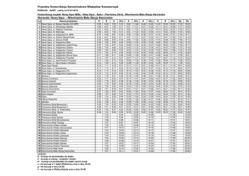 Prywatna Komunikacja Samochodowa Władysław Kaczmarczyk ROZKŁAD JAZDY ważny od 27-07-2016 Komunikacja zwykła: Nowy Sącz MDA - Stary Sącz - Rytro - Piwniczna Zdrój - Wierchomla Mała Stacja Narciarska Kierunek: Nowy Sącz - Wierchomla Mała Stacja Narciarska Lp 1 2 3 4 5 6 7 8 9 10 11 12 13 14 15 16 17 18 19 20 21 22 23 24 25 26 27 28 29 30 31 32 33 34 35 36 37 38 39 40 41 42 43 44 45 46 47 48 49 50 Nazwa przystanku Nowy Sącz, ul. Bulwar Narwiku DA MPK Nowy Sącz, ul. Kilińskiego Stadion Nowy Sącz, ul. Rejtana Cmentarz Nowy Sącz, Al. Batorego Nowy Sącz, ul. Kolejowa D.A. MPK Nowy Sącz, ul. Zielona Stacja Paliw Nowy Sącz, ul. Zielona WSB Nowy Sącz, ul. Węgierska Rafa Nowy Sącz, ul. Węgierska Urząd Pracy Nowy Sącz, ul. Węgierska Galeria Nowy Sącz, ul. Węgierska Carbon Nowy Sącz, ul. Węgierska Szkoła Nowy Sącz, ul. Węgierska Winna Góra Nowy Sącz, ul. Węgierska Przystań Stary Sącz, ul. Jana Pawła II Przystań Stary Sącz, ul. Jana Pawła II Wiadukt Stary Sącz Rynek Stary Sącz, ul. Sobieskiego Stary Sącz, ul. Węgierska OTL Stary Sącz, ul. Węgierska Cyganowice Barcice I Barcice Cmentarz Barcice Kościół Barcice Kamieniołom Barcice Zabronie Barcice Dominików Rytro Cmentarz Rytro Zajazd Rytro Obłazy Ryterskie Młodów Piwniczna Zdrój Borownice I Piwniczna Zdrój Borownice II Piwniczna Zdrój, ul. Krakowska Piwniczna Zdrój, Rynek Piwniczna Koliba Piwniczna Zdrój Szkoła Piwniczna Zdrój Skrzyżowanie Piwniczna Zdrój Twarogi Wierchomla Wielka Horbek Wierchomla Wielka Kamieniołom Wierchomla Wielka Belweder Wierchomla Wielka Chata Wierchomla Wielka Zawodzie Wierchomla Wielka Remiza Wierchomla Wielka Kościół Wierchomla Wielka Szkoła Wierchomla Wielka Potasznia Wierchomla Mała Hotel Wierchomla Mała Stacja Narciarska LEGENDA A - kursuje od poniedziałku do piątku C - kursuje w soboty , niedziele i święta D - kursuje od poniedziałku do piątku oprócz świąt a - nie kursuje w 1 dzień Wielkanocy oraz w dniu 25.XII g - nie kursuje w dniu 24.XII h - nie kursuje w Wielką Sobotę oraz w dniu 24.XII D 5:55 5:56 5:57 5:59 6:01 6:02 6:03 6:05 6:07 6:08 6:09 6:10 6:11 6:12 6:13 6:14 6:16 6:17 6:18 6:19 6:21 6:22 6:23 6:24 6:25 6:26 6:27 6:28 6:29 6:31 6:33 6:35 6:36 6:37 6:38 D 6:50 6:51 6:52 6:54 6:56 6:57 6:58 7:00 7:02 7:03 7:04 7:05 7:06 7:07 7:08 7:09 7:11 7:12 7:13 7:14 7:16 7:17 7:18 7:19 7:20 7:21 7:22 7:23 7:24 7:26 7:28 7:30 7:31 7:32 7:33 7:34 7:35 7:36 7:37 7:39 7:41 7:42 7:43 7:44 7:45 7:46 7:47 7:49 7:50 7:51 D 7:55 7:56 7:57 7:59 8:01 8:02 8:03 8:05 8:07 8:08 8:09 8:10 8:11 8:12 8:13 8:14 8:16 8:17 8:18 8:19 8:21 8:22 8:23 8:24 8:25 8:26 8:27 8:28 8:29 8:31 8:33 8:35 8:36 8:37 8:38 ACa 9:10 9:11 9:12 9:14 9:16 9:17 9:18 9:20 9:22 9:23 9:24 9:25 9:26 9:27 9:28 9:29 9:31 9:32 9:33 9:34 9:36 9:37 9:38 9:39 9:40 9:41 9:42 9:43 9:44 9:46 9:48 9:50 9:51 9:52 9:53 9:54 9:55 9:56 9:57 9:59 10:01 10:02 10:03 10:04 10:05 10:06 10:07 10:09 10:10 10:11 D 9:50 9:51 9:52 9:54 9:56 9:57 9:58 10:00 10:02 10:03 10:04 10:05 10:06 10:07 10:08 10:09 10:11 10:12 10:13 10:14 10:16 10:17 10:18 10:19 10:20 10:21 10:22 10:23 10:24 10:26 10:28 10:30 10:31 10:32 10:33 ACa 11:20 11:21 11:22 11:24 11:26 11:27 11:28 11:30 11:32 11:33 11:34 11:35 11:36 11:37 11:38 11:39 11:41 11:42 11:43 11:44 11:46 11:47 11:48 11:49 11:50 11:51 11:52 11:53 11:54 11:56 11:58 12:00 12:01 12:02 12:03 12:04 12:05 12:06 12:07 12:09 12:11 12:12 12:13 12:14 12:15 12:16 12:17 12:19 12:20 12:21 D 12:20 12:21 12:22 12:24 12:26 12:27 12:28 12:30 12:32 12:33 12:34 12:35 12:36 12:37 12:38 12:39 12:41 12:42 12:43 12:44 12:46 12:47 12:48 12:49 12:50 12:51 12:52 12:53 12:54 12:56 12:58 13:00 13:01 13:02 13:03 ACa 13:25 13:26 13:27 13:29 13:31 13:32 13:33 13:35 13:37 13:38 13:39 13:40 13:41 13:42 13:43 13:44 13:46 13:47 13:48 13:49 13:51 13:52 13:53 13:54 13:55 13:56 13:57 13:58 13:59 14:01 14:03 14:05 14:06 14:07 14:08 14:09 14:10 14:11 14:12 14:14 14:16 14:17 14:18 14:19 14:20 14:21 14:22 14:24 14:25 14:26 D 14:10 14:11 14:12 14:14 14:16 14:17 14:18 14:20 14:22 14:23 14:24 14:25 14:26 14:27 14:28 14:29 14:31 14:32 14:33 14:34 14:36 14:37 14:38 14:39 14:40 14:41 14:42 14:43 14:44 14:46 14:48 14:50 14:51 14:52 14:53 D 15:50 15:51 15:52 15:54 15:56 15:57 15:58 16:00 16:02 16:03 16:04 16:05 16:06 16:07 16:08 16:09 16:11 16:12 16:13 16:14 16:16 16:17 16:18 16:19 16:20 16:21 16:22 16:23 16:24 16:26 16:28 16:30 16:31 16:32 16:33 ACa 16:55 16:56 16:57 16:59 17:01 17:02 17:03 17:05 17:07 17:08 17:09 17:10 17:11 17:12 17:13 17:14 17:16 17:17 17:18 17:19 17:21 17:22 17:23 17:24 17:25 17:26 17:27 17:28 17:29 17:31 17:33 17:35 17:36 17:37 17:38 17:39 17:40 17:41 17:42 17:44 17:46 17:47 17:48 17:49 17:50 17:51 17:52 17:54 17:55 17:56 Dg 17:40 17:41 17:42 17:44 17:46 17:47 17:48 17:50 17:52 17:53 17:54 17:55 17:56 17:57 17:58 17:59 18:01 18:02 18:03 18:04 18:06 18:07 18:08 18:09 18:10 18:11 18:12 18:13 18:14 18:16 18:18 18:20 18:21 18:22 18:23 Dh 19:05 19:06 19:07 19:09 19:11 19:12 19:13 19:15 19:17 19:18 19:19 19:20 19:21 19:22 19:23 19:24 19:26 19:27 19:28 19:29 19:31 19:32 19:33 19:34 19:35 19:36 19:37 19:38 19:39 19:41 19:43 19:45 19:46 19:47 19:48 19:49 19:50 19:51 19:52 19:54 19:56 19:57 19:58 19:59 20:00 20:01 20:02 20:04 20:05 20:06 Prywatna Komunikacja Samochodowa Władysław Kaczmarczyk ROZKŁAD JAZDY ważny od 27-07-2016 Komunikacja zwykła: Nowy Sącz MDA - Stary Sącz - Rytro - Piwniczna Zdrój - Wierchomla Mała Stacja Narciarska Kierunek: Wierchomla Mała Stacja Narciarska - Nowy Sącz Lp 1 2 3 4 5 6 7 8 9 10 11 12 13 14 15 16 17 18 19 20 21 22 23 24 25 26 27 28 29 30 31 32 33 34 35 36 37 38 39 40 41 42 43 44 45 46 47 48 Nazwa przystanku Wierchomla Mała Stacja Narciarska Wierchomla Mała Hotel Wierchomla Wielka Potasznia Wierchomla Wielka Szkoła Wierchomla Wielka Kościół Wierchomla Wielka Remiza Wierchomla Wielka Zawodzie Wierchomla Wielka Chata Wierchomla Wielka Belweder Wierchomla Wielka Kamieniołom Wierchomla Wielka Horbek Piwniczna Zdrój Łomnica Piwniczna Zdrój Skrzyżowanie Piwniczna