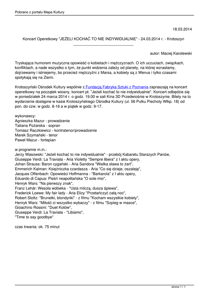 Pobrano z portalu Mapa Kultury 18.03.2014 Koncert Operetkowy "JEŻELI KOCHAĆ TO NIE INDYWIDUALNIE" - 24.03.2014 r. - Krotoszyn ____________________________ autor: Maciej Karolewski Tryskająca humorem muzyczna opowieść o kobietach i mężczyznach. O ich uczuciach, związkach, konfliktach, a nade wszystko o tym, że punkt widzenia zależy od planety, na której wzrastamy, dojrzewamy i istniejemy, bo przecież mężczyźni z Marsa, a kobiety są z Wenus i tylko czasami spotykają się na Ziemi. Krotoszyński Ośrodek Kultury wspólnie z Fundacją Fabryka Sztuki z Poznania zapraszają na koncert operetkowy na początek wiosny, koncert pt. "Jeżeli kochać to nie indywidualnie". Koncert odbędzie się w poniedziałek 24 marca 2014 r. o godz. 19.00 w sali Kina 3D Przedwiośnie w Krotoszynie. Bilety na to wydarzenie dostępne w kasie Krotoszyńskiego Ośrodka Kultury (ul. 56 Pułku Piechoty Wlkp. 18) od pon. do czw. w godz. 8-16 a w piątek w godz. 9-17. wykonawcy: Agnieszka Mazur - prowadzenie Tatiana Pożarska - sopran Tomasz Raczkiewicz - kontratenor/prowadzenie Marek Szymański - tenor Paweł Mazur - fortepian w programie m.in.: Jerzy Wasowski: "Jeżeli kochać to nie indywidualnie" - przebój Kabaretu Starszych Panów, Giuseppe Verdi: La Traviata - Aria Violetty "Sempre libera" z I aktu opery, Johan Strauss: Baron cygański - Aria Sandora "Wielka sława to żart", Emmerich Kalman: Księżniczka czardasza - Aria "Co się dzieje, oszaleję", Jacques Offenbach: Opowieści Hoffmanna - "Barkarola" z I aktu opery, Eduardo di Capua: Pieśń neapolitańska "O sole mio", Henryk Wars: "Na pierwszy znak", Franz Lehár: Wesoła wdówka - "Usta milczą, dusza śpiewa", Frederick Loewe: My fair lady - Aria Elizy "Przetańczyć całą noc", Robert Stoltz: "Brunetki, blondynki" - z filmu "Kocham wszystkie kobiety", Henryk Wars: "Miłość ci wszystko wybaczy" - z filmu "Szpieg w masce", Gioachino Rossini: "Duet Kotów", Giuseppe Verdi: La Traviata - "Libiamo", "Time to say goodbye" czas trwania: ok. 75 minut strona 1 / 1
