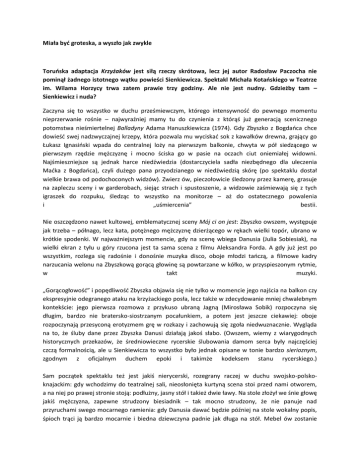 Miała być groteska, a wyszło jak zwykle Toruńska adaptacja Krzyżaków jest siłą rzeczy skrótowa, lecz jej autor Radosław Paczocha nie pominął żadnego istotnego wątku powieści Sienkiewicza. Spektakl Michała Kotańskiego w Teatrze im. Wilama Horzycy trwa zatem prawie trzy godziny. Ale nie jest nudny. Gdzieżby tam – Sienkiewicz i nuda? Zaczyna się to wszystko w duchu prześmiewczym, którego intensywność do pewnego momentu nieprzerwanie rośnie – najwyraźniej mamy tu do czynienia z którąś już generacją scenicznego potomstwa nieśmiertelnej Balladyny Adama Hanuszkiewicza (1974). Gdy Zbyszko z Bogdańca chce dowieść swej nadzwyczajnej krzepy, która pozwala mu wyciskać sok z kawałków drewna, grający go Łukasz Ignasiński wpada do centralnej loży na pierwszym balkonie, chwyta w pół siedzącego w pierwszym rzędzie mężczyznę i mocno ściska go w pasie na oczach ciut oniemiałej widowni. Najśmieszniejsze są jednak harce niedźwiedzia (dostarczyciela sadła niezbędnego dla uleczenia Maćka z Bogdańca), czyli dużego pana przyodzianego w niedźwiedzią skórę (po spektaklu dostał wielkie brawa od podochoconych widzów). Zwierz ów, pieczołowicie śledzony przez kamerę, grasuje na zapleczu sceny i w garderobach, siejąc strach i spustoszenie, a widzowie zaśmiewają się z tych igraszek do rozpuku, śledząc to wszystko na monitorze – aż do ostatecznego powalenia i „uśmiercenia” bestii. Nie oszczędzono nawet kultowej, emblematycznej sceny Mój ci on jest: Zbyszko owszem, występuje jak trzeba – półnago, lecz kata, potężnego mężczyznę dzierżącego w rękach wielki topór, ubrano w krótkie spodenki. W najważniejszym momencie, gdy na scenę wbiega Danusia (Julia Sobiesiak), na wielki ekran z tyłu u góry rzucona jest ta sama scena z filmu Aleksandra Forda. A gdy już jest po wszystkim, rozlega się radośnie i donośnie muzyka disco, oboje młodzi tańczą, a filmowe kadry narzucania welonu na Zbyszkową gorącą głowinę są powtarzane w kółko, w przyspieszonym rytmie, w takt muzyki. „Gorącogłowość” i popędliwość Zbyszka objawia się nie tylko w momencie jego najścia na balkon czy ekspresyjnie odegranego ataku na krzyżackiego posła, lecz także w zdecydowanie mniej chwalebnym kontekście: jego pierwsza rozmowa z przykuso ubraną Jagną (Mirosława Sobik) rozpoczyna się długim, bardzo nie bratersko-siostrzanym pocałunkiem, a potem jest jeszcze ciekawiej: oboje rozpoczynają przesyconą erotyzmem grę w rozkazy i zachowują się zgoła niedwuznacznie. Wygląda na to, że śluby dane przez Zbyszka Danusi działają jakoś słabo. (Owszem, wiemy z wiarygodnych historycznych przekazów, że średniowieczne rycerskie ślubowania damom serca były najczęściej czczą formalnością, ale u Sienkiewicza to wszystko było jednak opisane w tonie bardzo sierioznym, zgodnym z oficjalnym duchem epoki i takimże kodeksem stanu rycerskiego.) Sam początek spektaklu też jest jakiś nierycerski, rozegrany raczej w duchu swojsko-polskoknajackim: gdy wchodzimy do teatralnej sali, nieosłonięta kurtyną scena stoi przed nami otworem, a na niej po prawej stronie stoją: podłużny, jasny stół i takież dwie ławy. Na stole złożył we śnie głowę jakiś mężczyzna, zapewne strudzony biesiadnik – tak mocno strudzony, że nie panuje nad przyruchami swego mocarnego ramienia: gdy Danusia dawać będzie później na stole wokalny popis, śpioch trąci ją bardzo mocarnie i biedna dziewczyna padnie jak długa na stół. Mebel ów zostanie jednak wyniesiony wraz z ławami przed wkroczeniem na scenę króla Jagiełły (Bartosz Zaczykiewicz), który będzie musiał sprawiedliwie osądzić Zbyszka i skazać go na śmierć. Pierwszym tekstem wypowiedzianym w tym spektaklu jest monolog Maćka z Bogdańca (Jarosław Felczykowski) o przywarach i zaletach rycerstwa pochodzącego z rozmaitych europejskich nacji. Zacny ten rycerz, ubrany w czarny kontusz (czyli strój zdecydowanie nie z jego epoki), jest jakby trochę podpity – świadczy o tym nieco labilna mowa i takież ruchy. Po wygłoszeniu swojej przesyconej potocznymi stereotypami mowy Maćko, który dotąd stał na podeście u góry, zjeżdża w dół po przemyślnie ustawionej pochylni, w którym to dziele dołączają do niego inni polscy rycerze. Wspomniana pochylnia jest bardzo ważnym elementem scenicznej architektury, ciekawie zaprojektowanej przez Magdalenę Musiał. Przestrzeń jest bardzo wyraźnie podzielona: u góry mamy idący od kulisy do kulisy dość obszerny podest, a ze sceną łączy go owa szeroka pochylnia, zdecydowanie dynamizująca akcję spektaklu: np. atak Zbyszka na krzyżackiego posła jest pokazany w ten sposób, że Krzyżak ów (Tomasz Mycan) stoi na górnym podeście, a Zbyszko rzuca się kilkakrotnie po pochylni w górę, usiłując bezskutecznie go dosięgnąć (oczywiście Ignasiński udaje, że nie jest w stanie podbiec na górny podest i zaciukać psubrata, ale tu nie chodzi o prawdopodobieństwo, tylko o dynamikę aktorskiego działania i oddanie jurnej, bezmyślnej agresywności młodego rycerza). Scenografię uzupełniają ustawione po bokach dwie pary wysokich sztucznych świerków no i projekcje przeźroczy oraz fragmentów filmu Forda na zajmujący całą szerokość sceny ekran umiejscowiony u góry nad podestem. Realizatorzy najczęściej absorbują naszą uwagę ponurym wizerunkiem zdewastowanego blokowiska lub (z równą częstotliwością) obrazem pojedynczego, czteropiętrowego bloku z wielkiej płyty – oba zdjęcia są rodem z licznych postsocjalistycznych pejzaży straszących oko wędrowca od Władywostoku po Magdeburg. Poza nimi dominują ponure, zimowe (ale bezśnieżne) krajobrazy z czarnymi wzgórzami, które pokrywa bezlistna roślinność. Cała ta sceneria, z wyjątkiem jasnego stołu i ław tudzież zielonych świerków, no i kolorowych fragmentów filmu Forda, jest czarnoszaro-biała i zdecydowanie ponura w swym kolory