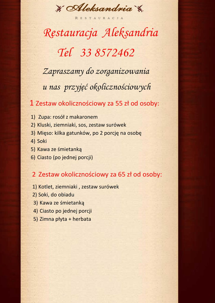 , Restauracja Aleksandria Tel 33 8572462 Zapraszamy do zorganizowania u nas przyjęć okolicznościowych 1 Zestaw okolicznościowy za 55 zł od osoby: 1) 2) 3) 4) 5) 6) Zupa: rosół z makaronem Kluski, ziemniaki, sos, zestaw surówek Mięso: kilka gatunków, po 2 porcję na osobę Soki Kawa ze śmietanką Ciasto (po jednej porcji) 2 Zestaw okolicznościowy za 65 zł od osoby: 1) Kotlet, ziemniaki , zestaw surówek 2) Soki, do obiadu 3) Kawa ze śmietanką 4) Ciasto po jednej porcji 5) Zimna płyta + herbata