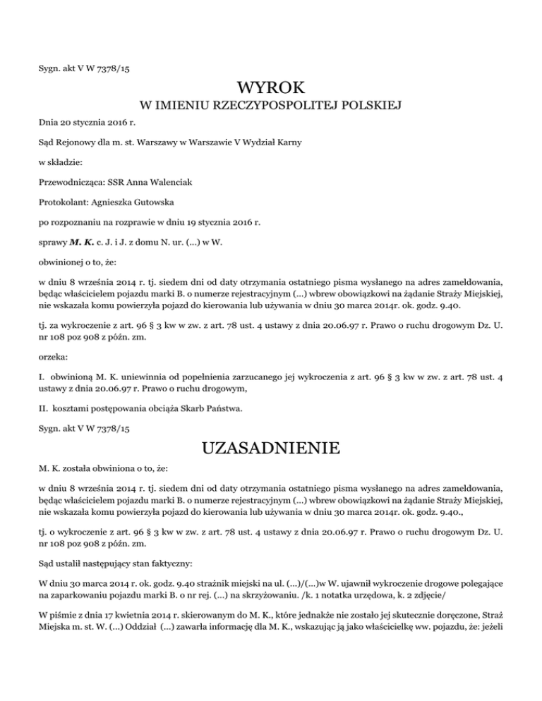 Sygn. akt V W 7378/15 WYROK W IMIENIU RZECZYPOSPOLITEJ POLSKIEJ Dnia 20 stycznia 2016 r. Sąd Rejonowy dla m. st. Warszawy w Warszawie V Wydział Karny w składzie: Przewodnicząca: SSR Anna Walenciak Protokolant: Agnieszka Gutowska po rozpoznaniu na rozprawie w dniu 19 stycznia 2016 r. sprawy M. K. c. J. i J. z domu N. ur. (...) w W. obwinionej o to, że: w dniu 8 września 2014 r. tj. siedem dni od daty otrzymania ostatniego pisma wysłanego na adres zameldowania, będąc właścicielem pojazdu marki B. o numerze rejestracyjnym (...) wbrew obowiązkowi na żądanie Straży Miejskiej, nie wskazała komu powierzyła pojazd do kierowania lub używania w dniu 30 marca 2014r. ok. godz. 9.40. tj. za wykroczenie z art. 96 § 3 kw w zw. z art. 78 ust. 4 ustawy z dnia 20.06.97 r. Prawo o ruchu drogowym Dz. U. nr 108 poz 908 z późn. zm. orzeka: I. obwinioną M. K. uniewinnia od popełnienia zarzucanego jej wykroczenia z art. 96 § 3 kw w zw. z art. 78 ust. 4 ustawy z dnia 20.06.97 r. Prawo o ruchu drogowym, II. kosztami postępowania obciąża Skarb Państwa. Sygn. akt V W 7378/15 UZASADNIENIE M. K. została obwiniona o to, że: w dniu 8 września 2014 r. tj. siedem dni od daty otrzymania ostatniego pisma wysłanego na adres zameldowania, będąc właścicielem pojazdu marki B. o numerze rejestracyjnym (...) wbrew obowiązkowi na żądanie Straży Miejskiej, nie wskazała komu powierzyła pojazd do kierowania lub używania w dniu 30 marca 2014r. ok. godz. 9.40., tj. o wykroczenie z art. 96 § 3 kw w zw. z art. 78 ust. 4 ustawy z dnia 20.06.97 r. Prawo o ruchu drogowym Dz. U. nr 108 poz 908 z późn. zm. Sąd ustalił następujący stan faktyczny: W dniu 30 marca 2014 r. ok. godz. 9.40 strażnik miejski na ul. (...)/(...)w W. ujawnił wykroczenie drogowe polegające na zaparkowaniu pojazdu marki B. o nr rej. (...) na skrzyżowaniu. /k. 1 notatka urzędowa, k. 2 zdjęcie/ W piśmie z dnia 17 kwietnia 2014 r. skierowanym do M. K., które jednakże nie zostało jej skutecznie doręczone, Straż Miejska m. st. W. (...) Oddział (...) zawarła informację dla M. K., wskazując ją jako właścicielkę ww. pojazdu, że: jeżeli to ona jest osobą, która popełniła powyższe wykroczenie, to bez konieczności osobistego stawienia się w siedzibie Straży Miejskiej, istnieje możliwość zakończenia prowadzonych czynności w sprawie o wykroczenie poprzez wyrażenie zgody na przyjęcie mandatu karnego kredytowanego w wysokości 300 zł oraz, że za stwierdzone wykroczenie zostaną przypisane punkty karne w liczbie 1. Straż Miejska zawarła informację, że mandat karny kredytowany zostanie wystawiony i przesłany po uprzednim wypełnieniu, podpisaniu i odesłaniu załączonego oświadczenia (zawartego w części A załącznika). W piśmie z dnia 17 kwietnia 2014 r. Straż Miejska zawarła informację, że w przypadku, gdyby M. K. nie była osobą, która popełniła wskazane powyżej wykroczenie, to zgodnie z art. 78 ust. 4, 5 ustawy Prawo o ruchu drogowym spoczywa na niej obowiązek wskazania, komu powierzyła pojazd do kierowania lub używania w oznaczonym czasie oraz, że osobę, której powierzyła pojazd do kierowania lub używania w oznaczonym czasie należy wskazać poprzez wypełnienie i dostarczenie Straży Miejskiej części B załącznika w terminie 7 dni od otrzymania niniejszego wezwania. Straż Miejska jednocześnie poinformowała, że w przypadku, gdy nie jest ona osobą, która popełniła powyższe wykroczenie w ruchu drogowym i nie dopełni obowiązku określonego w art. 78 ust. 4, 5 ustawy Prawo o ruchu drogowym, tj. nie wskaże komu powierzyła pojazd do kierowania lub używania w oznaczonym czasie, popełni wykroczenie określone w art. 96 § 3 Kodeksu Wykroczeń oraz że w związku z powyższym zakończenie prowadzonych czynności wyjaśniających w sprawie nastąpi poprzez wyrażenie zgody na przyjęcie mandatu karnego kredytowanego w wysokości: 400 zł i że mandat karny kredytowany zostanie wystawiony i przesłany po uprzednim wypełnieniu, podpisaniu i odesłaniu załączonego oświadczenia (zawartego w części C załącznika). Straż Miejska ponadto wskazała w piśmie, że w przypadku niewypełnienia oświadczenia Części A, B, lub C powstaje obowiązek osobistego stawienia się z dowodem osobistym i prawem jazdy do siedziby (...)Oddział (...) Straży Miejskiej m.st. W., ul. (...), (...)-(...) W., w celu złożenia wyjaśnień (art. 54 § 6 kpw) w charakterze osoby podejrzanej o popełnienie wykroczenia. Stawiennictwo jest obowiązkowe w terminie 7 dni od daty otrzymania niniejszego wezwania oraz, że wypełnione formularze należy odesłać w terminie 7 dni listownie na adres: Straż Miejska m.st. W. ul. (...), (...)-(...) W.. /k. 3 wezwanie/ Powyższe pismo z dnia 17.04.2014 r. zostało odebrane przez męża M. P. K. w dniu 23 kwietnia 2014 r. /k. 4 zwrotne potwierdzenie odbioru/, który nie przekazał go żonie. Wobec braku odpowiedzi ze strony właścicielki pojazdu, pismem z dnia 27 sierpnia 2014 r. Straż Miejska m. st. W. (...) Oddział (...) skierowała wezwanie do M. K. (w przypadku, gdyby ona była osobą, która użytkowała pojazd we wskazanym dniu 30 marca 2014r. ok. godz. 9.40), do osobistego stawiennictwa do Referatu Oskarżycieli Publicznych(...)Oddziału Terenowego Straży Miejskiej m. st. W. przy ul. (...) lok. (...)w W. w terminie 7 dni od daty otrzymania pisma w celu złożenia wyjaśnień w powyższej sprawie. W przypadku zaś, gdyby pojazd został powierzony, S. miejska w piśmie sformułowała wezwanie do podania danych osobowych kierowcy, który pojazd użytkował we wskazanym dniu i przesłania ich w terminie 7 dni na adres Straży Miejskiej m. st. W.(...)Oddział (...). /k. 5 wezwanie/ Powyższe pismo zostało odebrane przez męża M. P. K. w dniu 1 września 2014 r. /k. 6 zwrotne potwierdzenie odbioru/, który nie przekazał go żonie. Tym samym P. K. nie przekazał swojej żonie M. K. obu odebranych przez siebie i skierowanych do M. K. przez
