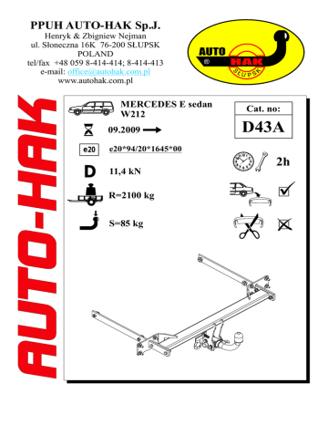 PPUH AUTO-HAK Sp.J. Henryk & Zbigniew Nejman ul. Słoneczna 16K 76-200 SŁUPSK POLAND tel/fax +48 059 8-414-414; 8-414-413 e-mail: [email protected] www.autohak.com.pl AUTO ® HAK MERCEDES E sedan W212 09.2009 e 20 D D43A e20*94/20*1645*00 11,4 kN R=2100 kg S=85 kg 2h OD PRODUCENTA: PL Dziękujemy za wybór produkowanego przez naszą firmę zaczepu kulowego. Jego niezawodność została potwierdzona licznymi testami oraz opiniami zadowolonych klientów. Jednakże niezawodność zaczepów kulowych jest zależna również od prawidłowego montażu oraz prawidłowej eksploatacji. Z tego powodu prosimy Państwa o staranne przeczytanie niniejszej instrukcji montażu oraz przestrzeganie właściwych wskazówek. Zaczep należy zamontować w miejscach do tego celu przeznaczonych przez producenta samochodu. FROM MANUFACTURER: GB Thank you for buying our product. Their reliability has been confirmed in many tests. Reliability of towbar depends also on correct assembly and right operation. For this reasons we kindly ask to read carefully this instruction and apply to hints. The towbar should be install in points described by a car producer. VON DEM HERSTELLER: D Die Zuverlässigkeit der Anhängekupplung ist jedoch auch von der ordnungsgemäßen Montage und der richtigen Nutzung abhängig. Daher werden Sie gebeten, sorgfältig die folgende Montageanleitung zu lesen und sich an die entsprechenden Anweisungen zu halten. Die Anhängekupplung muss an den vom Fahrzeughersteller vorgeschriebenen Befestigungsstellen montiert werden. DE LA PART DU FABRICANT: F Merci d'avoir choisi le dispositif d'attelage à boule produit par notre société. Son fiabilité a été confirmée dans de nombreux tests et par les opinions des clients satisfaits. Toutefois, la fiabilité des dispositifs d'attelage à boule dépend aussi d'installation et d'exploitation correcte. Pour cette raison, nous vous demandons de lire attentivement cette instruction de montage et de respecter les conseils. Le dispositif d'attelage à boule doit être monté dans des emplacements prévus a ce but par le fabricant de voiture. FRA PRODUCENTEN: DK Tak fordi De har valgt vores anhængertræk. Dets pålidelighed er blevet bekræftet i mange undersøgelser samt af tilfredse kunder. Vores anhængertræks pålidelighed er også afhængig af korrekt montering og korrekt betjening. Af denne grund beder vi Dem at læse denne instruktion grundigt og overholde de korrekte anvisninger. DE PRODUCTOR: E Gracias por la elección del enganche de bola producido por nuestra empresa. Su fiabilidad fue confirmada por numerosos testos y opiniones de los clientes quienes estuvieron contentos. Sin embargo la fiabilidad de enganche de bola depende también de un montaje adecuado y su explotación adecuada. Por esa causa por favor leer atentamente la instrucción del montaje y observar adecuadas indicadoras. VAN DE FABRIKANT: NL Bedankt voor de aanschaf van onze kogeltrekhaak. Hoe betrouwbaar die is blijkt wel uit vele tests en meningen van tevreden klanten. Toch is de betrouwbaarheid van een kogeltrekhaak er mede van afhankelijk dat deze correct gemonteerd is en op de juiste manier wordt gebruikt. Daarom wordt u verzocht deze montagehandleiding zorgvuldig te lezen en de aanwijzingen te volgen. FRA PRODUSENTEN: N Takk for at dere har valgt kulefestet produsert av vårt firma. Driftssikkerheten på kulefestet har blitt bekreftet av flere tester og tilbakemeldinger fra fornøyde kunder. Allikevel er driftssikkerheten også avhengig av en korrekt montering og riktig bruk. Derfor ber vi dere om å lese denne monteringsinstruksen nøye og anbefaler at dere følger veiledningen. ETT BUDSKAP FRÅN TILLVERKAREN: S Vi skulle vilja tacka er för ert val och inköp. Våra dragkrokars pålitlighet har bevisats av olika tester samt referenser från nöjda kunder. Man får inte glömma att dragkrokars pålitlighet beror också på rätt installation och rätt bruk. Därför skulle vi vilja be att ni läser noga denna installationsanvisning och följer alla regler och tips som den anger. Dragkroken ska installeras i ett ställe som blivit påpekade av biltillverkaren. DAL FABBRICANTE: IT -2- Vi ringraziamo per aver scelto il gancio di traino a sfera prodotto dalla nostra azienda. La sua affidabilità è stata confermata da numerosi test e dalle opinioni positive dei clienti. Tuttavia, il perfetto funzionamento dei ganci di traino a sfera dipende anche dalla correttezza del montaggio e dall'utilizzo appropriato. Per questo motivo, Vi preghiamo di leggere attentamente le presenti istruzioni di montaggio e di attenervi alle indicazioni in esse contenute. Il gancio di traino deve essere montato nei punti predisposti a tal fine dal fabbricante del veicolo. PL GB D F Należy zagwarantować przestrzeń swobodną według załącznika VII, ilustracja 30 wytycznej 94/20/WE przy dopuszczalnym ciężarze całkowitym pojazdu. The clearance specified in appendix VII, diagram 30 of guideline 94/20/EC must be guaranteed at laden weight of the vehicle. Der Freiraum nach Anhang VII,Abbildung 30 der Richtlinie94/20/EG ist zu gewährleistenbei zulässigem Gesamtgewichtdes Fahrzeuges. L’ e s p a c e l i b r e d o i t ê t r e garanticonformément à l’annexe VII,illustration 30 de la directive94/20/CE pour poids total encharge autorisé du véhicule. A-A DK I overensstemmelse med bilag VII, figur 30 til retningslinie 94/20/EF for køretøjets tilladte totalvægt skal der garanteres en friplads. E Hay que garantizar un espacio suelto según archivo adjunto VII, ilustración 30 trazado 94/20/WE de peso admisible y total del vehículo. NL N Det skal sørges for fritt rom ifølge vedlegget VII, illustrasjon 30 retningslinjen 94/20/WE ved den tillatte totale vekten av fartøyet. S Man ska garantera ett fritt tillgängligt utrymme - se bilaga VII, diagram 30 enligt riktlinjer 94/20/WE vid ett fordons maximala belastning. IT B-B De in bijlage VII afbeelding 30 van richtlijn 94/20/EU gespecificeerde vrije