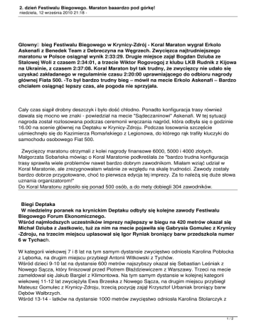 2. dzień Festiwalu Biegowego. Maraton baaardzo pod górkę! niedziela, 12 września 2010 21:18 - Głowny bieg Festiwalu Biegowego w Krynicy-Zdrój - Koral Maraton wygrał Erkolo Askenafi z Benedek Team z Debreczyna na Węgrzech. Zwycięzca najtrudniejszego maratonu w Polsce osiągnął wynik 2:33:29. Drugie miejsce zajął Bogdan Dziuba ze Stalowej Woli z czasem 2:34:01, a trzecie Wiktor Rogovogoj z klubu LKB Rudnik z Kijowa na Ukrainie, z czasem 2:37:08. Koral Maraton był tak trudny, że zwycięzcy nie udało się uzyskać zakładanego w regulaminie czasu 2:20:00 uprawniającego do odbioru nagrody głównej Fiata 500. -To był bardzo trudny bieg – mówił na mecie Erkolo Askenafi – Bardzo chciałem osiągnąć lepszy czas, ale pogoda nie sprzyjała. Cały czas siąpił drobny deszczyk i było dość chłodno. Ponadto konfiguracja trasy również dawała się mocno we znaki - powiedział na mecie "Sądeczaninowi" Askenafi. W tej sytuacji nagroda został rozlosowana podczas ceremonii wręczania nagród, która odbyła się o godzinie 16.00 na scenie głównej na Deptaku w Krynicy-Zdroju. Podczas losowania szczęście uśmiechnęło się do Kazimierza Romańskiego z Legionowa, do którego rąk trafiły kluczyki do samochodu osobowego Fiat 500. Zwycięzcy maratonu otrzymali z kolei nagrody finansowe 6000, 5000 i 4000 złotych. Małgorzata Sobańska mówiąc o Koral Maratonie podkreślała że "bardzo trudna konfiguracja trasy sprawiła wiele problemów nawet bardzo dobrym zawodnikom. Miałam wziąć udział w Koral Maratonie, ale zrezygnowałam właśnie ze względu na skalę trudności. Zawody zostały bardzo dobrze przygotowane, choć to pierwsza edycja tej imprezy. Za to należą się duże słowa uznania organizatorom!" Do Koral Maratonu zgłosiło się ponad 500 osób, a do mety dobiegli 304 zawodników. Biegi Deptaka W niedzielny poranek na krynickim Deptaku odbyły się kolejne zawody Festiwalu Biegowego Forum Ekonomicznego. Wśród najmłodszych uczestników imprezy najlepszy w biegu na 420 metrów okazał się Michał Dziuba z Jastkowic, tuż za nim na mecie pojawiła się Gabrysia Gomulec z Krynicy -Zdroju, na trzecim miejscu uplasował się Igor Ryniak broniący barw przedszkola numer 6 w Tychach. W kategorii wiekowej 7 i 8 lat na tym samym dystansie zwycięstwo odniosła Karolina Pobłocka z Lęborka, na drugim miejscu przybiegł Antonii Witkowski z Tychów. Wśród dzieci 9-10 lat na dystansie 600 metrów najszybszy okazał się Sebastian Leśniak z Nowego Sącza, który finiszował przed Piotrem Błaździewiczem z Warszawy. Trzeci na mecie zameldował się Jakub Bargiel z Klimontowa. Na tym samym dystansie w kolejnej kategorii wiekowej 11-12 lat zwyciężyła Ewa Brzeska z Nowego Sącza, na drugim miejscu przybiegł Mateusz Gomulec z Krynicy-Zdroju, trzecią pozycję zajął Krzysztof Urbaniak broniący barw Dębów Wałbrzych. Wśród 13-14 - latków na dystansie 1000 metrów zwycięstwo odniosła Karolina Stolarczyk z 1/2 2. dzień Festiwalu Biegowego. Maraton baaardzo pod górkę! niedziela, 12 września 2010 21:18 - Rabki, która wpadła na metę przed Jakubem Stankiem z Grupy Biegowej Sądeczanin i Anną Wójcik. Jędrzej Wiśniewski z Olsztyna wygrał bieg 15-16- latków na 1000 metrów. Drugie i trzecie miejsce wywalczyli reprezentanci Grupy Biegowej Sądeczanin Sebastian Dybiec i Nikodem Dakowicz. Wśród kobiet biegnących na dystansie 1000 metrów najlepsza okazała się Kamila Pobłocka z UKS EKONOMIK MARATOŃCZYK LĘBORKPOBŁOŚTEAM, na kolejnych miejscach na mecie zameldowały się kolejno Ludmiła Melicherowa i Katarzyna Smolik . Festiwalową nagrodę "Najszybsza Rodzina w Polsce" o wysokości 10 tysięcy złotych wywalczyli Stanisław, Tomasz i Marek Nocuniowie z miejscowości Borowno-Kolonia, którzy startowali w Koral Maratonie i Biegu Muszynianki. Nagrodę Specjalną Festiwalu Biegowego dla najstarszego zawodnika otrzymał 77-latek Wiesław Węgrzecki. Głównym Partnerem Festiwalu Biegowego Forum Ekonomicznego jest POLKOMTEL S.A., operator sieci PLUS. 2/2