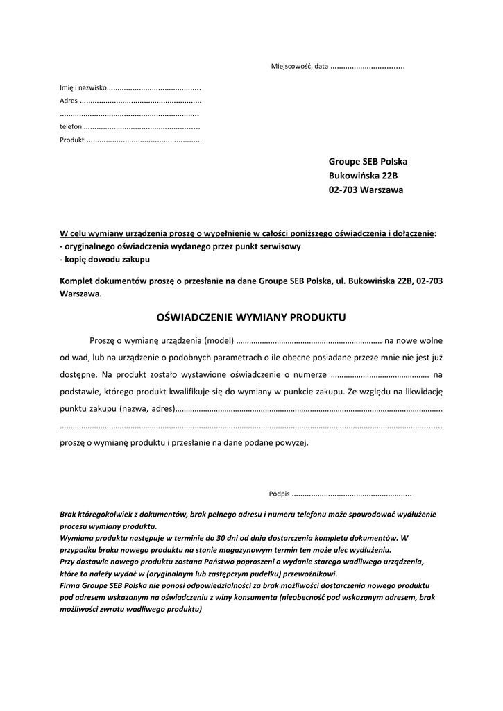 Miejscowośd, data …………………….......... Imię i nazwisko…………………………………….. Adres ………………………………………………… ……………………………………………………….. telefon …………………………………………...... Produkt ……………………………………………… Groupe SEB Polska Bukowioska 22B 02-703 Warszawa W celu wymiany urządzenia proszę o wypełnienie w całości poniższego oświadczenia i dołączenie: - oryginalnego oświadczenia wydanego przez punkt serwisowy - kopię dowodu zakupu Komplet dokumentów proszę o przesłanie na dane Groupe SEB Polska, ul. Bukowioska 22B, 02-703 Warszawa. OŚWIADCZENIE WYMIANY PRODUKTU Proszę o wymianę urządzenia (model) ………………………………………………………….. na nowe wolne od wad, lub na urządzenie o podobnych parametrach o ile obecne posiadane przeze mnie nie jest już dostępne. Na produkt zostało wystawione oświadczenie o numerze ………………………………………. na podstawie, którego produkt kwalifikuje się do wymiany w punkcie zakupu. Ze względu na likwidację punktu zakupu (nazwa, adres)…………………………………………………………………………………………………………….. ……………………………………………………………………………………………………………………….……………………………......... proszę o wymianę produktu i przesłanie na dane podane powyżej. Podpis ……………………………………………….. Brak któregokolwiek z dokumentów, brak pełnego adresu i numeru telefonu może spowodowad wydłużenie procesu wymiany produktu. Wymiana produktu następuje w terminie do 30 dni od dnia dostarczenia kompletu dokumentów. W przypadku braku nowego produktu na stanie magazynowym termin ten może ulec wydłużeniu. Przy dostawie nowego produktu zostana Paostwo poproszeni o wydanie starego wadliwego urządzenia, które to należy wydad w (oryginalnym lub zastępczym pudełku) przewoźnikowi. Firma Groupe SEB Polska nie ponosi odpowiedzialności za brak możliwości dostarczenia nowego produktu pod adresem wskazanym na oświadczeniu z winy konsumenta (nieobecnośd pod wskazanym adresem, brak możliwości zwrotu wadliwego produktu)