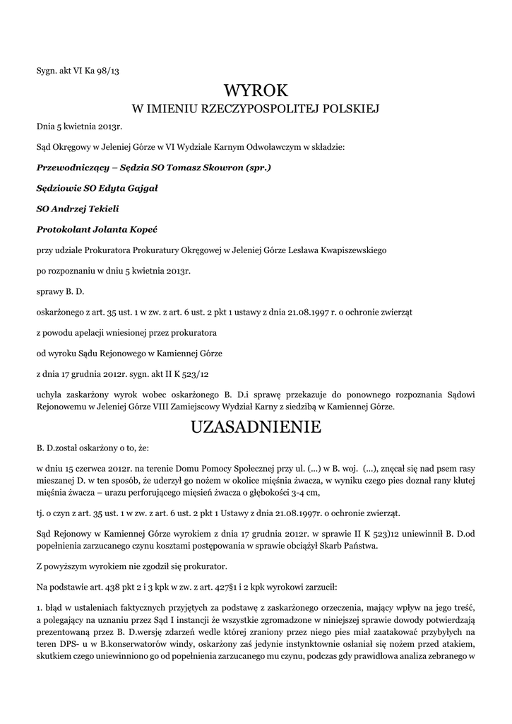 Sygn. akt VI Ka 98/13 WYROK W IMIENIU RZECZYPOSPOLITEJ POLSKIEJ Dnia 5 kwietnia 2013r. Sąd Okręgowy w Jeleniej Górze w VI Wydziale Karnym Odwoławczym w składzie: Przewodniczący – Sędzia SO Tomasz Skowron (spr.) Sędziowie SO Edyta Gajgał SO Andrzej Tekieli Protokolant Jolanta Kopeć przy udziale Prokuratora Prokuratury Okręgowej w Jeleniej Górze Lesława Kwapiszewskiego po rozpoznaniu w dniu 5 kwietnia 2013r. sprawy B. D. oskarżonego z art. 35 ust. 1 w zw. z art. 6 ust. 2 pkt 1 ustawy z dnia 21.08.1997 r. o ochronie zwierząt z powodu apelacji wniesionej przez prokuratora od wyroku Sądu Rejonowego w Kamiennej Górze z dnia 17 grudnia 2012r. sygn. akt II K 523/12 uchyla zaskarżony wyrok wobec oskarżonego B. D.i sprawę przekazuje do ponownego rozpoznania Sądowi Rejonowemu w Jeleniej Górze VIII Zamiejscowy Wydział Karny z siedzibą w Kamiennej Górze. UZASADNIENIE B. D.został oskarżony o to, że: w dniu 15 czerwca 2012r. na terenie Domu Pomocy Społecznej przy ul. (...) w B. woj. (...), znęcał się nad psem rasy mieszanej D. w ten sposób, że uderzył go nożem w okolice mięśnia żwacza, w wyniku czego pies doznał rany kłutej mięśnia żwacza – urazu perforującego mięsień żwacza o głębokości 3-4 cm, tj. o czyn z art. 35 ust. 1 w zw. z art. 6 ust. 2 pkt 1 Ustawy z dnia 21.08.1997r. o ochronie zwierząt. Sąd Rejonowy w Kamiennej Górze wyrokiem z dnia 17 grudnia 2012r. w sprawie II K 523)12 uniewinnił B. D.od popełnienia zarzucanego czynu kosztami postępowania w sprawie obciążył Skarb Państwa. Z powyższym wyrokiem nie zgodził się prokurator. Na podstawie art. 438 pkt 2 i 3 kpk w zw. z art. 427§1 i 2 kpk wyrokowi zarzucił: 1. błąd w ustaleniach faktycznych przyjętych za podstawę z zaskarżonego orzeczenia, mający wpływ na jego treść, a polegający na uznaniu przez Sąd I instancji że wszystkie zgromadzone w niniejszej sprawie dowody potwierdzają prezentowaną przez B. D.wersję zdarzeń wedle której zraniony przez niego pies miał zaatakować przybyłych na teren DPS- u w B.konserwatorów windy, oskarżony zaś jedynie instynktownie osłaniał się nożem przed atakiem, skutkiem czego uniewinniono go od popełnienia zarzucanego mu czynu, podczas gdy prawidłowa analiza zebranego w sprawie materiału dowodowego w postaci zeznań przesłuchanych świadków jak i wyjaśnień złożonych przez samego oskarżonego pozwala na przyjęcie, iż B. D.dopuścił się nieuzasadnionego, umyślnego i celowego zranienia zwierzęcia, 2. obrazę przepisów prawa procesowego – art. 7 kpk, mającą wpływ na treść wydanego wyroku, a polegającą na poczynieniu przez Sąd , wbrew zasadzie obiektywizmu, ustaleń faktycznych w oparciu o dogodny i jednostronnie korzystny dla oskarżonego materiał dowodowy, przy jednoczesnym zmarginalizowaniu dowodów przeciwnych ja tek na dokonaniu oceny przeprowadzonych dowodów w sposób dowolny, z pominięciem wskazań wiedzy i doświadczenia życiowego oraz w oparciu o oderwane od realiów sprawy hipotetyzowanie, a w konsekwencji na niezasadnym uniewinnieniu oskarżonego B. D.od zarzucanego mu czynu, podczas gdy prawidłowa analiza zebranego w sprawie materiału dowodowego prowadzi do wniosku przeciwnego. Podnosząc powyższe zarzuty prokurator wniósł o uchylenie zaskarżonego wyroku Sądu rejonowego w Kamiennej Górze i przekazanie niniejszej sprawy do ponownego rozpoznania Sądowi Rejonowemu w Jeleniej Górze VIII Zamiejscowemu Wydziałowi Karnemu w Kamiennej Górze. Sąd Okręgowy zważył, co następuje: Apelacja prokuratora okazała się być zasadna. Jej wniesienie doprowadziło bowiem do uchylenia zaskarżonego wyroku i przekazania sprawy Sądowi Rejonowemu w Jeleniej Górze Wydziałowi Zamiejscowemu z siedzibą w Kamiennej Górze do ponownego rozpoznania. Rację ma oskarżyciel publiczny, gdy zarzuca w apelacji obrazę prawa procesowego, tj. art. 7 k.p.k., a w konsekwencji błędy w ustaleniach faktycznych, które miały wpływ na treść zapadłego rozstrzygnięcia. Zapoznając się z lekturą pisemnych motywów skarżonego orzeczenia i konfrontując wnioski i ustalenia, jakich dokonał Sąd Rejonowy z treścią zgromadzonych dowodów, nasuwa się bowiem konkluzja o przekroczeniu przez ów Sąd uprawnień wynikających ze wskazanego przepisu. Zdaniem Sądu II instancji, Sąd orzekający poddając weryfikacji całokształt zebranego w sprawie materiału dowodowego nie respektował, zgodnie z unormowaniem art. 7 k.p.k., reguł prawidłowego rozumowania, co czyni ocenę dowodów przedstawioną przez tenże Sąd za rażąco sprzeczną z regułą wyżej powołanego przepisu. W takiej sytuacji ocena dowodów, jakiej w poddanym krytyce przez autora apelacji rozstrzygnięciu dokonał Sąd meriti nie może być uznana za niepodważalną, skoro charakteryzuje się ona dowolnością (nie pozostając zatem oceną swobodną) i nie odpowiada kanonom określonym we wskazanym już wyżej art. 7 k.p.k., którego Sąd I instancji dopuścił się obrazy i to – co raz jeszcze należy powtórzyć – w stopniu rażącym. Innymi słowy, o tym, czy rozstrzygnięcie zapadłe w Sądzie pierwszej instancji jest słuszne decyduje między innymi to, aby Sąd II instancji, który na skutek wniesionej apelacji i kontroli instancyjnej, zapoznając się z zebranym w sprawie materiałem dowodowym oraz pisemnymi motywami skarżonego wyroku nabrał – w kontekście zarzutów postawionych przez autora apelacji – kategorycznego przekonania, iż ustalenia faktyczne, które zdecydowały o przypisaniu (bądź nie) sprawstwa i winy osoby postawionej w stan oskarżenia wynikają z niepodważalnej oceny dowodów. Tymczasem w realiach niniejszej sprawy, błędy, które uwypuklił w apelacji oskarżyciel publiczny, które dostrzega Sąd Okręgowy, a jakich dopuścił się Sąd Rejonowy przy ustalaniu prawdy materialnej i rekonstrukcji stanu faktycznego, świadczą o naruszeniu standardów wynikających z zasad swobodnej oceny dowodów, unor
