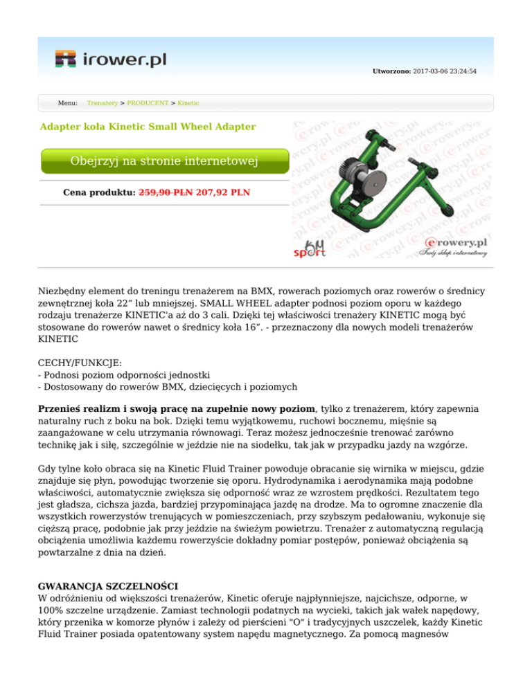 Utworzono: 2017-03-06 23:24:54 Menu: Trenażery > PRODUCENT > Kinetic Adapter koła Kinetic Small Wheel Adapter Obejrzyj na stronie internetowej Cena produktu: 259,90 PLN 207,92 PLN Niezbędny element do treningu trenażerem na BMX, rowerach poziomych oraz rowerów o średnicy zewnętrznej koła 22” lub mniejszej. SMALL WHEEL adapter podnosi poziom oporu w każdego rodzaju trenażerze KINETIC'a aż do 3 cali. Dzięki tej właściwości trenażery KINETIC mogą być stosowane do rowerów nawet o średnicy koła 16”. - przeznaczony dla nowych modeli trenażerów KINETIC CECHY/FUNKCJE: - Podnosi poziom odporności jednostki - Dostosowany do rowerów BMX, dziecięcych i poziomych Przenieś realizm i swoją pracę na zupełnie nowy poziom, tylko z trenażerem, który zapewnia naturalny ruch z boku na bok. Dzięki temu wyjątkowemu, ruchowi bocznemu, mięśnie są zaangażowane w celu utrzymania równowagi. Teraz możesz jednocześnie trenować zarówno technikę jak i siłę, szczególnie w jeździe nie na siodełku, tak jak w przypadku jazdy na wzgórze. Gdy tylne koło obraca się na Kinetic Fluid Trainer powoduje obracanie się wirnika w miejscu, gdzie znajduje się płyn, powodując tworzenie się oporu. Hydrodynamika i aerodynamika mają podobne właściwości, automatycznie zwiększa się odporność wraz ze wzrostem prędkości. Rezultatem tego jest gładsza, cichsza jazda, bardziej przypominająca jazdę na drodze. Ma to ogromne znaczenie dla wszystkich rowerzystów trenujących w pomieszczeniach, przy szybszym pedałowaniu, wykonuje się cięższą pracę, podobnie jak przy jeździe na świeżym powietrzu. Trenażer z automatyczną regulacją obciążenia umożliwia każdemu rowerzyście dokładny pomiar postępów, ponieważ obciążenia są powtarzalne z dnia na dzień. GWARANCJA SZCZELNOŚCI W odróżnieniu od większości trenażerów, Kinetic oferuje najpłynniejsze, najcichsze, odporne, w 100% szczelne urządzenie. Zamiast technologii podatnych na wycieki, takich jak wałek napędowy, który przenika w komorze płynów i zależy od pierścieni "O" i tradycyjnych uszczelek, każdy Kinetic Fluid Trainer posiada opatentowany system napędu magnetycznego. Za pomocą magnesów neodymowych całkowicie została wyeliminowana fizyczna zależność wałka napędowego od komory płynu , "O" pierścieni i uszczelek, które się zużywają i powodują nieszczelności. NAJLEPSZA GWARANCJA Trenażery Kinetic są solidnie zbudowane, dlatego każdy trenażer posiada dożywotnią gwarancję. Zasada bezwarunkowej gwarancji Kinetic jest prosta: Jeśli uszkodzisz swój trenażer, Kinetic naprawi lub wymieni go na taki długi okres czasu, jaki jesteś jego właścicielem. Nawet przypadkowe uszkodzenia są objęte programem wymiany. NAJWIĘKSZE KOŁO ZAMACHOWE Kinetic Fluid Trainer są wyposażone w koła zamachowe najcięższe z wszystkich dostępnych (od stałych - 2 kg do masowych - 8,2 kg). Efektem tego jest bardzo gładka jazda, zbliżona do jazdy po ulicy, bez zmiany krzywej mocy. Więc każde przyspieszenie zapewnia doświadczenie porównywalne do jazdy na zewnątrz. NAJLEPSZA STABILNOŚĆ Dzięki trapezowej konstrukcji nogi i największemu rozstawowi stopy jakiegokolwiek trenażera, Kinetic Fluid Trainer zachowuje całą moc, przekazując ją na koło zamachowe. Więc nawet w trudnych warunkach, pedałując, a nie siedząc na siodle, jazda na Kinetic Fluid Trainer pozostaje stabilna. INNOWACYJNOŚĆ MARKI Kinetic jest jedynym trenażerem, dopuszczonym do użytku przy tandemach. Kinetic Trainer są w pełni kompatybilne z kołami o średnicy od 16"do 29", w tym rowery z "flip-off" i stylizowane na BMX. NAJNIŻSZA OPERACYJNA TEMPERATURA Zgodnie z prawami fizyki, energia nie jest tracona ani uzyskiwana, lecz po prostu zmienia się jej forma. W przypadku trenażera energia wirowania wirnika wewnątrz komory z płynem, przekształca się w ciepło. W Kinetic Fluid Trainer zostało zaprojektowanych 80 aluminiowych żeberek, aby rozproszyć ciepło i zapewnić najniższą temperaturę pracy każdego trenażera. TERMODYNAMICZNIE NEUTRALNY W odróżnieniu od płynów stosowanych w innych trenażerach, które tracą odporność, gdy płyn jest podgrzewany, w Kinetic Fluid Trainer zostały użyte termodynamiczne neutralne ciecze krzemowe, w celu zapewnienia spójnej, wymiernej i powtarzalnej pracy we wszystkich temperaturach. Producent Rodzaj Adres: www.erowery.pl [email protected] Adres: www.irower.pl Kinetic Akcesoria Telefon: 605 515 185, 34 361 16 71 Email: [email protected] Email: