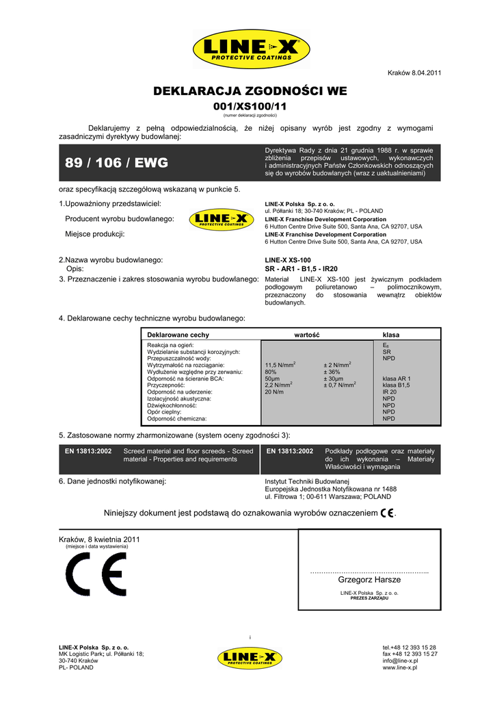 Kraków 8.04.2011 DEKLARACJA ZGODNOŚCI WE 001/XS100/11 (numer deklaracji zgodności) Deklarujemy z pełną odpowiedzialnością, że niżej opisany wyrób jest zgodny z wymogami zasadniczymi dyrektywy budowlanej: Dyrektywa Rady z dnia 21 grudnia 1988 r. w sprawie zbliżenia przepisów ustawowych, wykonawczych i administracyjnych Państw Członkowskich odnoszących się do wyrobów budowlanych (wraz z uaktualnieniami) 89 / 106 / EWG oraz specyfikacją szczegółową wskazaną w punkcie 5. 1.Upoważniony przedstawiciel: LINE-X Polska Sp. z o. o. ul. Półłanki 18; 30-740 Kraków; PL - POLAND LINE-X Franchise Development Corporation 6 Hutton Centre Drive Suite 500, Santa Ana, CA 92707, USA LINE-X Franchise Development Corporation 6 Hutton Centre Drive Suite 500, Santa Ana, CA 92707, USA Producent wyrobu budowlanego: Miejsce produkcji: 2.Nazwa wyrobu budowlanego: LINE-X XS-100 Opis: SR - AR1 - B1,5 - IR20 3. Przeznaczenie i zakres stosowania wyrobu budowlanego: Materiał LINE-X XS-100 jest żywicznym podkładem podłogowym przeznaczony budowlanych. poliuretanowo – polimocznikowym, do stosowania wewnątrz obiektów 4. Deklarowane cechy techniczne wyrobu budowlanego: Deklarowane cechy wartość Reakcja na ogień: Wydzielanie substancji korozyjnych: Przepuszczalność wody: Wytrzymałość na rozciąganie: Wydłużenie względne przy zerwaniu: Odporność na ścieranie BCA: Przyczepność: Odporność na uderzenie: Izolacyjność akustyczna: Dźwiękochłonność: Opór cieplny: Odporność chemiczna: 11,5 N/mm2 80% 50µm 2,2 N/mm2 20 N/m klasa ± 2 N/mm2 ± 36% ± 30µm ± 0,7 N/mm2 Efl SR NPD klasa AR 1 klasa B1,5 IR 20 NPD NPD NPD NPD 5. Zastosowane normy zharmonizowane (system oceny zgodności 3): EN 13813:2002 Screed material and floor screeds - Screed material - Properties and requirements 6. Dane jednostki notyfikowanej: EN 13813:2002 Podkłady podłogowe oraz materiały do ich wykonania – Materiały Właściwości i wymagania Instytut Techniki Budowlanej Europejska Jednostka Notyfikowana nr 1488 ul. Filtrowa 1; 00-611 Warszawa; POLAND Niniejszy dokument jest podstawą do oznakowania wyrobów oznaczeniem . Kraków, 8 kwietnia 2011 (miejsce i data wystawienia) ……………………………………………... Grzegorz Harsze LINE-X Polska Sp. z o. o. PREZES ZARZĄDU i LINE-X Polska Sp. z o. o. MK Logistic Park; ul. Półłanki 18; 30-740 Kraków PL- POLAND tel.+48 12 393 15 28 fax +48 12 393 15 27 [email protected] www.line-x.pl Kraków 8.04.2011 Producent: LINE-X Franchise Development Corporation 6 Hutton Centre Drive Suite 500, Santa Ana, CA 92707, USA Upoważniony przedstawiciel: LINE-X Polska Sp. z o. o. ul. Półłanki 18; 30-740 Kraków; PL - POLAND 11 EN 13813 SR - AR1 - B1,5 - IR20 Materiał LINE-X XS-100 jest żywicznym podkładem podłogowym poliuretanowo – polimocznikowym przeznaczony do stosowania wewnątrz obiektów budowlanych. Reakcja na ogień: Wydzielanie substancji korozyjnych: Przepuszczalność wody: Wytrzymałość na rozciąganie: Wydłużenie względne przy zerwaniu: Odporność na ścieranie BCA: Przyczepność: Odporność na uderzenie: Izolacyjność akustyczna: Dźwiękochłonność: Opór cieplny: Odporność chemiczna: LINE-X Polska Sp. z o. o. MK Logistic Park; ul. Półłanki 18; 30-740 Kraków PL- POLAND Efl SR NPD 11,5 N/mm2 ± 2 N/mm2 80% ± 36% klasa AR 1 klasa B1,5 IR 20 NPD NPD NPD NPD tel.+48 12 393 15 28 fax +48 12 393 15 27 [email protected] www.line-x.pl