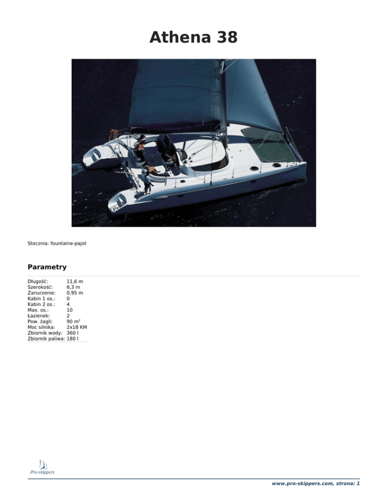 Athena 38 Stocznia: fountaine-pajot Parametry Długość: 11,6 m Szerokość: 6,3 m Zanurzenie: 0,95 m Kabin 1 os.: 0 Kabin 2 os.: 4 Max. os.: 10 Łazienek: 2 Pow. żagli: 90 m2 Moc silnika: 2x18 KM Zbiornik wody: 360 l Zbiornik paliwa: 180 l www.pro-skippers.com, strona: 1 www.pro-skippers.com, strona: 2 www.pro-skippers.com, strona: 3