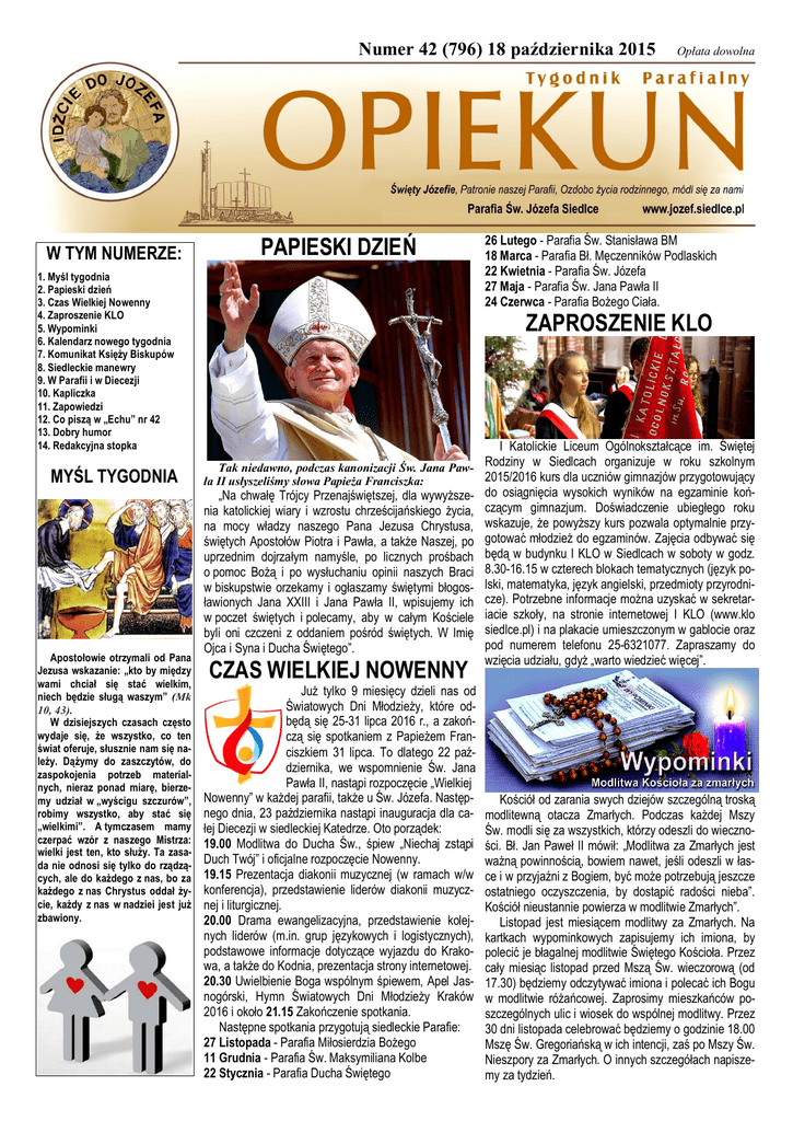 Numer 42 (796) 18 października 2015 W TYM NUMERZE: PAPIESKI DZIEŃ 1. Myśl tygodnia 2. Papieski dzień 3. Czas Wielkiej Nowenny 4. Zaproszenie KLO 5. Wypominki 6. Kalendarz nowego tygodnia 7. Komunikat Księży Biskupów 8. Siedleckie manewry 9. W Parafii i w Diecezji 10. Kapliczka 11. Zapowiedzi 12. Co piszą w „Echu” nr 42 13. Dobry humor 14. Redakcyjna stopka MYŚL TYGODNIA Apostołowie otrzymali od Pana Jezusa wskazanie: „kto by między wami chciał się stać wielkim, niech będzie sługą waszym” (Mk 10, 43). W dzisiejszych czasach często wydaje się, że wszystko, co ten świat oferuje, słusznie nam się należy. Dążymy do zaszczytów, do zaspokojenia potrzeb materialnych, nieraz ponad miarę, bierzemy udział w „wyścigu szczurów”, robimy wszystko, aby stać się „wielkimi”. A tymczasem mamy czerpać wzór z naszego Mistrza: wielki jest ten, kto służy. Ta zasada nie odnosi się tylko do rządzących, ale do każdego z nas, bo za każdego z nas Chrystus oddał życie, każdy z nas w nadziei jest już zbawiony. Opłata dowolna 26 Lutego - Parafia Św. Stanisława BM 18 Marca - Parafia Bł. Męczenników Podlaskich 22 Kwietnia - Parafia Św. Józefa 27 Maja - Parafia Św. Jana Pawła II 24 Czerwca - Parafia Bożego Ciała. ZAPROSZENIE KLO Tak niedawno, podczas kanonizacji Św. Jana Pawła II usłyszeliśmy słowa Papieża Franciszka: „Na chwałę Trójcy Przenajświętszej, dla wywyższenia katolickiej wiary i wzrostu chrześcijańskiego życia, na mocy władzy naszego Pana Jezusa Chrystusa, świętych Apostołów Piotra i Pawła, a także Naszej, po uprzednim dojrzałym namyśle, po licznych prośbach o pomoc Bożą i po wysłuchaniu opinii naszych Braci w biskupstwie orzekamy i ogłaszamy świętymi błogosławionych Jana XXIII i Jana Pawła II, wpisujemy ich w poczet świętych i polecamy, aby w całym Kościele byli oni czczeni z oddaniem pośród świętych. W Imię Ojca i Syna i Ducha Świętego”. CZAS WIELKIEJ NOWENNY Już tylko 9 miesięcy dzieli nas od Światowych Dni Młodzieży, które odbędą się 25-31 lipca 2016 r., a zakończą się spotkaniem z Papieżem Franciszkiem 31 lipca. To dlatego 22 października, we wspomnienie Św. Jana Pawła II, nastąpi rozpoczęcie „Wielkiej Nowenny” w każdej parafii, także u Św. Józefa. Następnego dnia, 23 października nastąpi inauguracja dla całej Diecezji w siedleckiej Katedrze. Oto porządek: 19.00 Modlitwa do Ducha Św., śpiew „Niechaj zstąpi Duch Twój” i oficjalne rozpoczęcie Nowenny. 19.15 Prezentacja diakonii muzycznej (w ramach w/w konferencja), przedstawienie liderów diakonii muzycznej i liturgicznej. 20.00 Drama ewangelizacyjna, przedstawienie kolejnych liderów (m.in. grup językowych i logistycznych), podstawowe informacje dotyczące wyjazdu do Krakowa, a także do Kodnia, prezentacja strony internetowej. 20.30 Uwielbienie Boga wspólnym śpiewem, Apel Jasnogórski, Hymn Światowych Dni Młodzieży Kraków 2016 i około 21.15 Zakończenie spotkania. Następne spotkania przygotują siedleckie Parafie: 27 Listopada - Parafia Miłosierdzia Bożego 11 Grudnia - Parafia Św. Maksymiliana Kolbe 22 Stycznia - Parafia Ducha Świętego I Katolickie Liceum Ogólnokształcące im. Świętej Rodziny w Siedlcach organizuje w roku szkolnym 2015/2016 kurs dla uczniów gimnazjów przygotowujący do osiągnięcia wysokich wyników na egzaminie kończącym gimnazjum. Doświadczenie ubiegłego roku wskazuje, że powyższy kurs pozwala optymalnie przygotować młodzież do egzaminów. Zajęcia odbywać się będą w budynku I KLO w Siedlcach w soboty w godz. 8.30-16.15 w czterech blokach tematycznych (język polski, matematyka, język angielski, przedmioty przyrodnicze). Potrzebne informacje można uzyskać w sekretariacie szkoły, na stronie internetowej I KLO (www.klo siedlce.pl) i na plakacie umieszczonym w gablocie oraz pod numerem telefonu 25-6321077. Zapraszamy do wzięcia udziału, gdyż „warto wiedzieć więcej”. Kościół od zarania swych dziejów szczególną troską modlitewną otacza Zmarłych. Podczas każdej Mszy Św. modli się za wszystkich, którzy odeszli do wieczności. Bł. Jan Paweł II mówił: „Modlitwa za Zmarłych jest ważną powinnością, bowiem nawet, jeśli odeszli w łasce i w przyjaźni z Bogiem, być może potrzebują jeszcze ostatniego oczyszczenia, by dostąpić radości nieba”. Kościół nieustannie powierza w modlitwie Zmarłych”. Listopad jest miesiącem modlitwy za Zmarłych. Na kartkach wypominkowych zapisujemy ich imiona, by polecić je błagalnej modlitwie Świętego Kościoła. Przez cały miesiąc listopad przed Mszą Św. wieczorową (od 17.30) będziemy odczytywać imiona i polecać ich Bogu w modlitwie różańcowej. Zaprosimy mieszkańców poszczególnych ulic i wiosek do wspólnej modlitwy. Przez 30 dni listopada celebrować będziemy o godzinie 18.00 Mszę Św. Gregoriańską w ich intencji, zaś po Mszy Św. Nieszpory za Zmarłych. O innych szczegółach napiszemy za tydzień. STRONA 2 OPIEKUN NR 42 18 PAŹDZIERNIKA 2015 R KALENDARZ PARAFIALNY W przypadku zauważenia błędów, które mogły powstać podczas przepisywania intencji Mszy św., serdecznie prosimy o ich zgłoszenie w celu poprawienia. Kościół św. Józefa jest otwierany na pół godziny przed każdą Mszą Św. Poniedziałek – 19 października 2015 r. Wspomnienie Kapłanów Bł. Ks. Jerzego Popiełuszko, Męczennika oraz Św. Męczenników Jana Brebeuf, Izaaka Joguesa, ich Towarzyszy, a także Św. Pawła od Krzyża. Tydzień Misyjny (2). Czyt.: Rz 4, 20-25 (Wiara Abrahama); Łk 12, 13-21 (Gromadzić skarby przed Bogiem). 6.30 1. + Dusze w czyśćcu cierpiące, które najbardziej potrzebują miłosierdzia, of. Bezimienna 7.00 1. Gregorianka: + Henryka Pyziołka, of. Żona 2. Gregorianka: + Ks. Henryka Wetoszkę 3. + Wacława (w 19 r.), Józefa i Stanisława Maliszkiewiczów, of. Brat 4. + Mariana (w 17 r.), Adama, Pawła i Kazimierza, of. Córka 8.30 Dziękczynna 